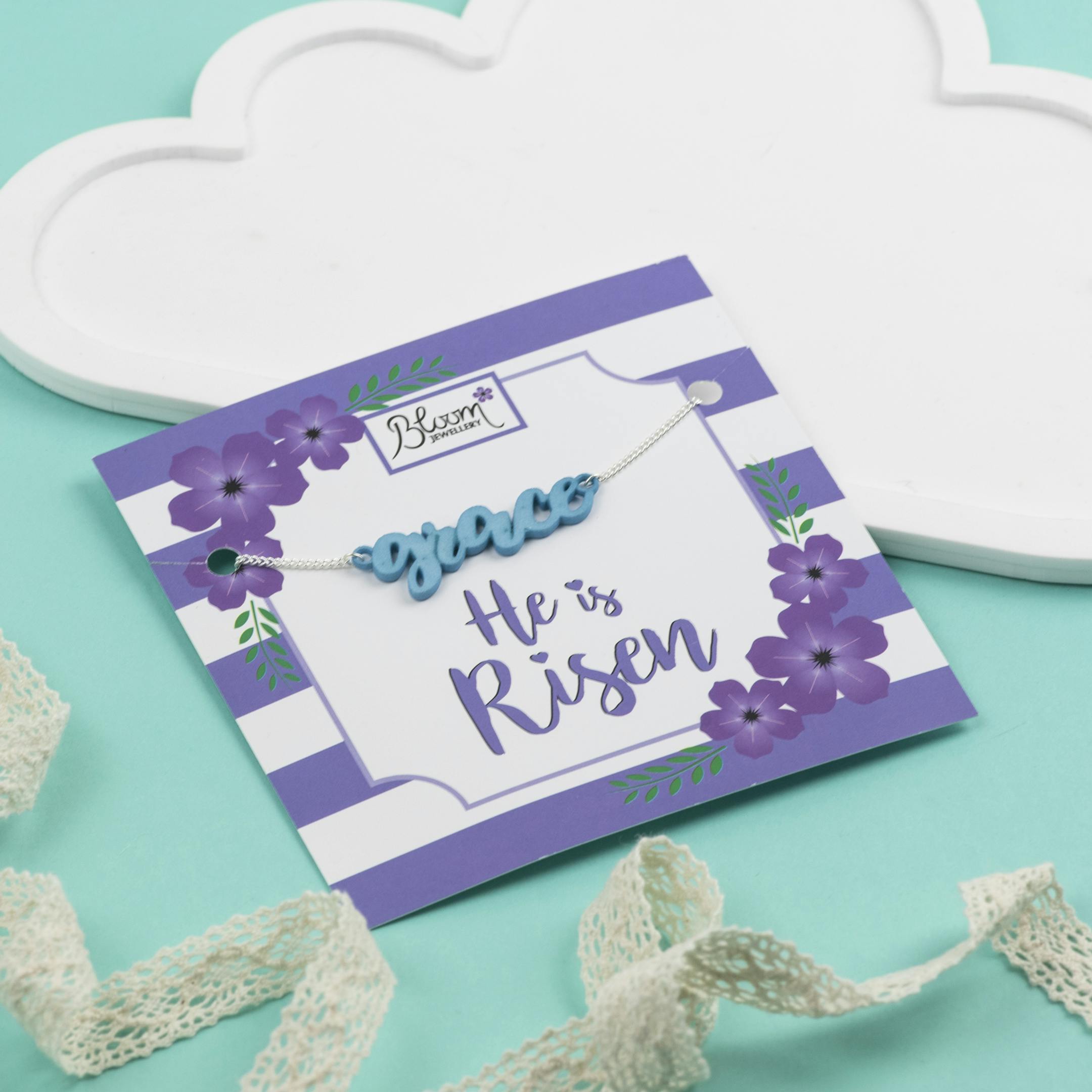 Each pendant is presented on a Bloom Scripture card and sealed in a cellophane bag.