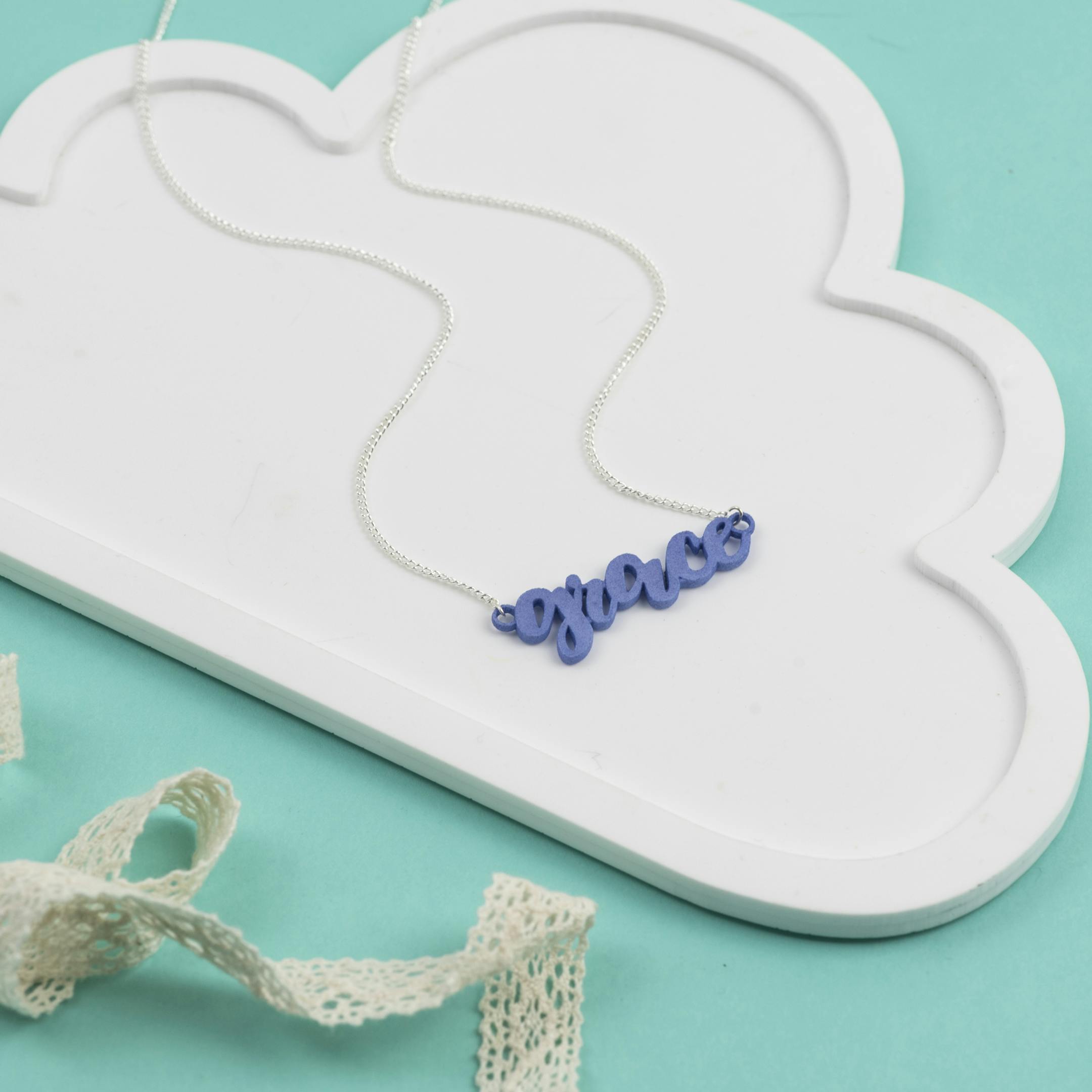 Our Grace pendants are designed in CAD using rhino software and printed in 3D using nylon. Our pendants are then hand dyed using fabric dyes to achieve a bright pastel colour, available in Pink, Lilac and Blue.