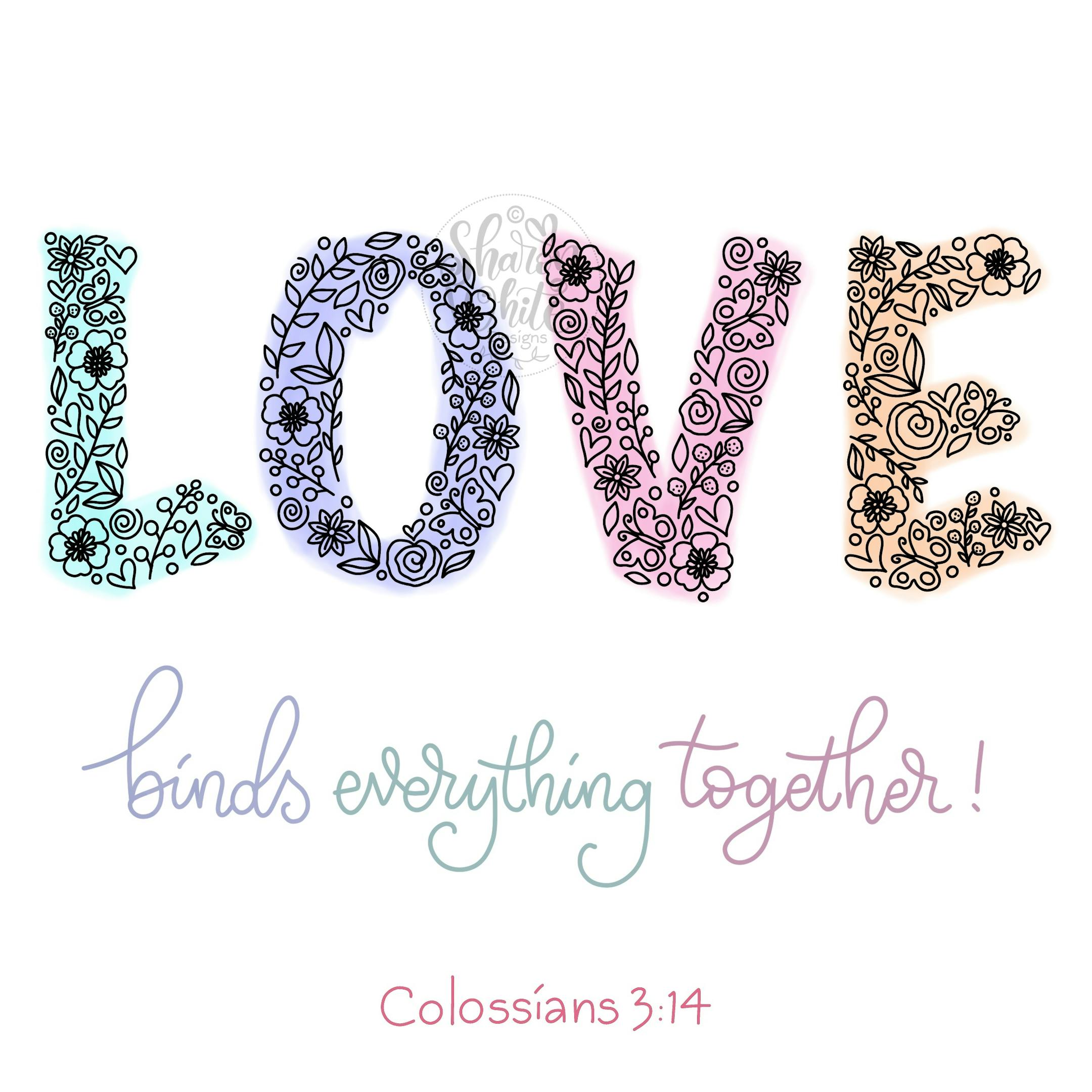 Intricate hand drawn flowers, hearts and butterflies have been woven into the shape of the word ‘love’. Print inspired by the Bible verse in Colossians 3:14. A beautiful reminder that we should show love through everything we do as that is what binds everything together!
