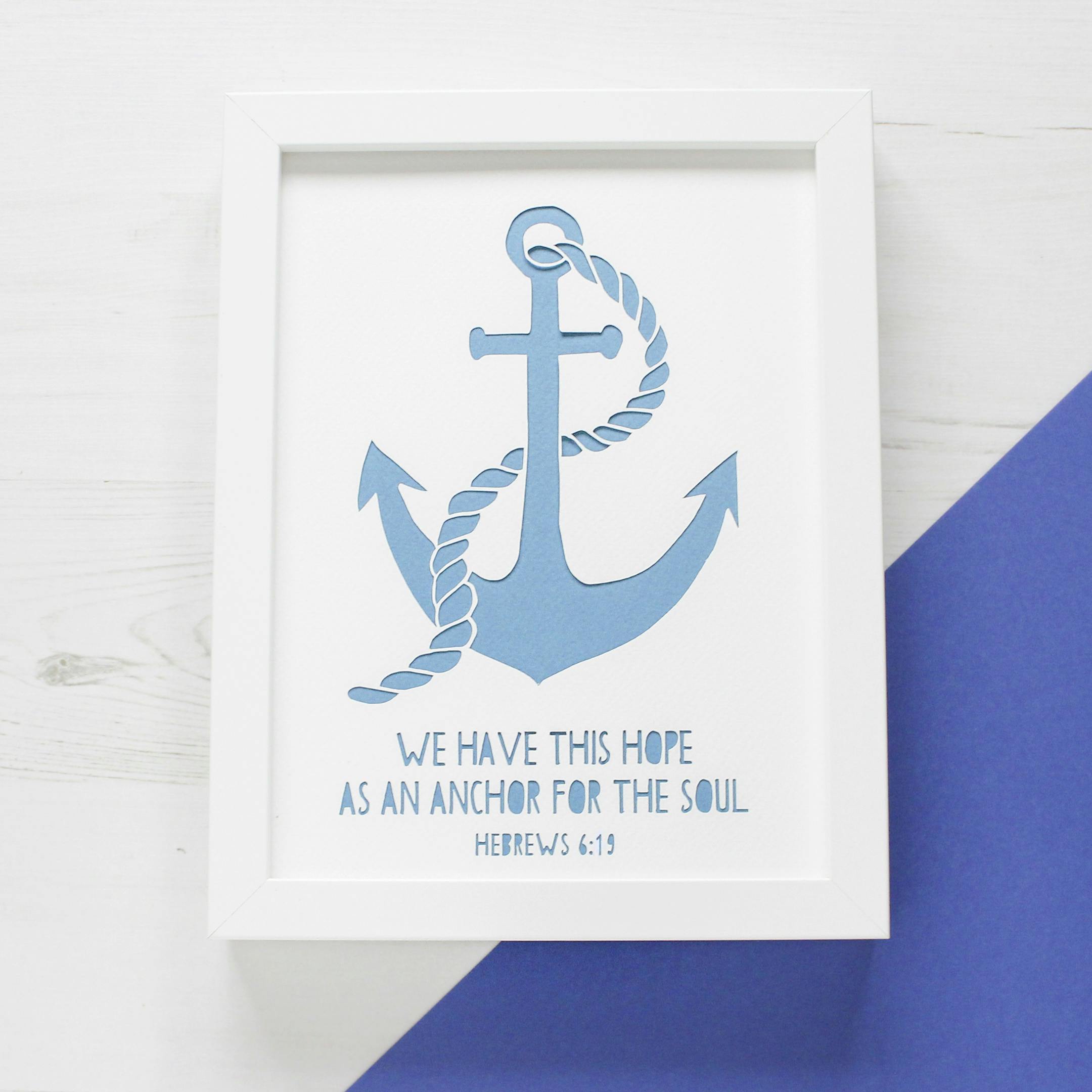 This beautifully crafted original 'Anchor For My Soul' Paper cut makes an encouraging christian gift and is a special touch to any seaside themed room. The papercut includes the bible verse Hebrews 6:19 underneath the anchor design.
