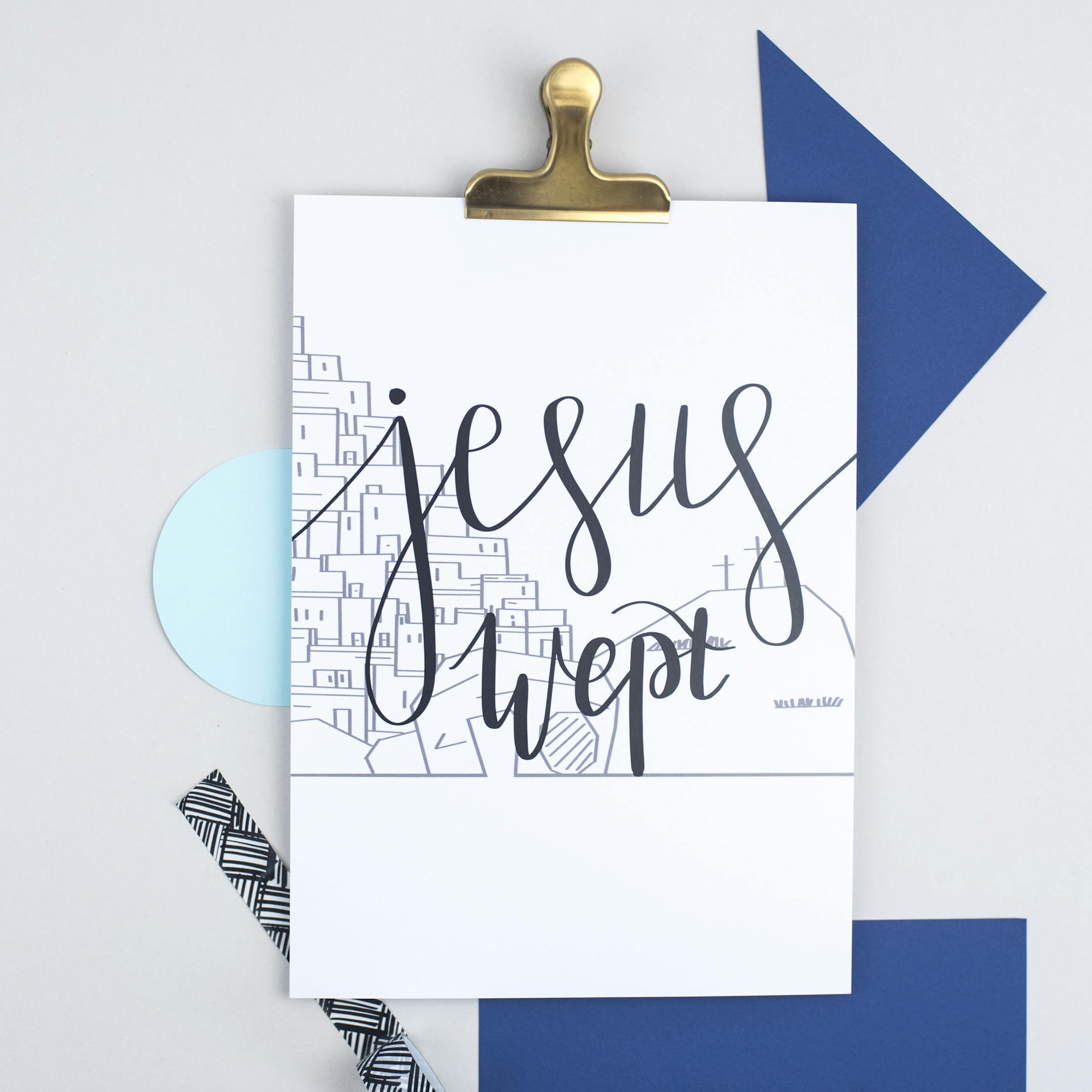This A4 Jesus Wept print has a illustrated background of Jerusalem with the three crosses and tomb, and would be perfect to gift to someone going through a hard