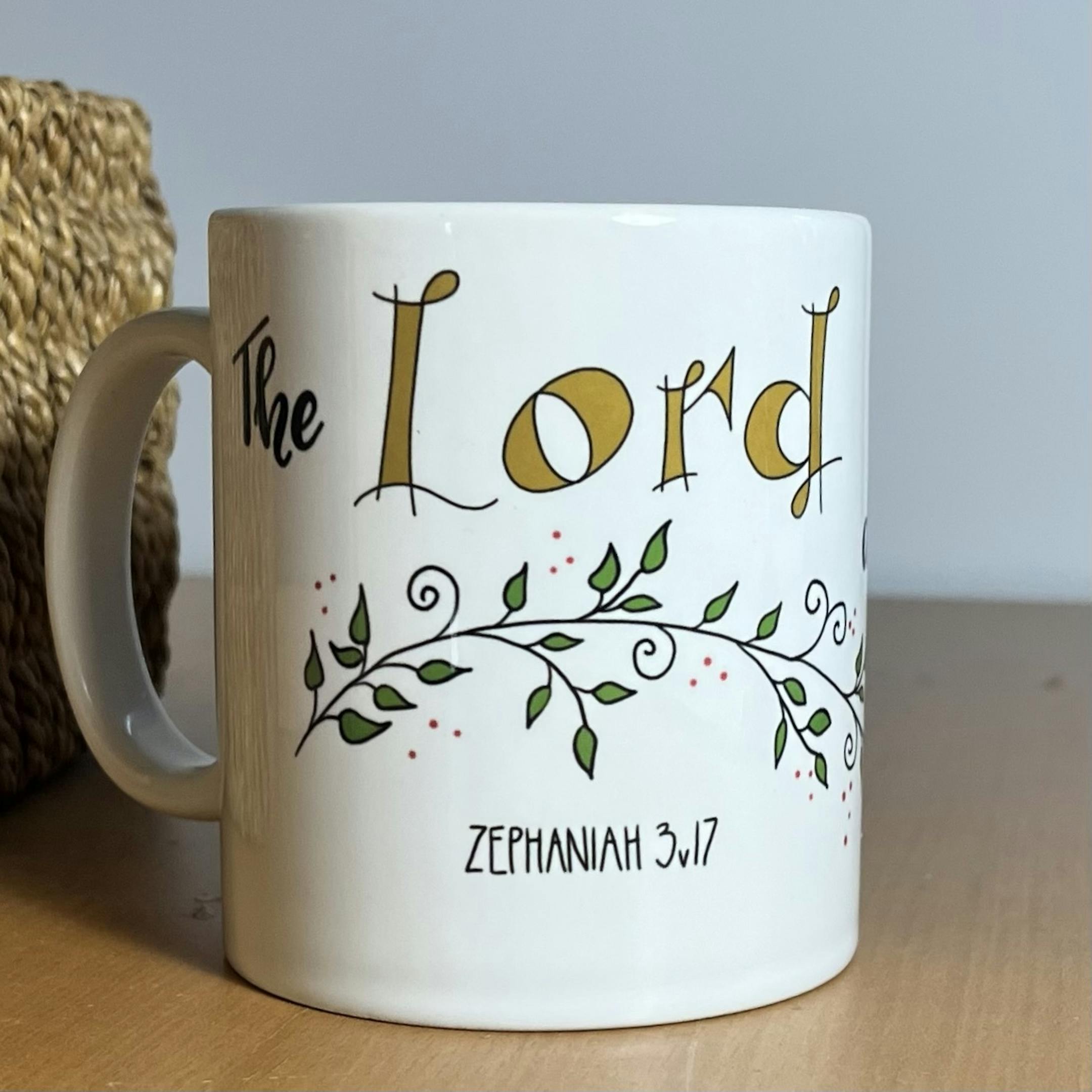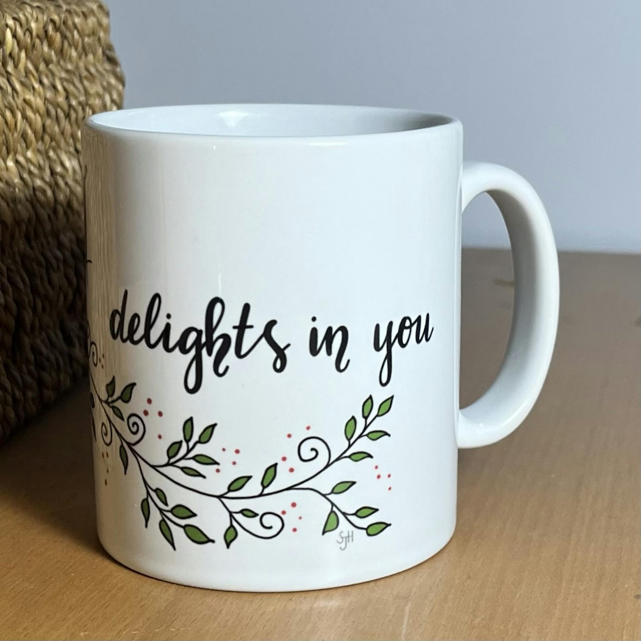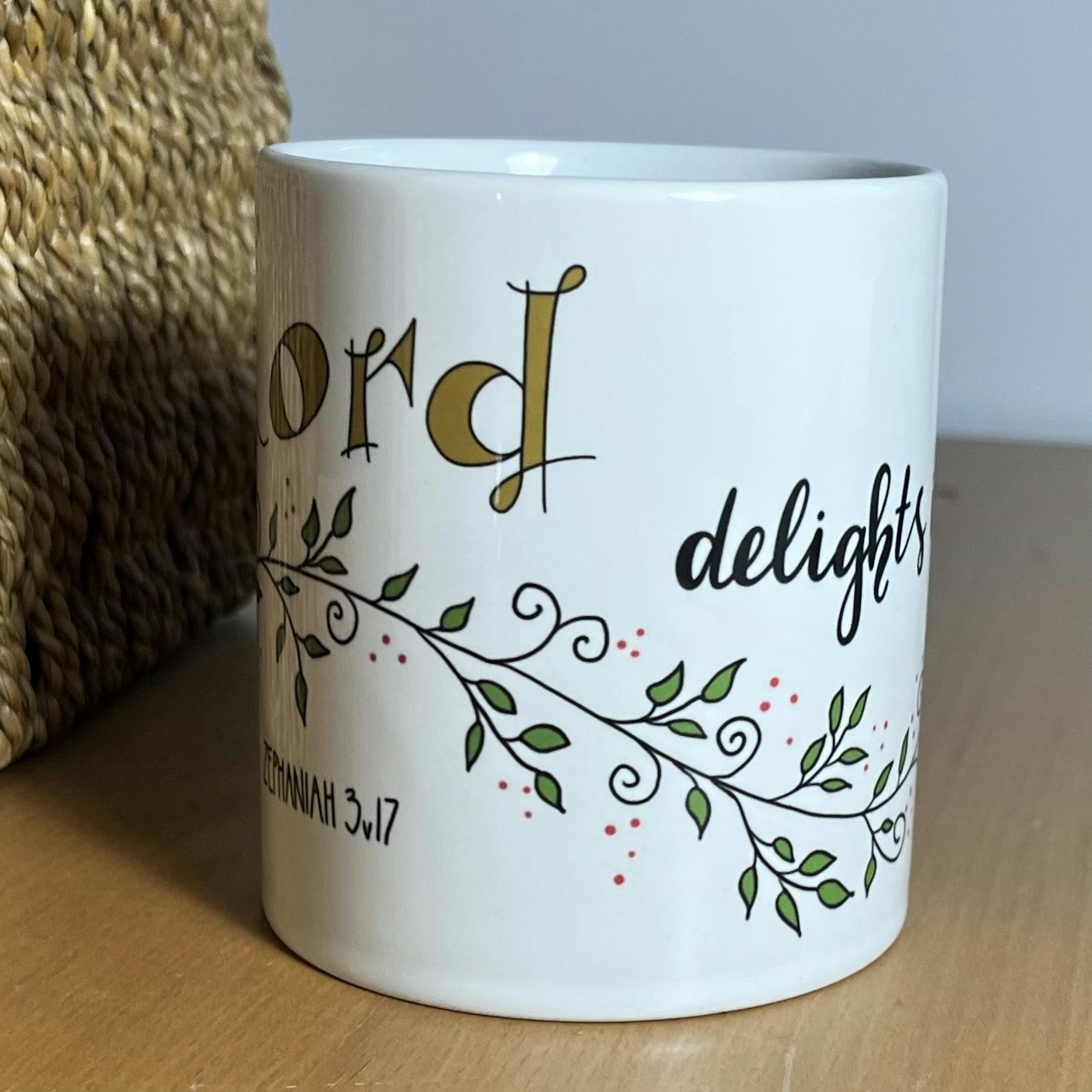 A lovely scripture mug featuring the hand-lettered blessing from Zephaniah 3:17 'The Lord delights in you.'