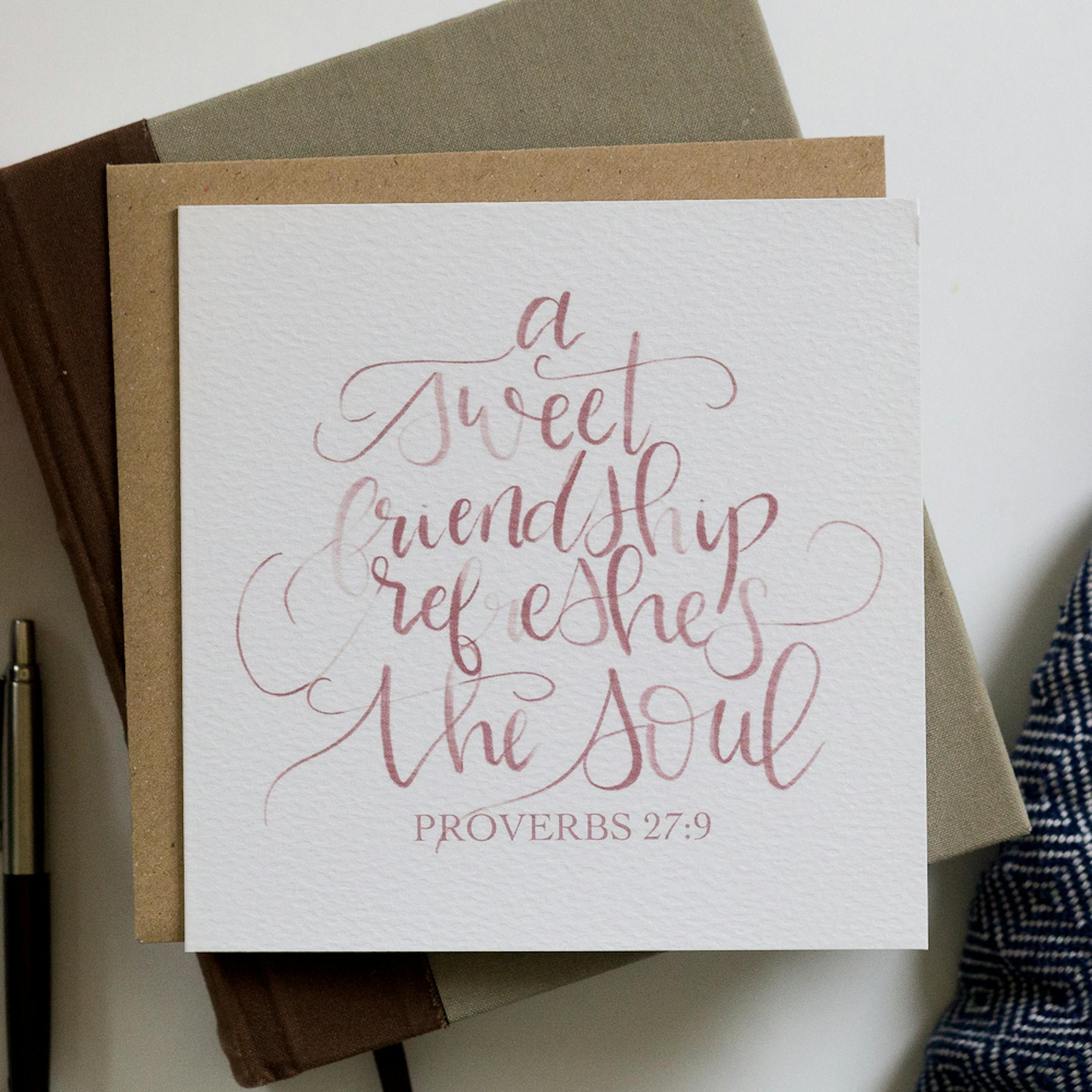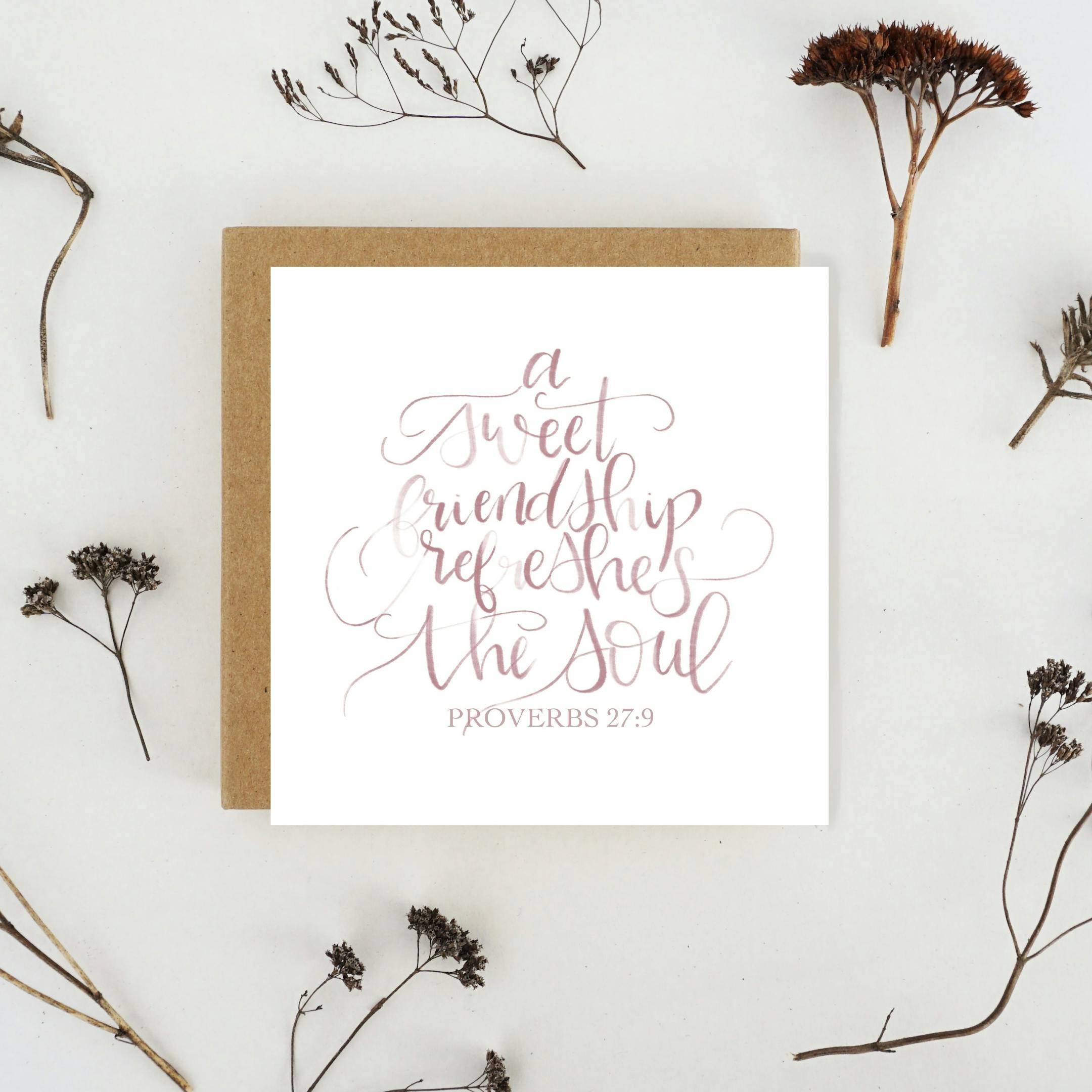 This is a luxury 15x15cm square card with watercolour modern calligraphy lettering of the verse Proverbs 27:9 on the front in dusty pink, making it a muted, feminine card.