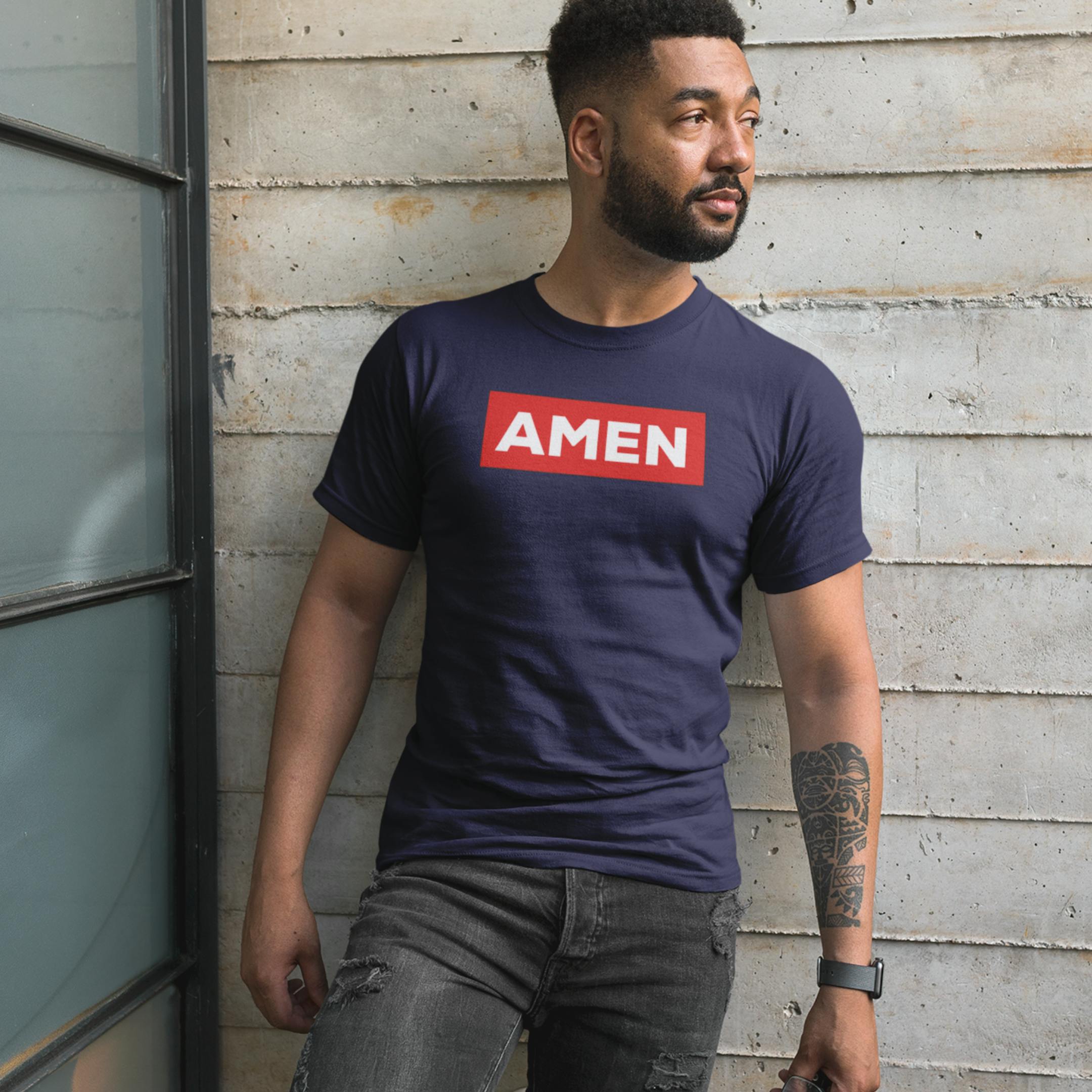 AMEN Men's Navy T Shirt - Navy crew neck, soft t-shirt with a high quality Red and White vinyl print. Made from 100% ring spun cotton
