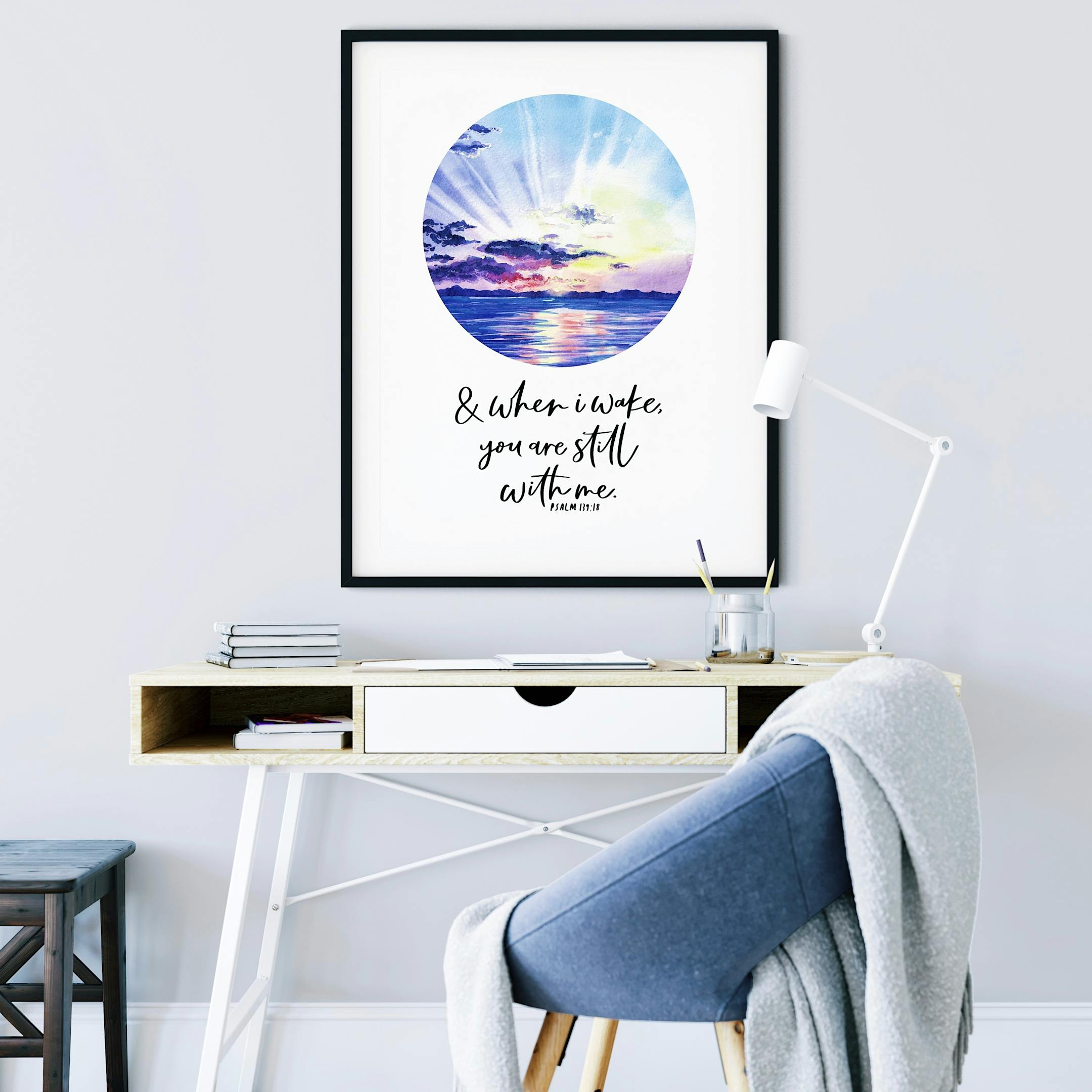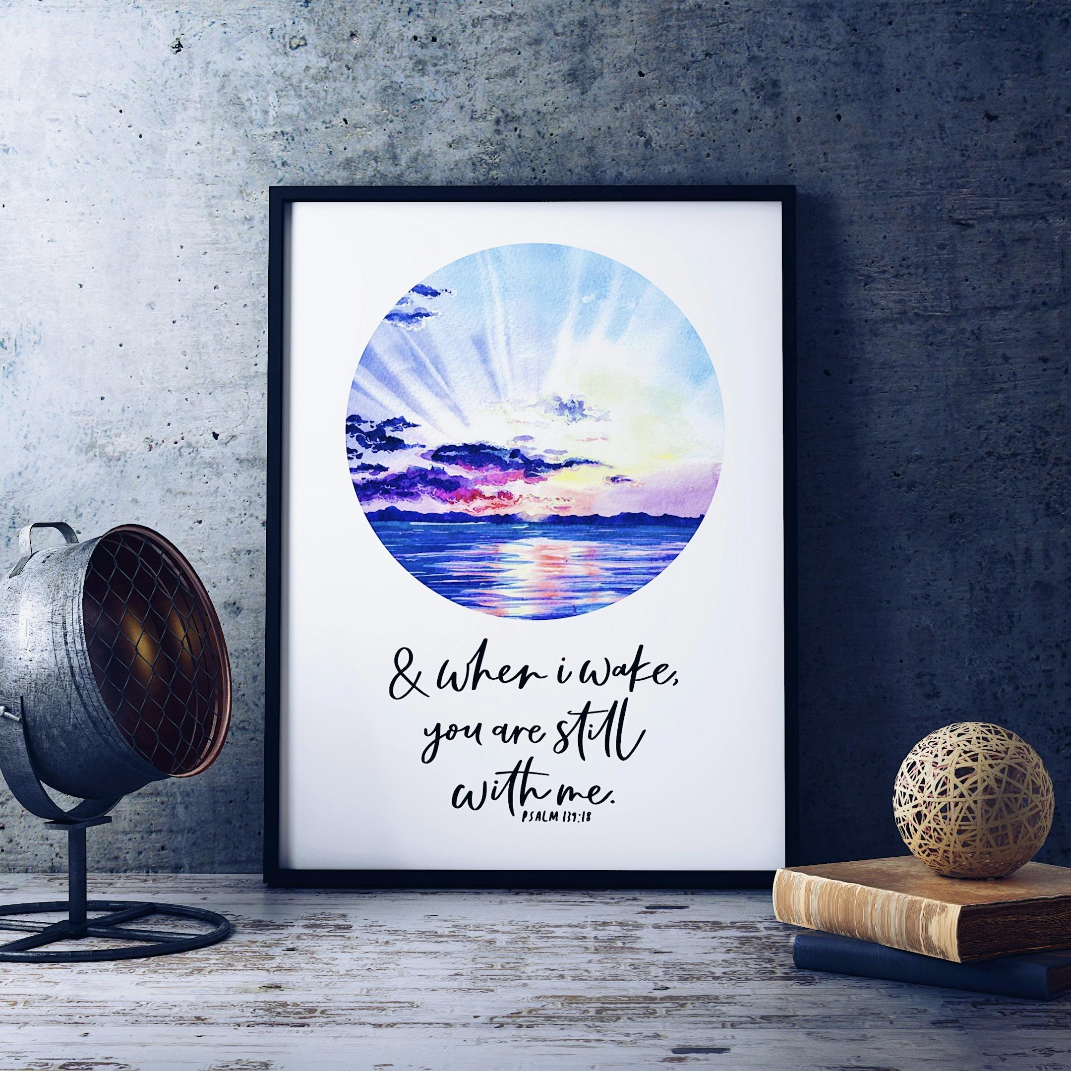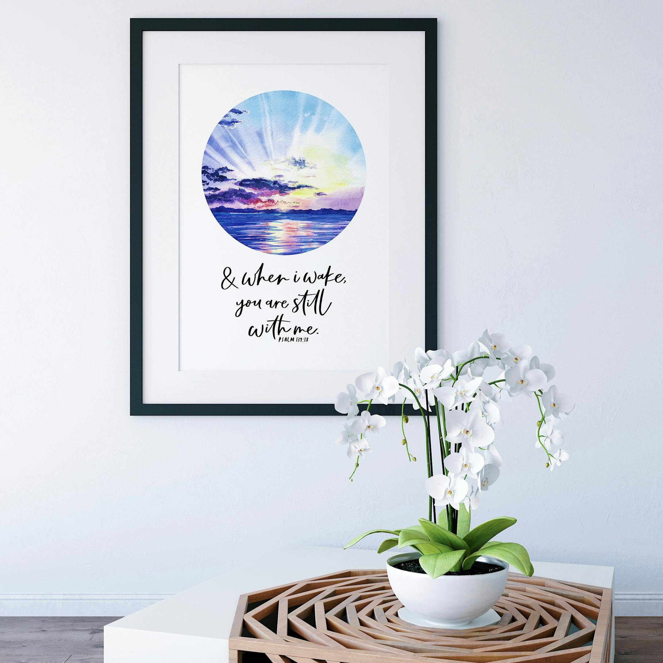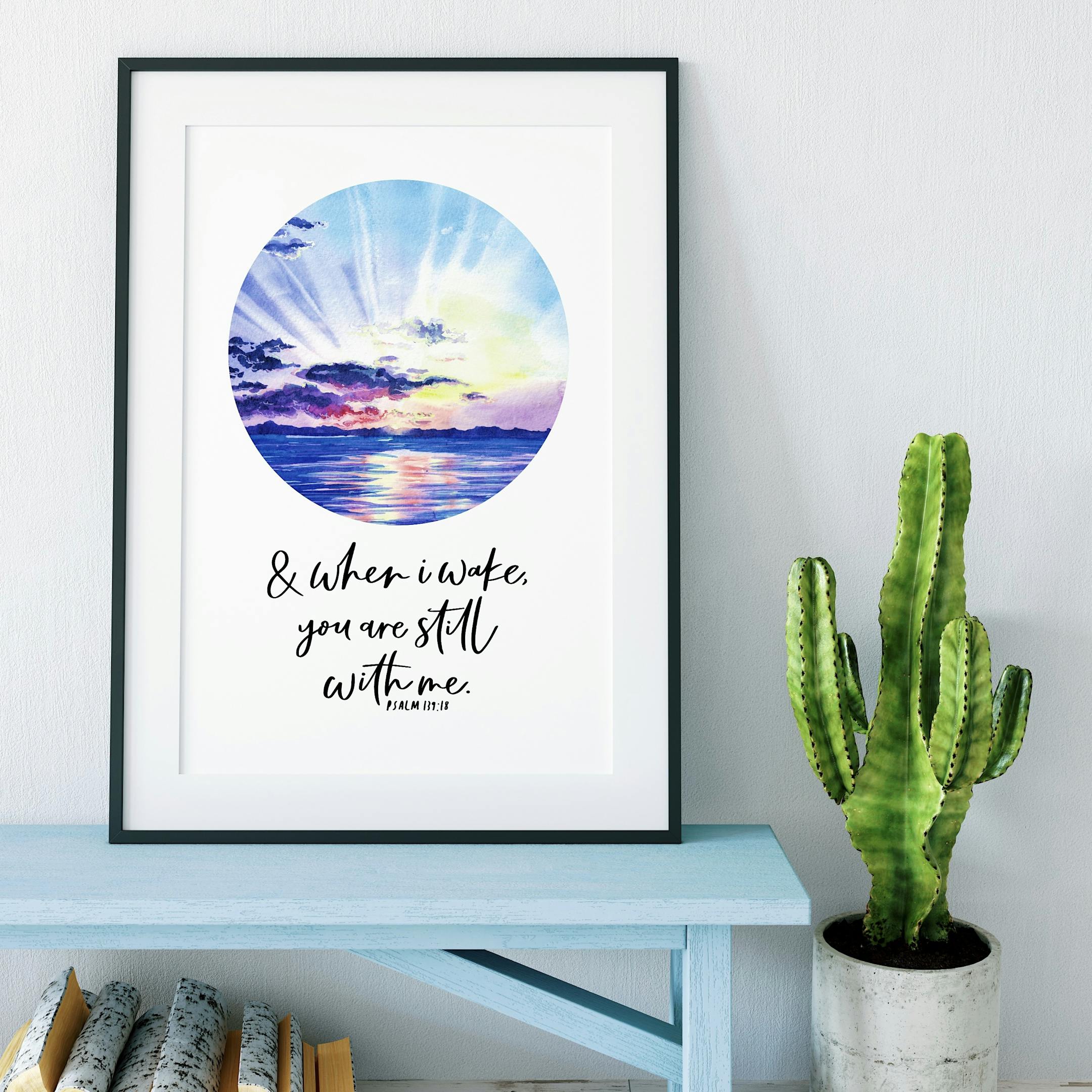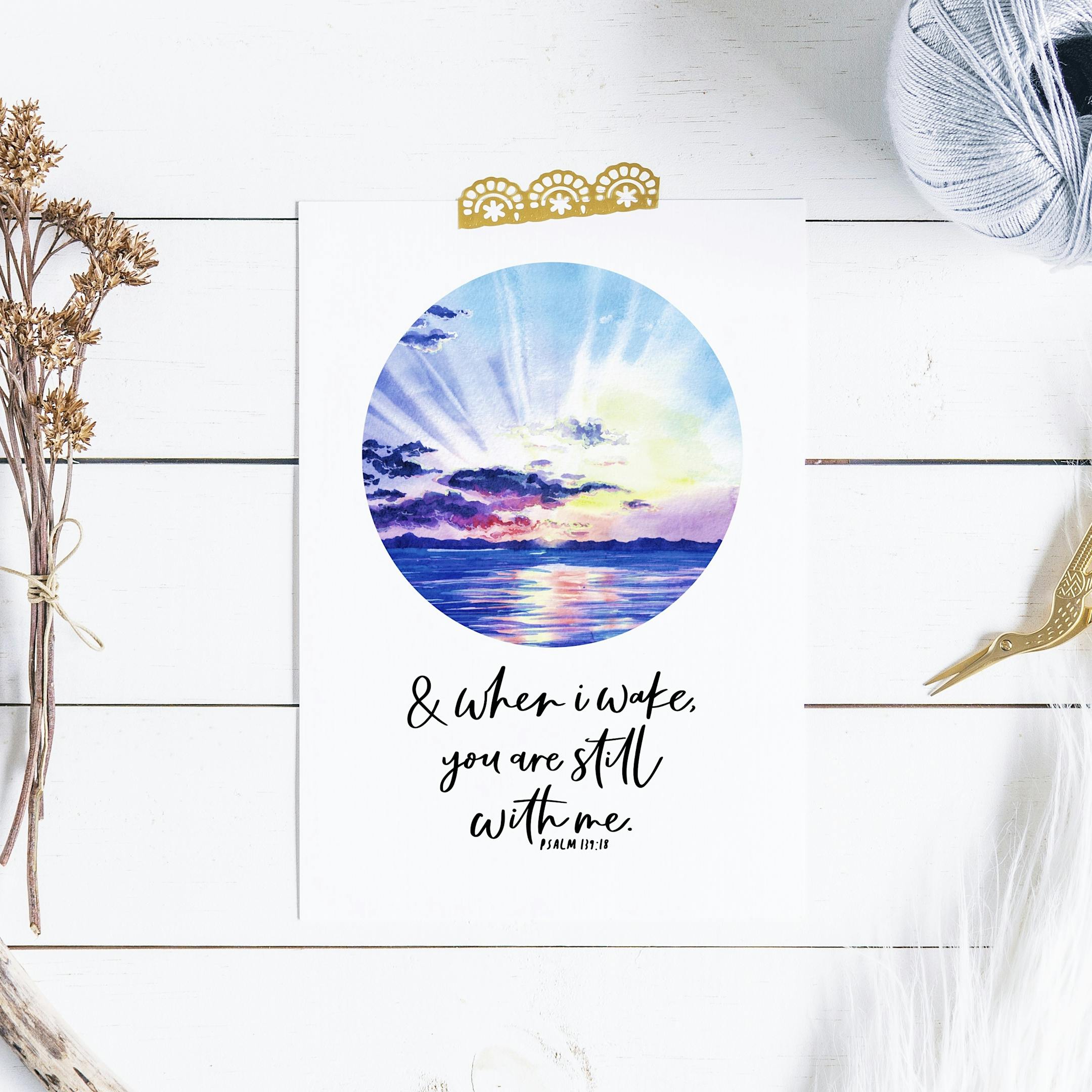 This calligraphy print features the beautiful, powerful bible verse from Psalm 139:18, "And When I Wake You Are Still With Me". The hand-lettered bible verse sits below the striking sunrise watercolour.