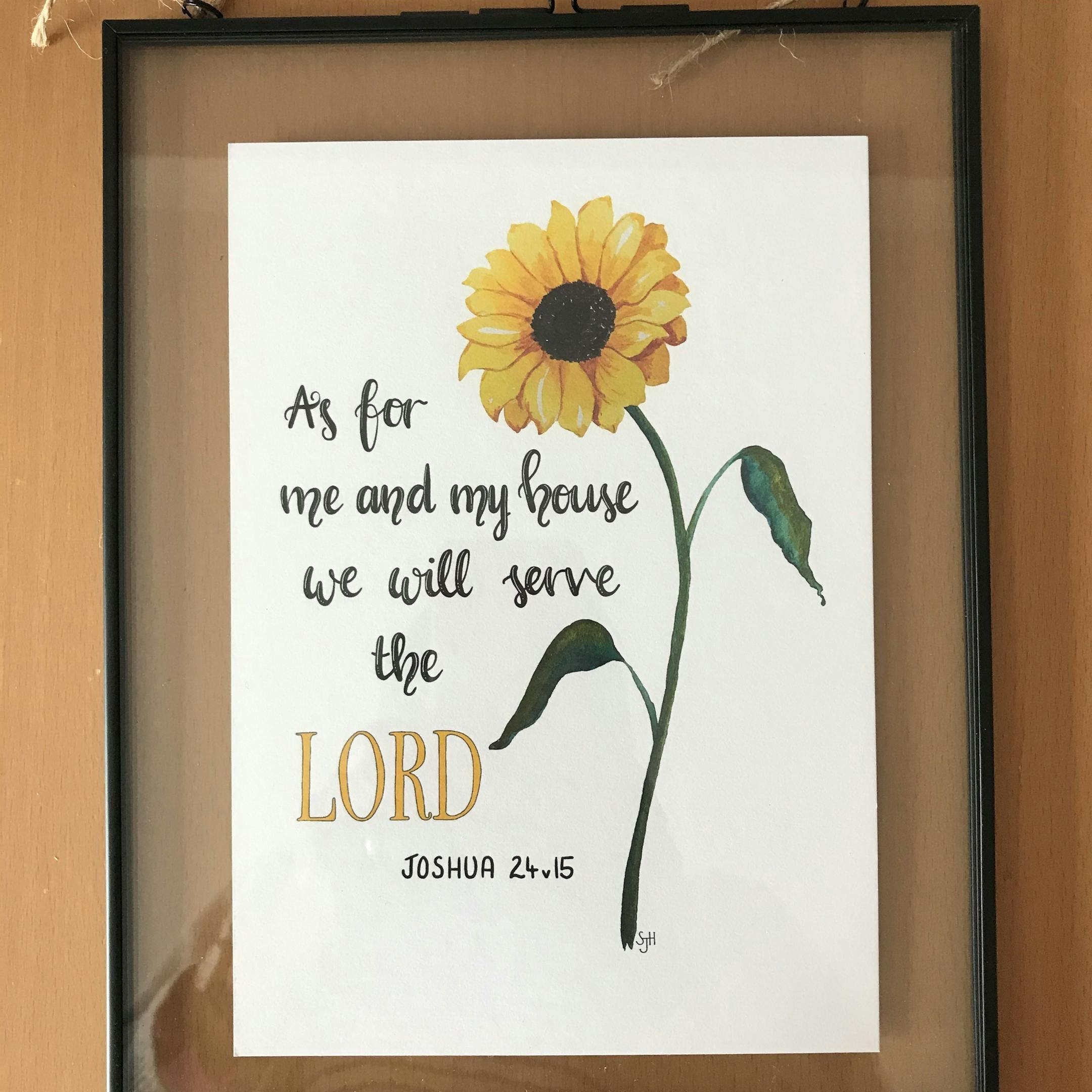 As for me and my house we will serve the Lord, Joshua 24:15. Hand lettered print with watercolour sunflowers. Available in 3 sizes.