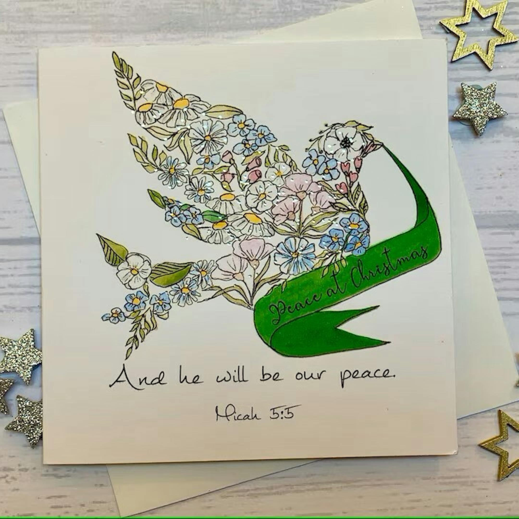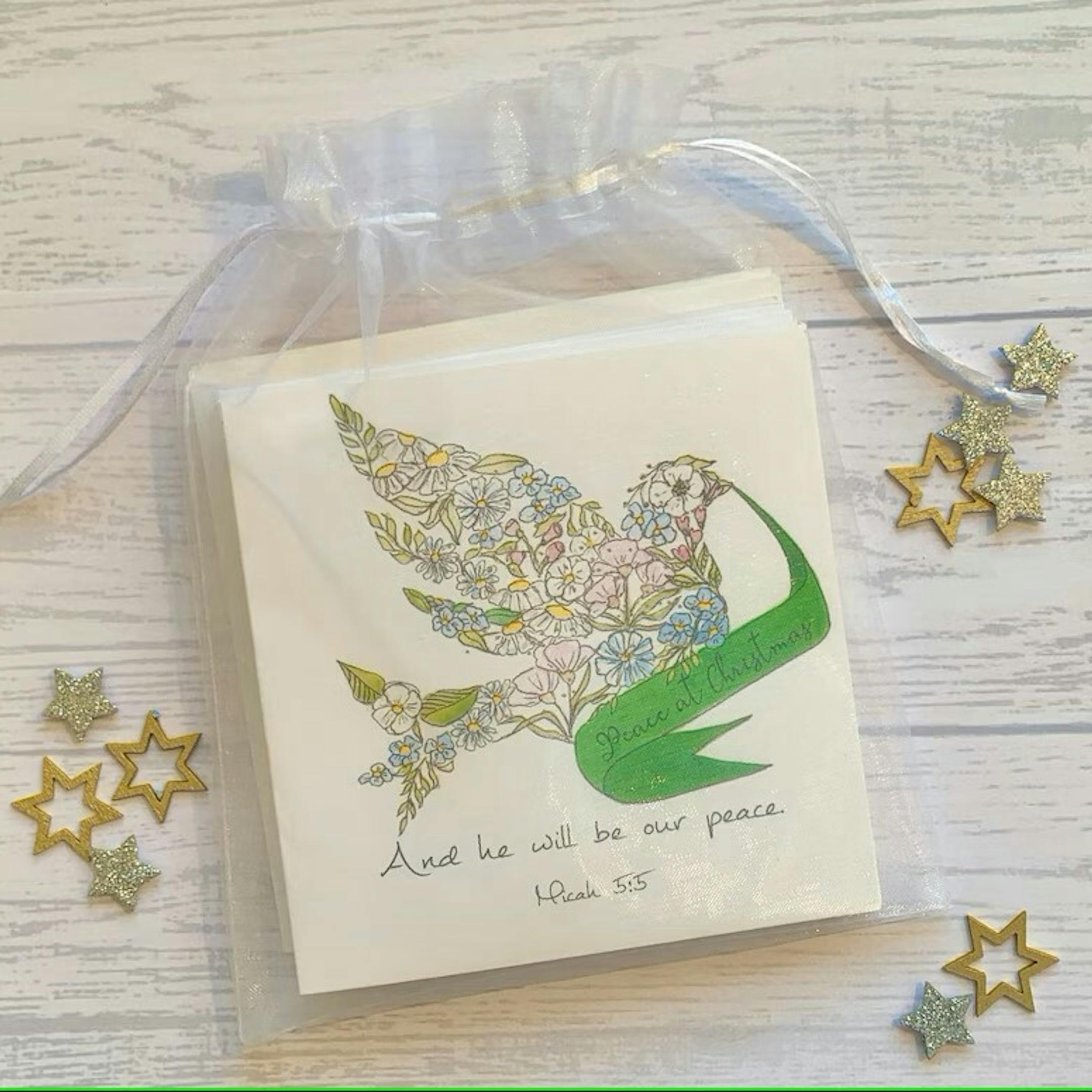 Beautiful Luxury Christian Christmas cards. The words from Micah 5:5 'And he will be our peace,' are written below a lovely reproduction of hand painted watercolour and ink dove made up of delicate flowers. The dove carries a green banner with the words ' Peace at Christmas,' printed on it. The card is delicately embellished with silver foil dots which are hand applied and make the dove glisten beautifully. I can save you the time and the effort of writing your cards as you can add your message including your names so all you will need to add is the recipients names before popping them in their envelopes. You can also chose to leave the cards blank inside for your own message. The designs are printed on crisp white 300gsm card and accompanied by a quality white envelopes. Packs of cards will be placed in white organza bags and packed in a sturdy box and sent via second class post with Royal mail. You can upgrade to first class post or other expedited or tracked services if you require. The closed cards measures 135 mm x 135mm.