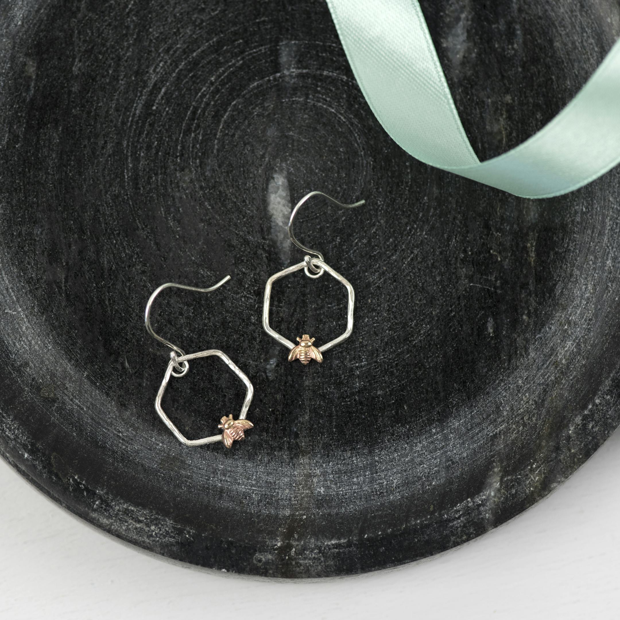 Handmade Sterling Silver hexagonal earrings with brass bee accent. These earrings come with an accompanying verse card.
