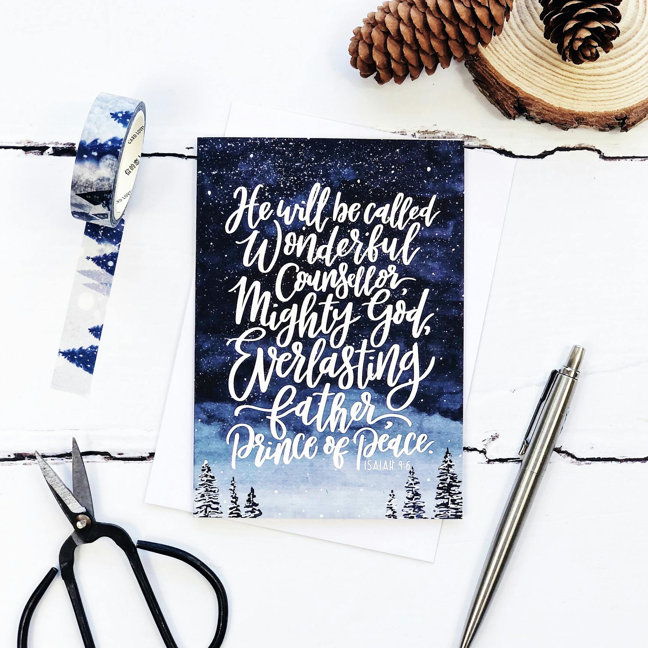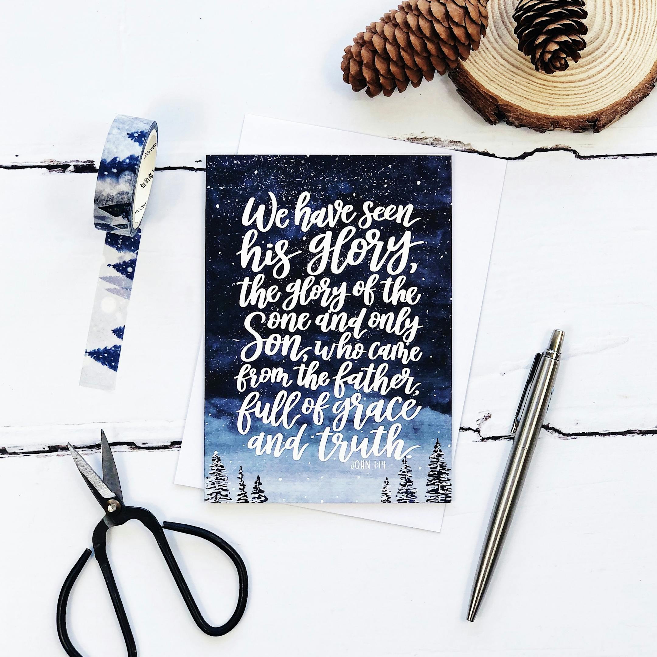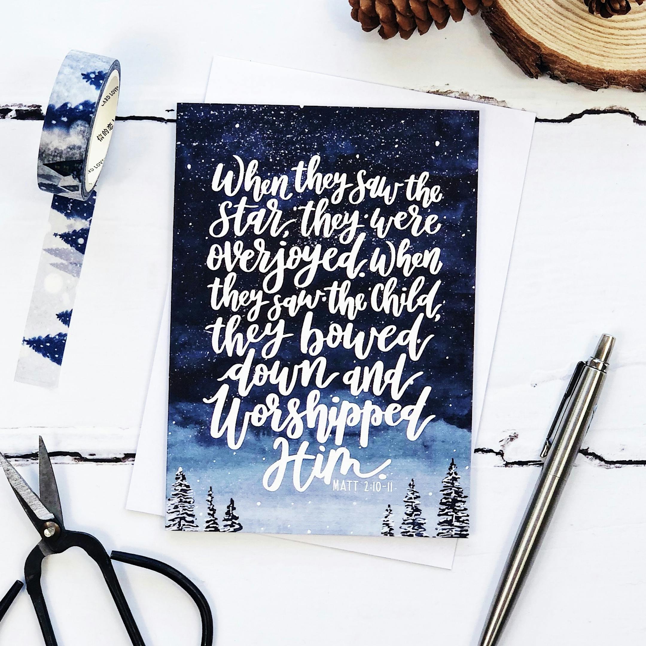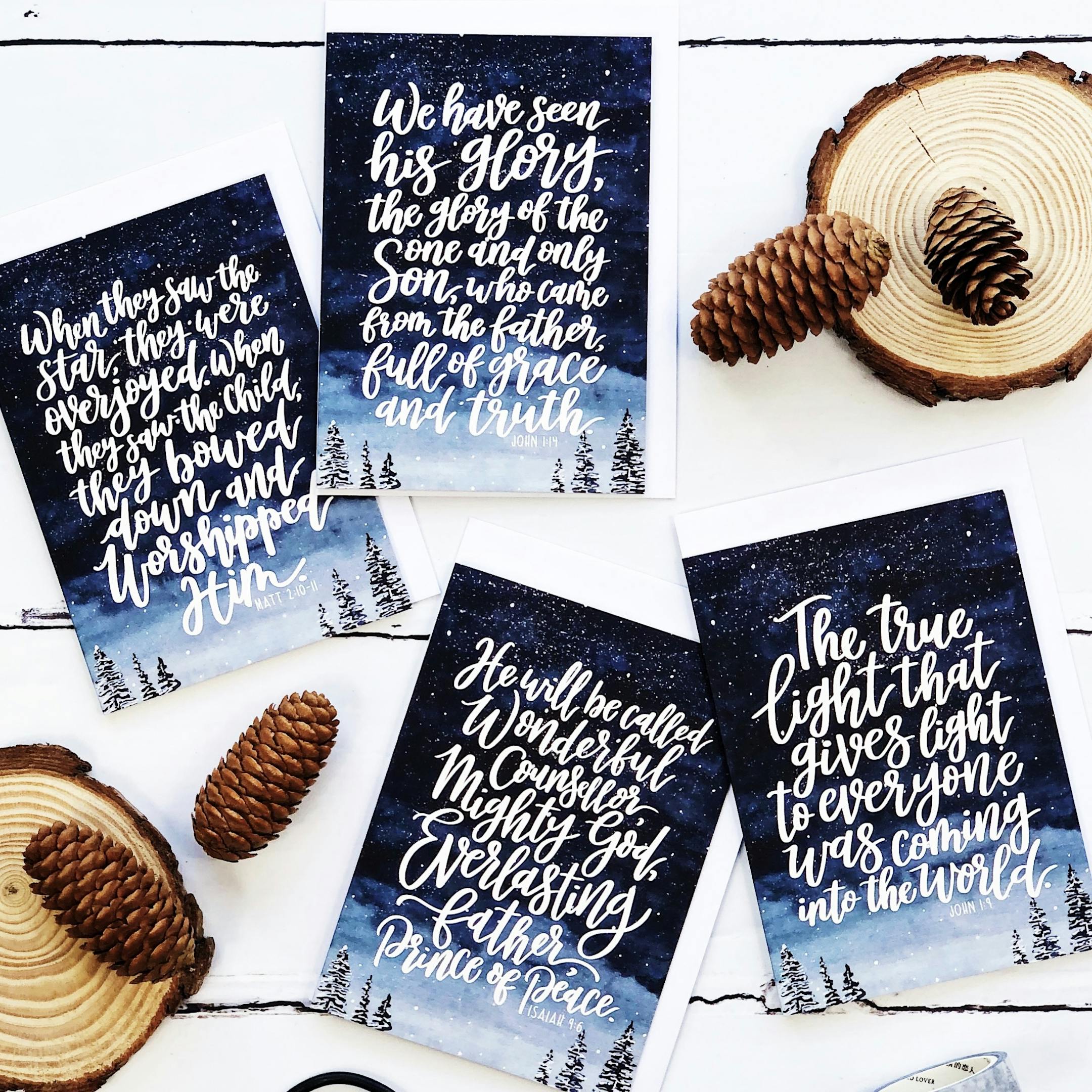 Celebrate Christmas and it's real meaning with these contemporary, eye-catching Christmas cards! Featuring Liz's hand-lettered calligraphy and stunning watercolour backdrops, these bible verse cards are perfect for the festive season. They're a little bit of luxury too - printed onto high quality textured card!
