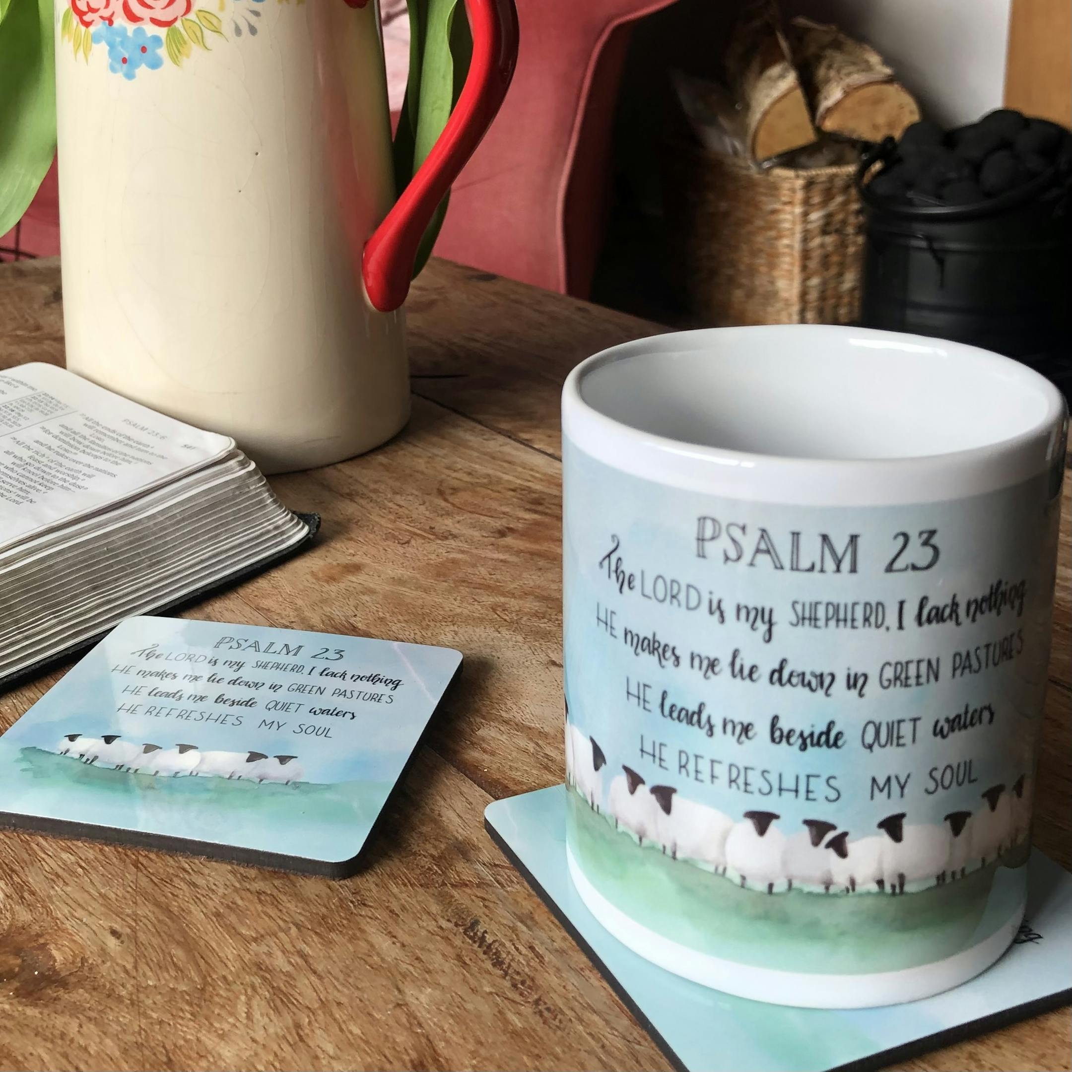 This high-quality, cork-backed coaster measures 9cm x 9cm and features my original hand-lettered watercolour feather design of God's beautiful promise from Psalm 23, 'The Lord is my shepherd I lack nothing. He makes me lie down in green pastures. He leads me beside quiet waters. He refreshes my soul.'