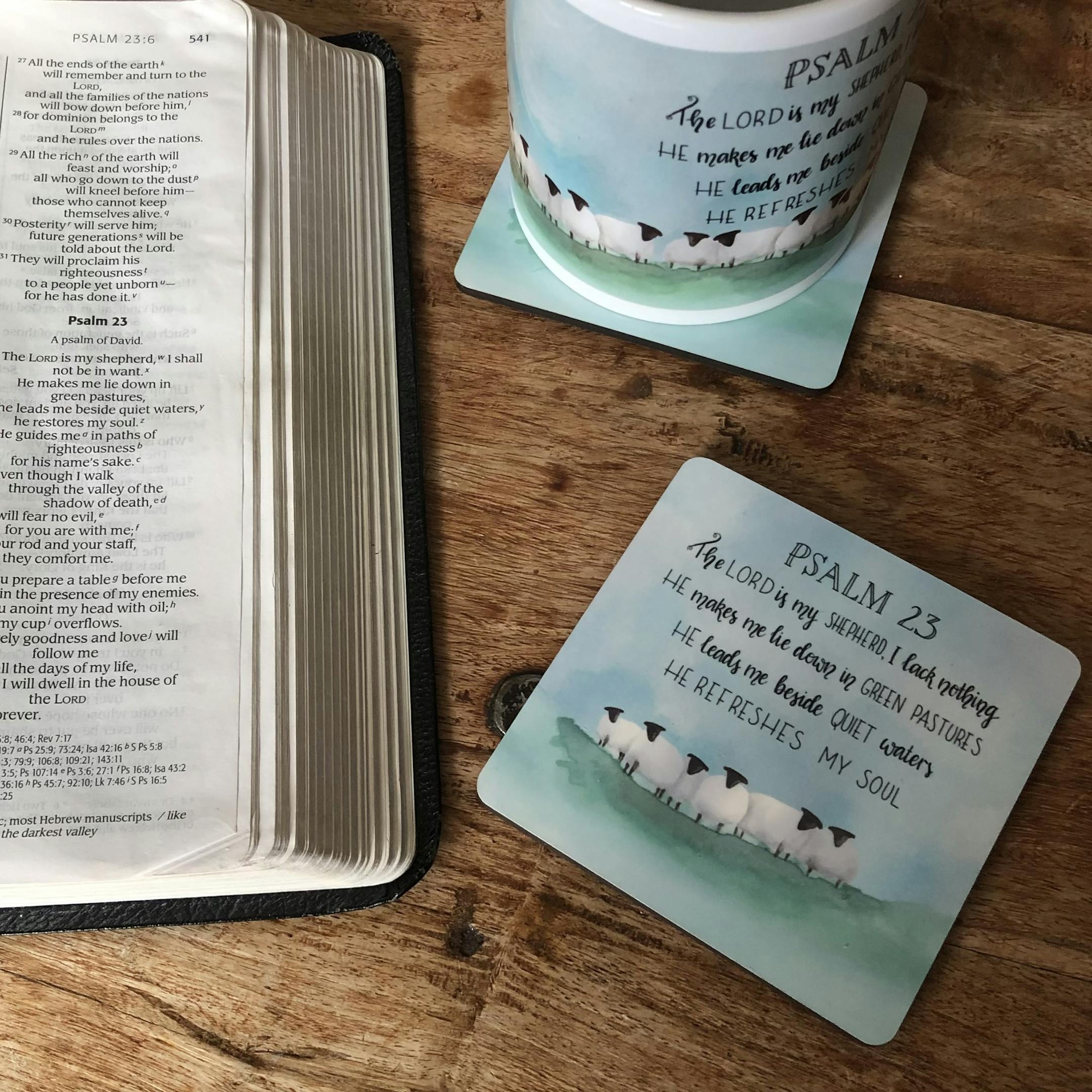 Christian gift, coaster featuring bible verses from Psalm 23 and sheep. 'The Lord is my shepherd I lack nothing... He refreshes my soul.'