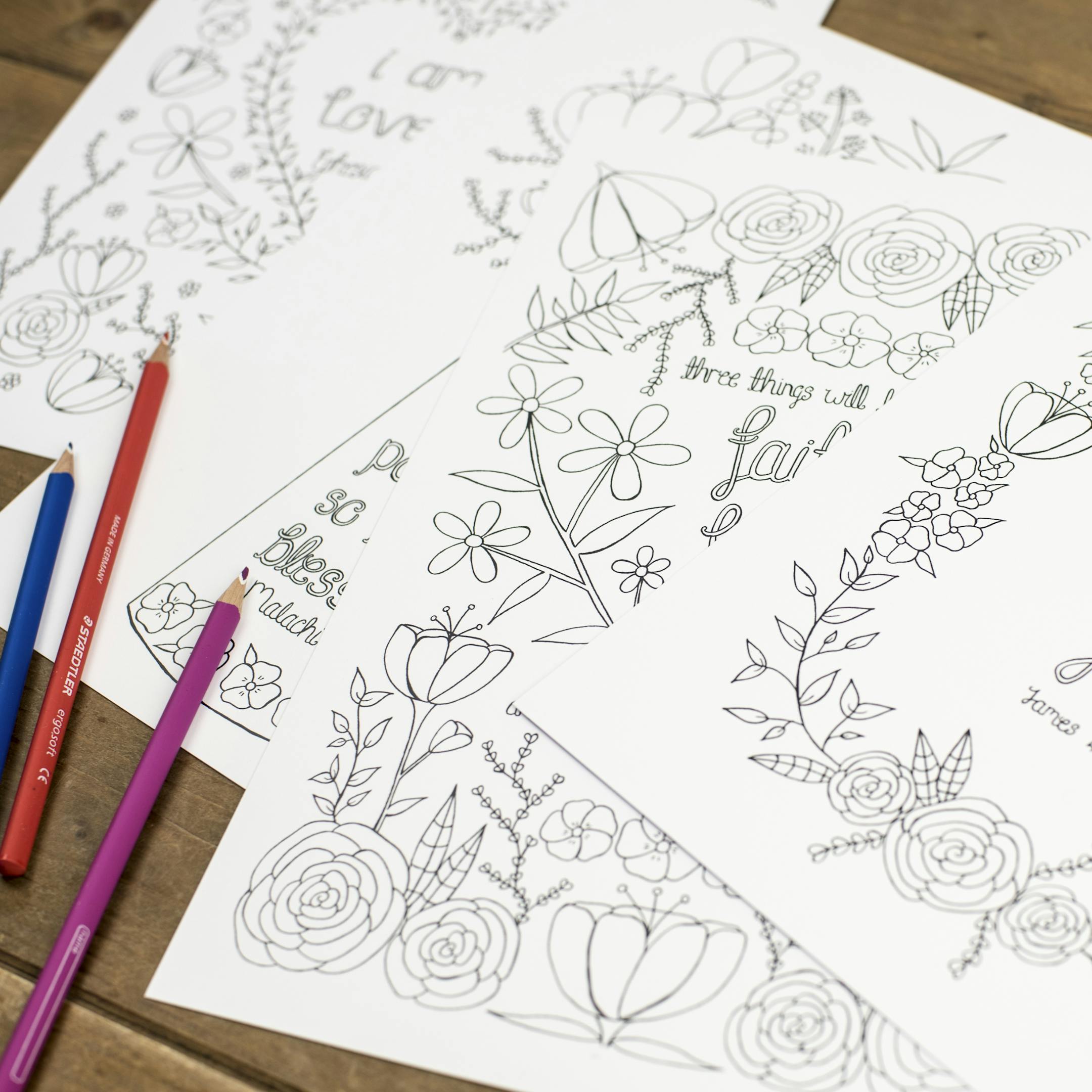 These hand drawn colouring pages would make for a unique gift or a fun treat for yourself, each sheet has a different Bible verse drawn into the design.