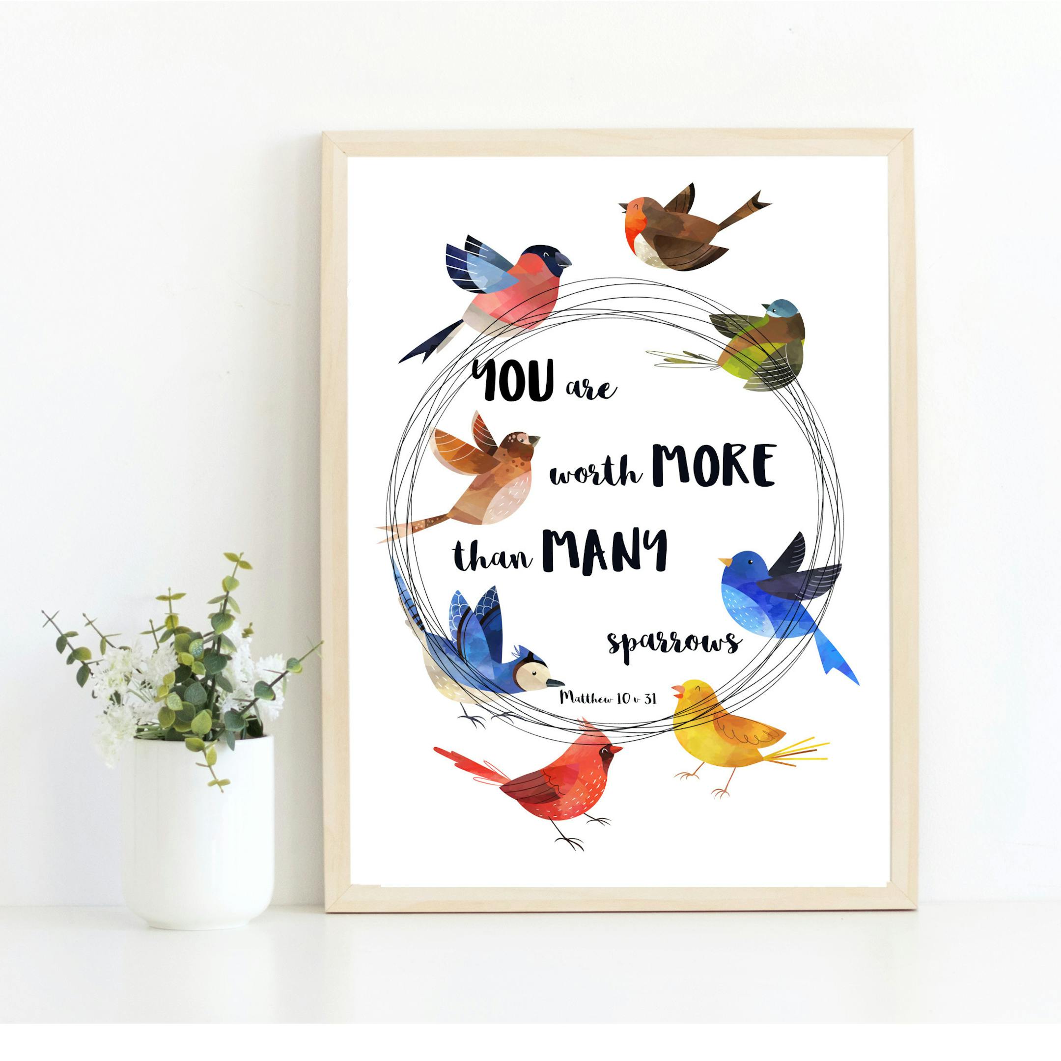 Decorate your home, bedroom or nursery with this beautiful and cheerful birds Bible verse print, or give as a perfect gift to a friend or loved one.