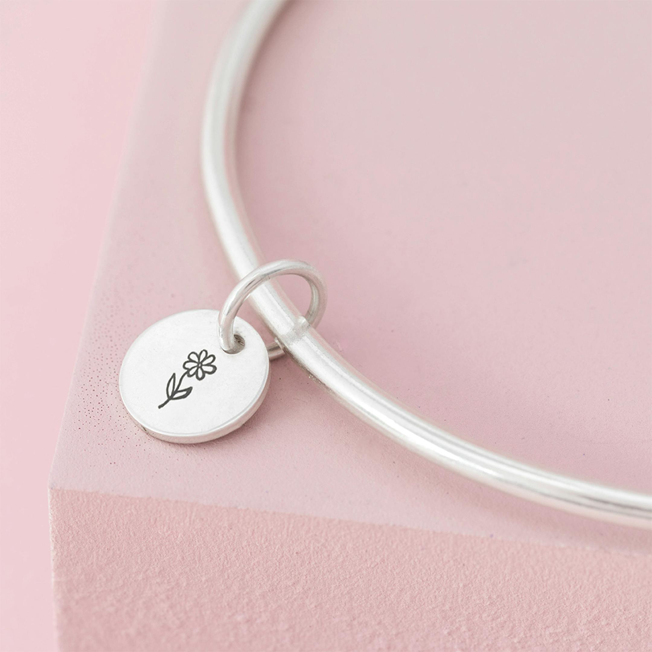 Solid sterling silver bangle with hand-stamped flower charm. Available in three sizes, hallmarked and packaged in a foil jewellery box as standard.