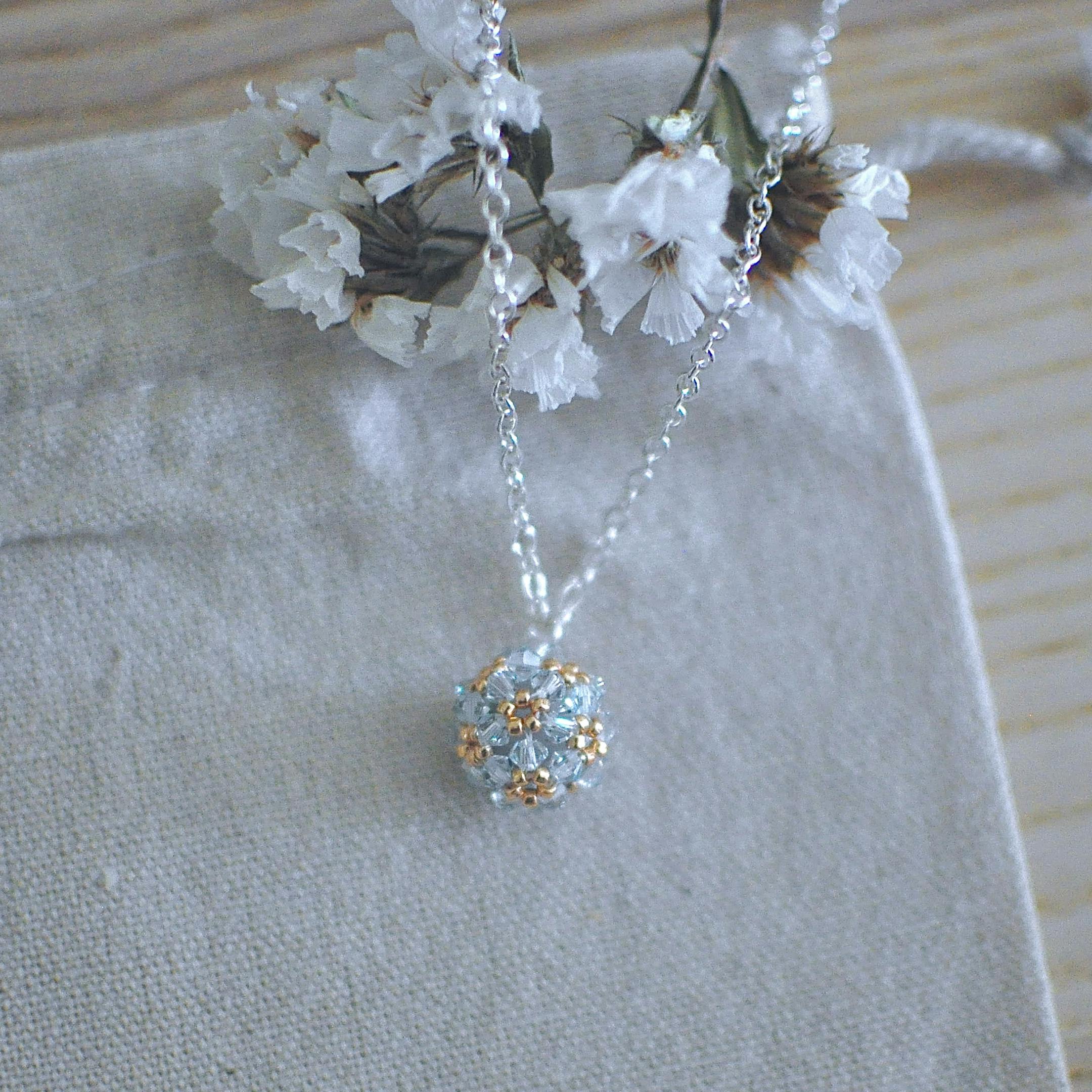 Delicately handmade from tiny rose gold Japanese glass seed beads, light blue Swarovski crystals, and stitched together with needle and thread.