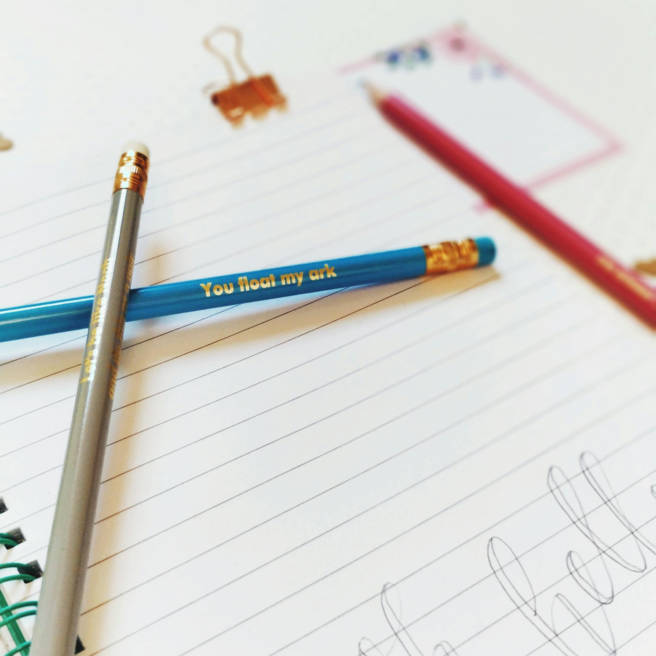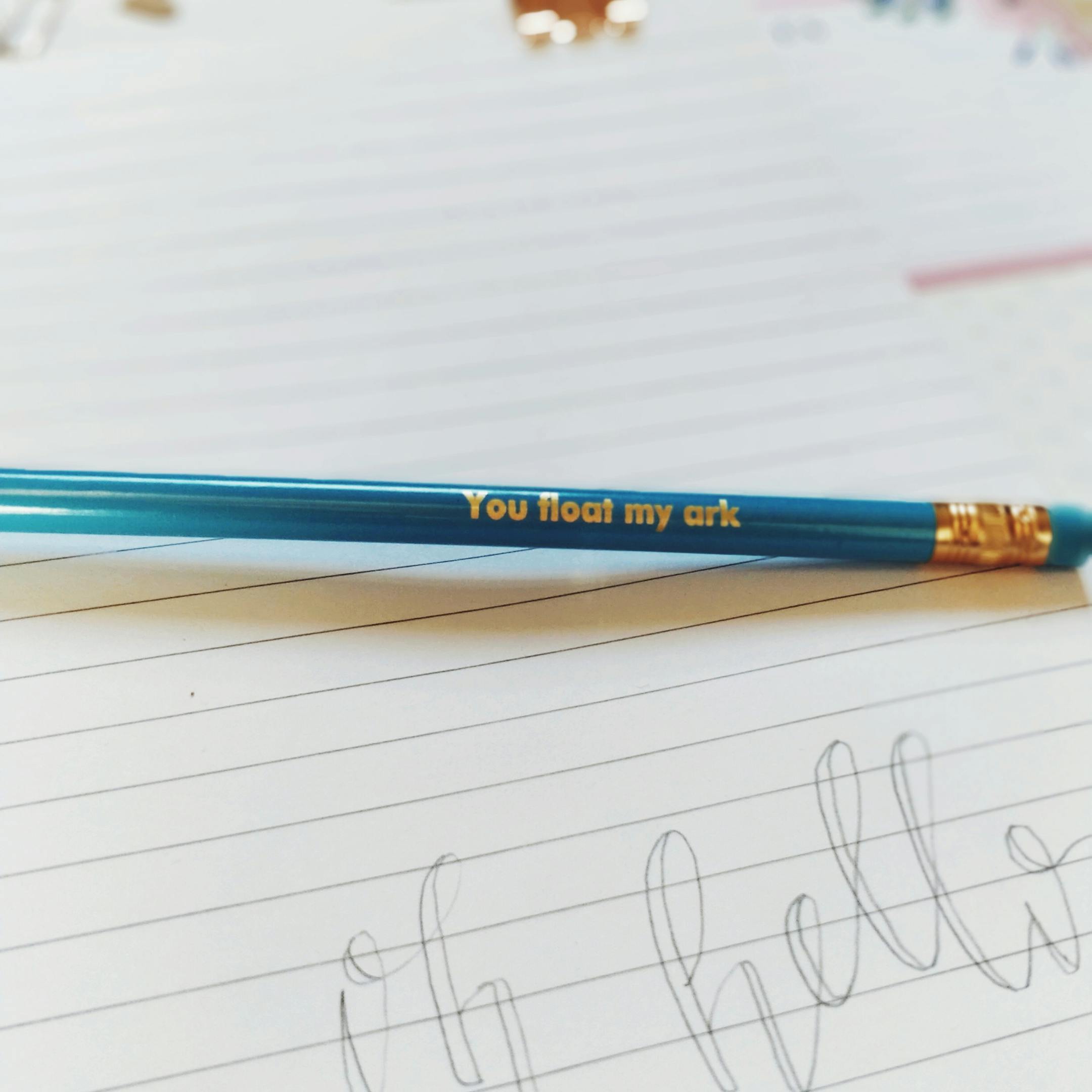 A blue HB pencil with a blue rubber reading, 'You float my ark'.