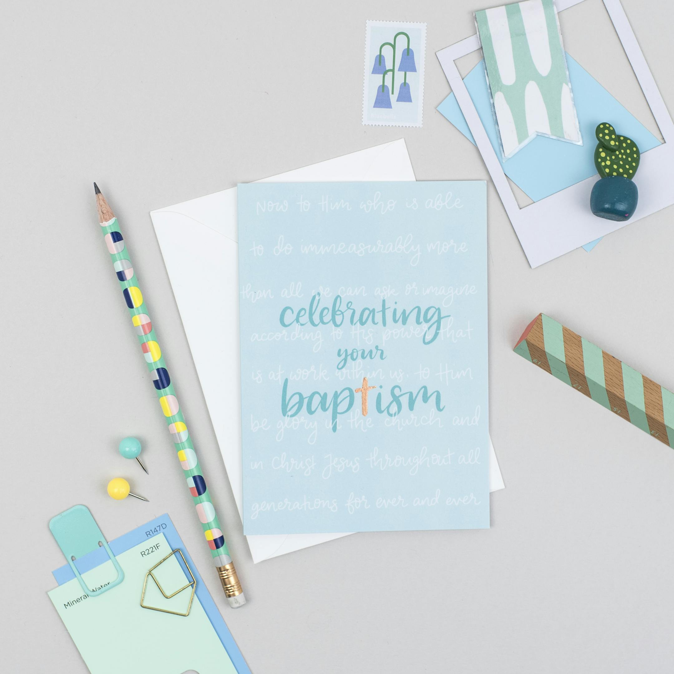 This colourful card reads 'Celebrating your Baptism' with a cross-shaped 't' in bright orange, and verses from Ephesians 3 written across the blue background.