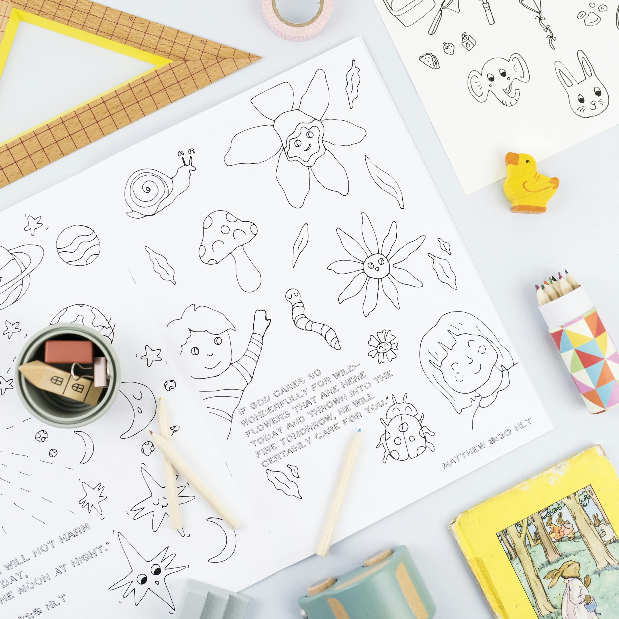 An A4 Colouring Book filled with cute characters and illustrations alongside scriptures which focus on core truths.