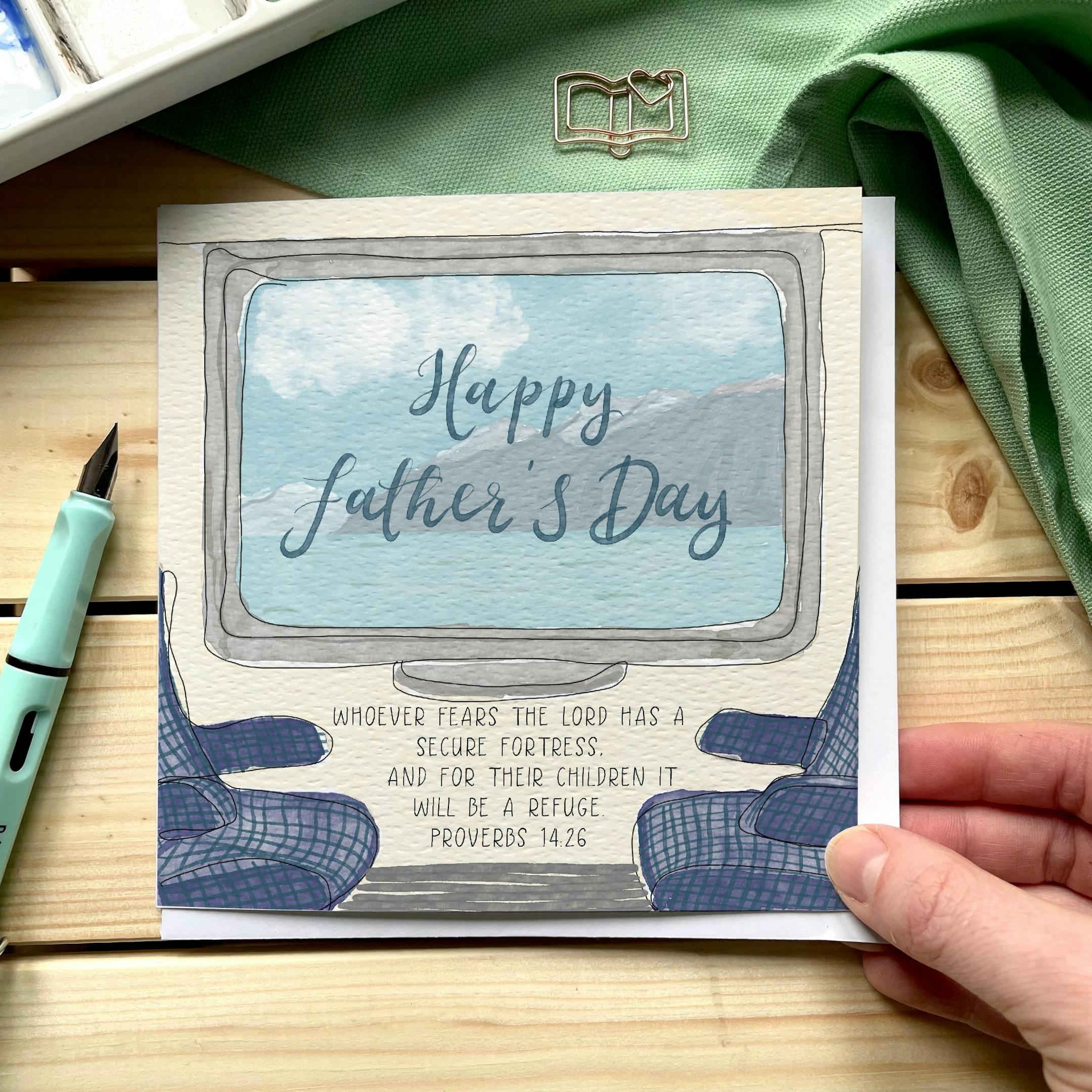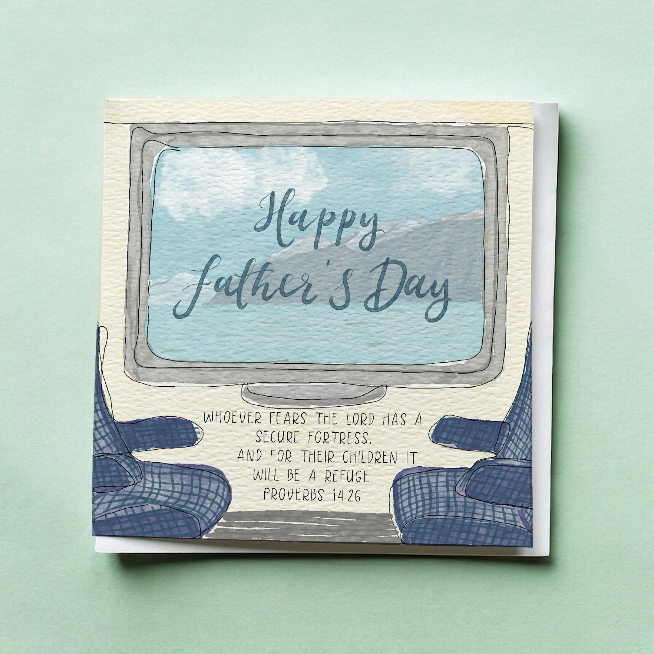 A Christian Father’s Day card, illustrated in watercolour with a gorgeous view from a train window and an encouraging verse from Proverbs 14:26.