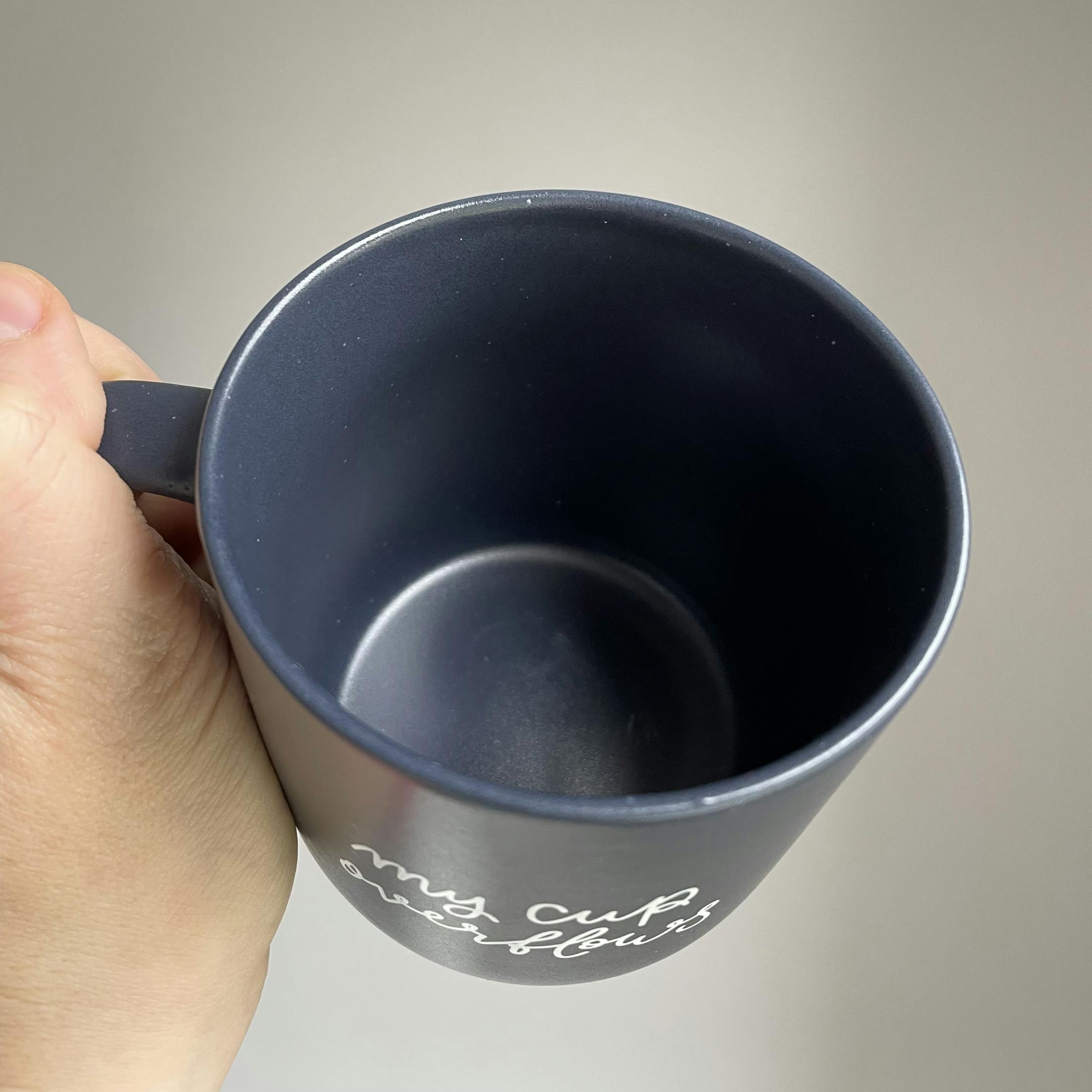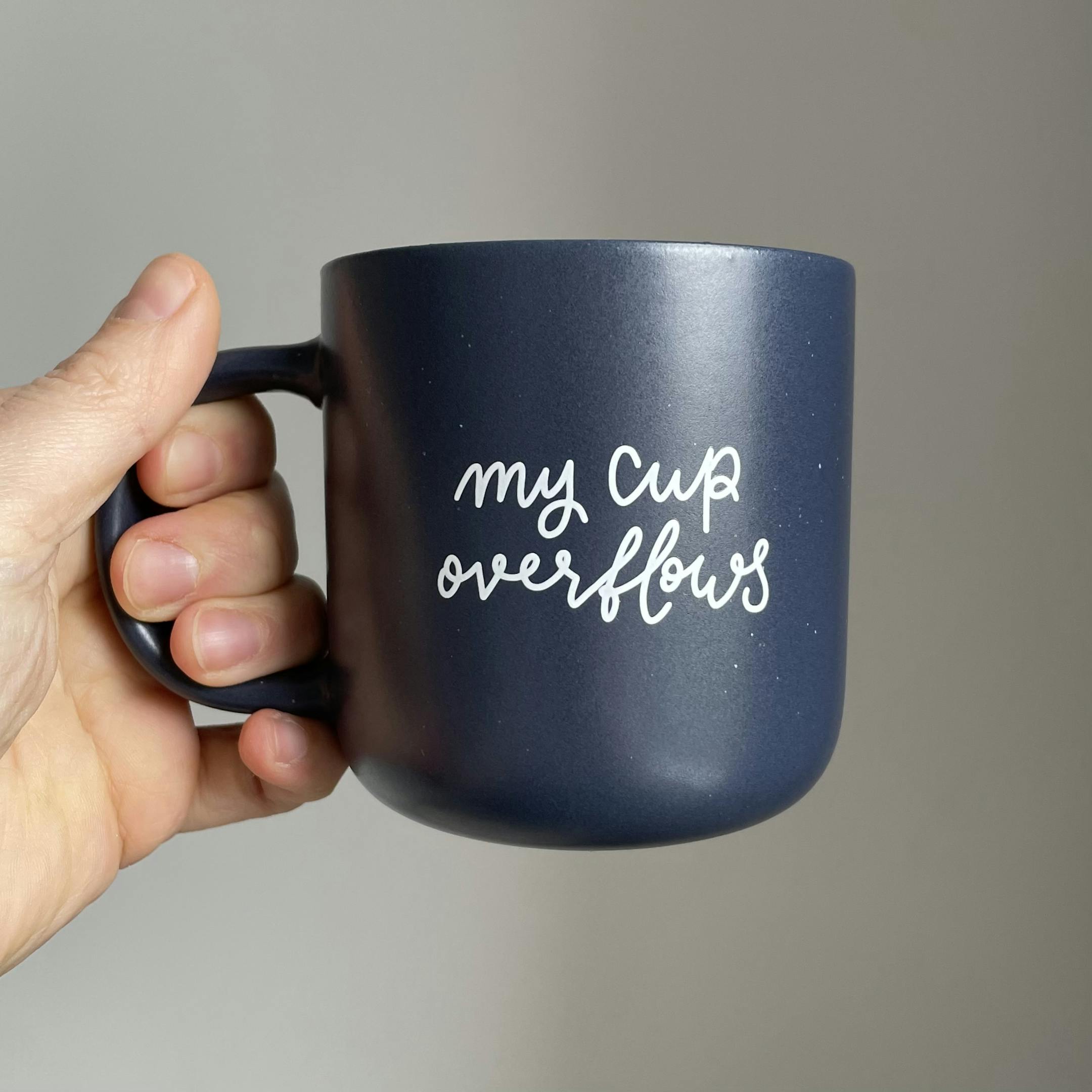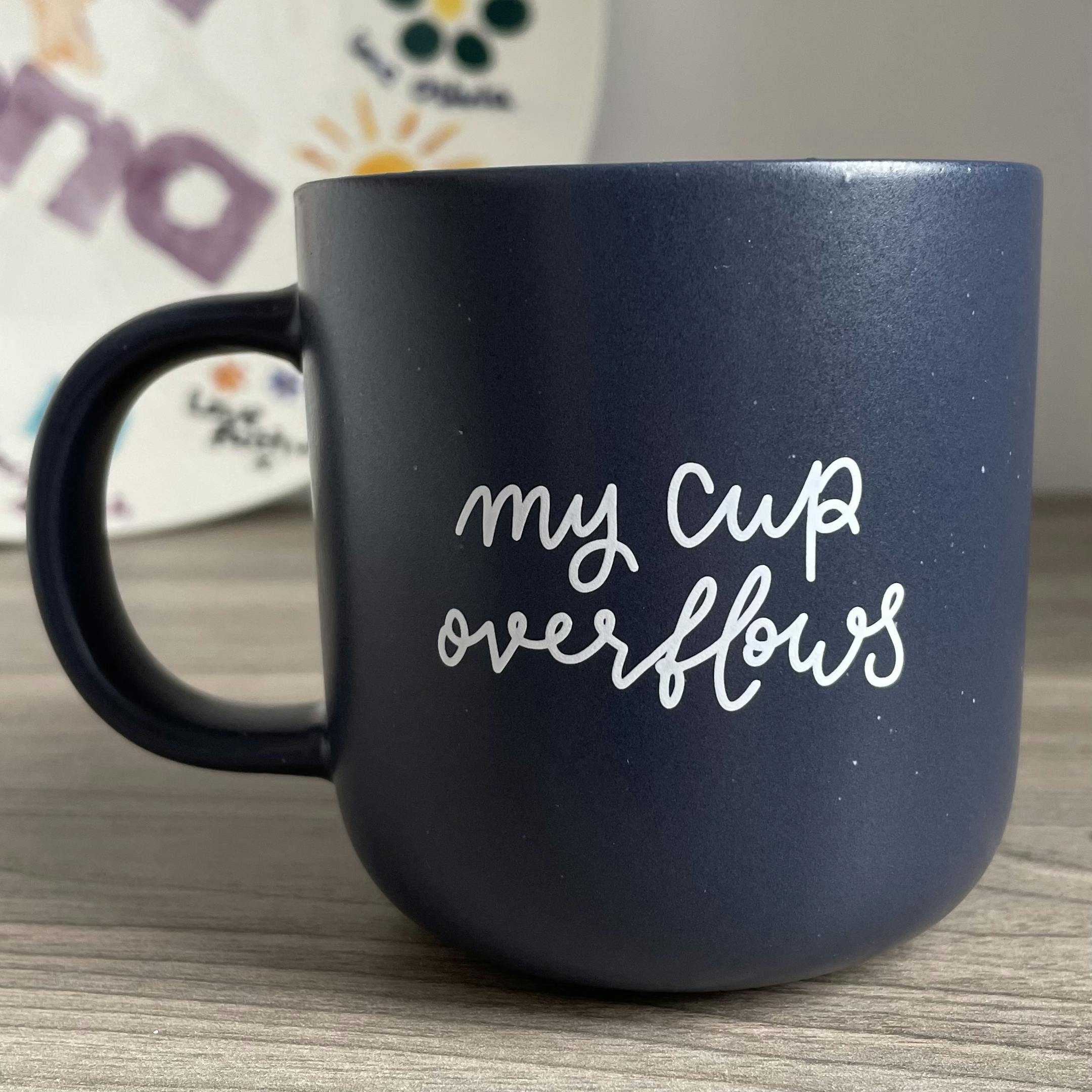 A Christian mug with words from Psalm 23:5 which says “my cup overflows”. Navy blue ceramic mug with white hand lettered design printed on it. 370mL capacity.