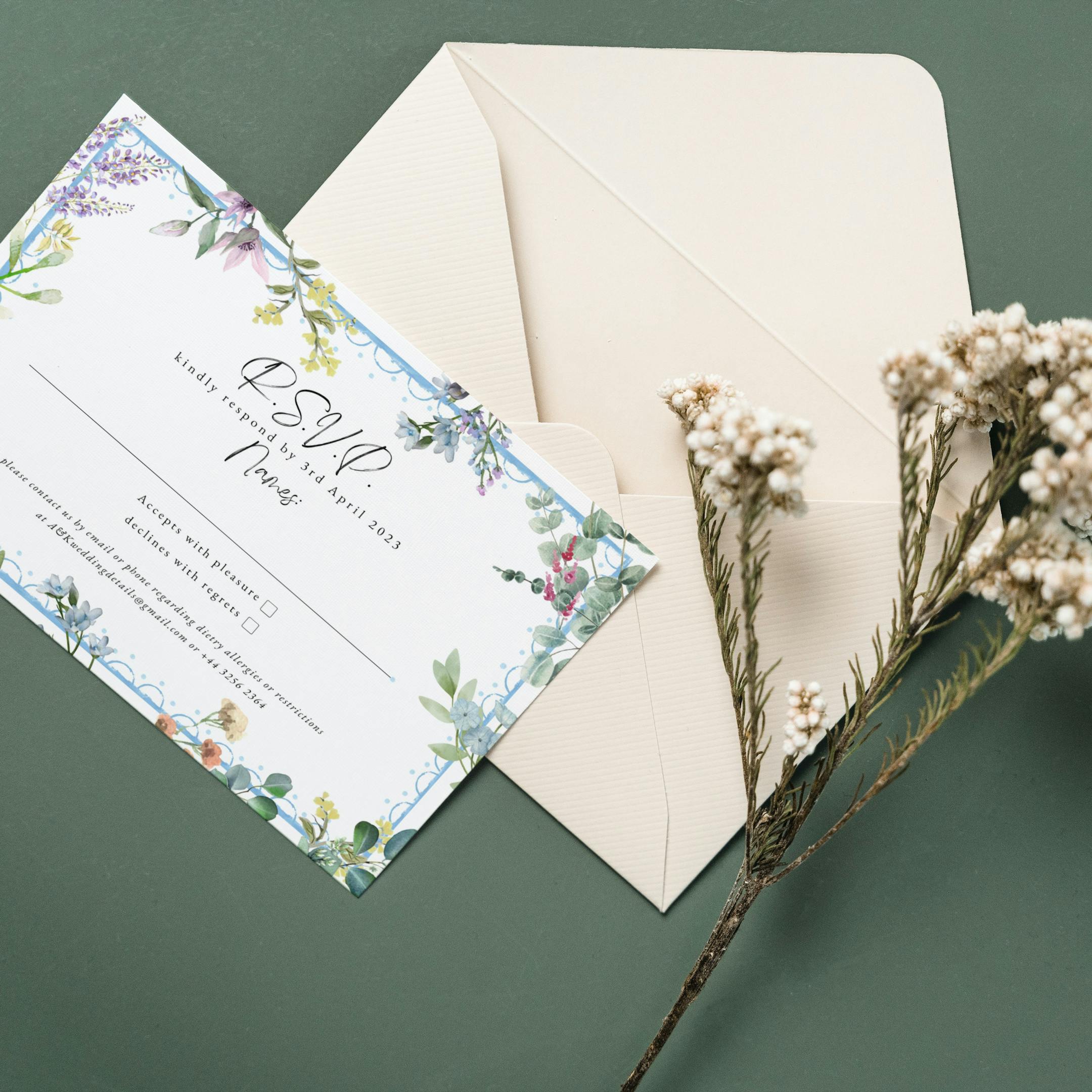 Fun floral Christian Wedding Invitation and RSVP. The front page features details of the date, venue and time. The back page features the details of the wedding