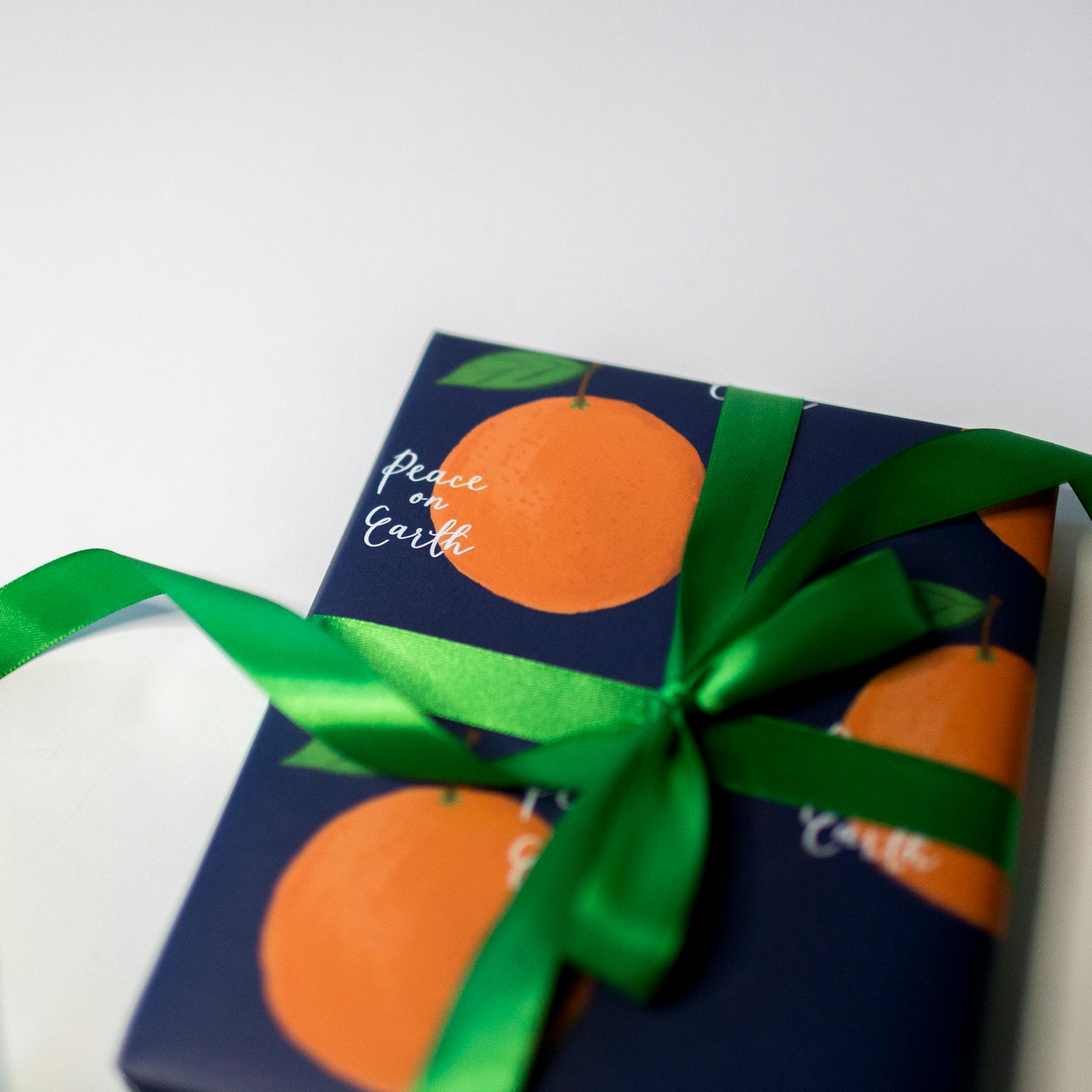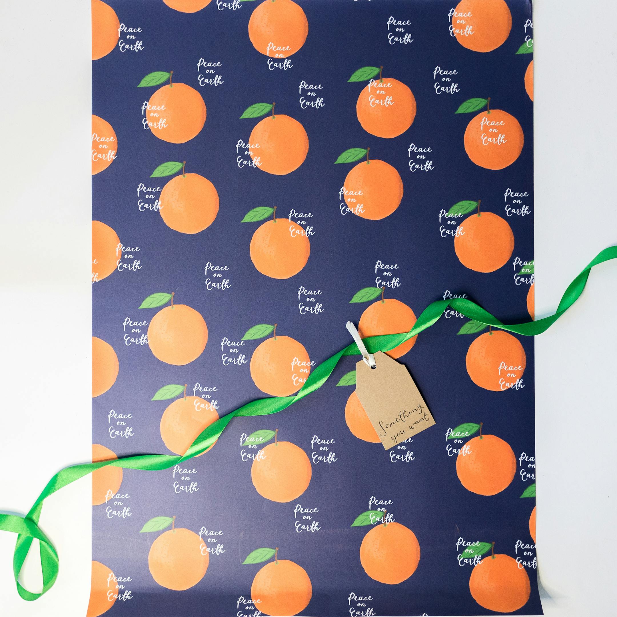 Wrap gifts in “peace on earth” wrapping paper, hand lettered on top of satsuma illustrations and a navy paper. Finish with matching orange tags!