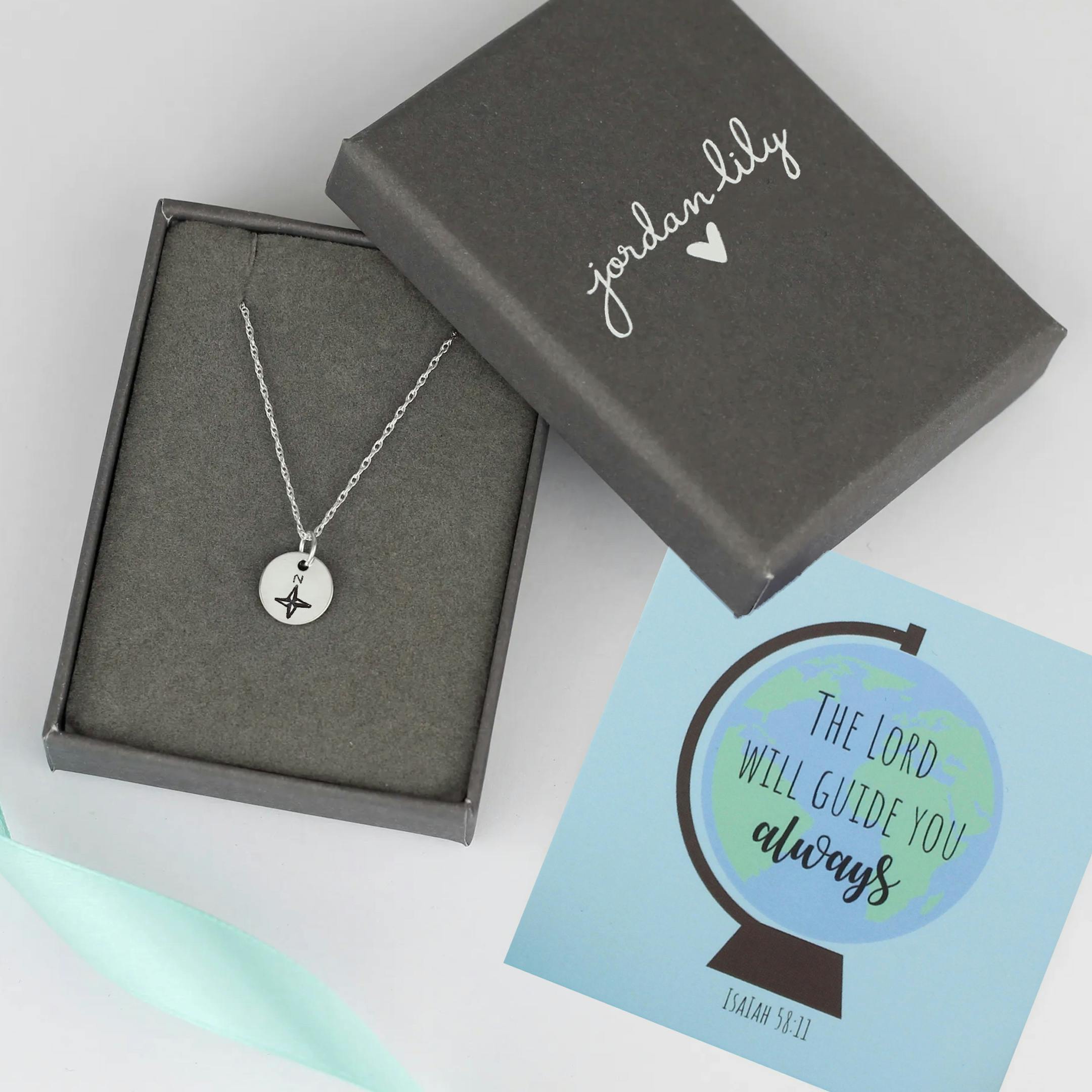 Hand-stamped sterling silver compass necklace, on a 16" chain. Accompanying verse card reads: "The Lord will guide you always".