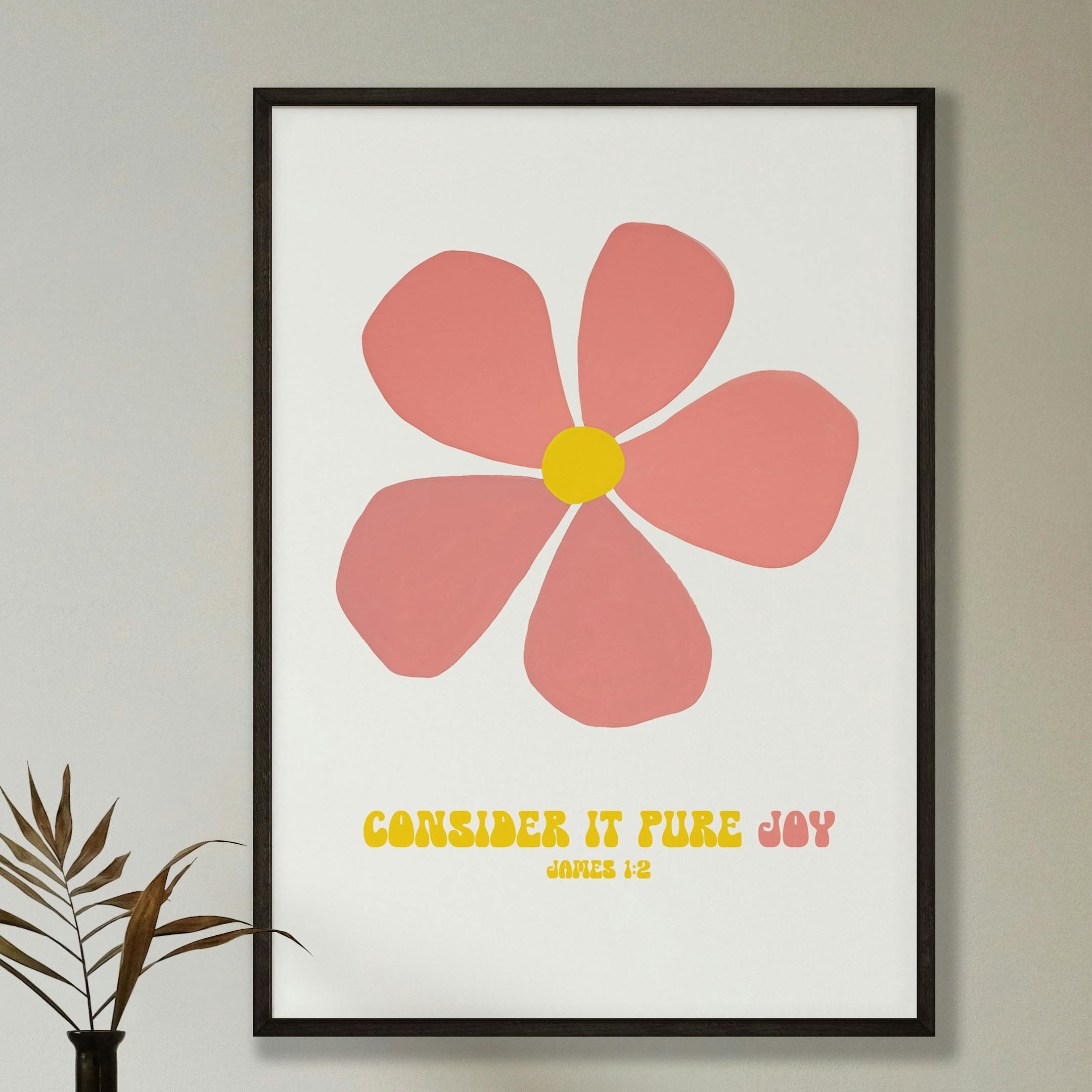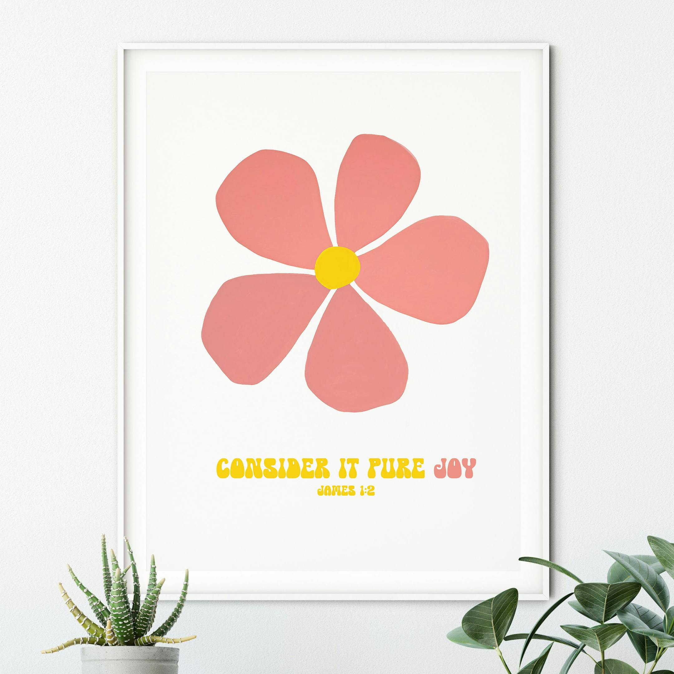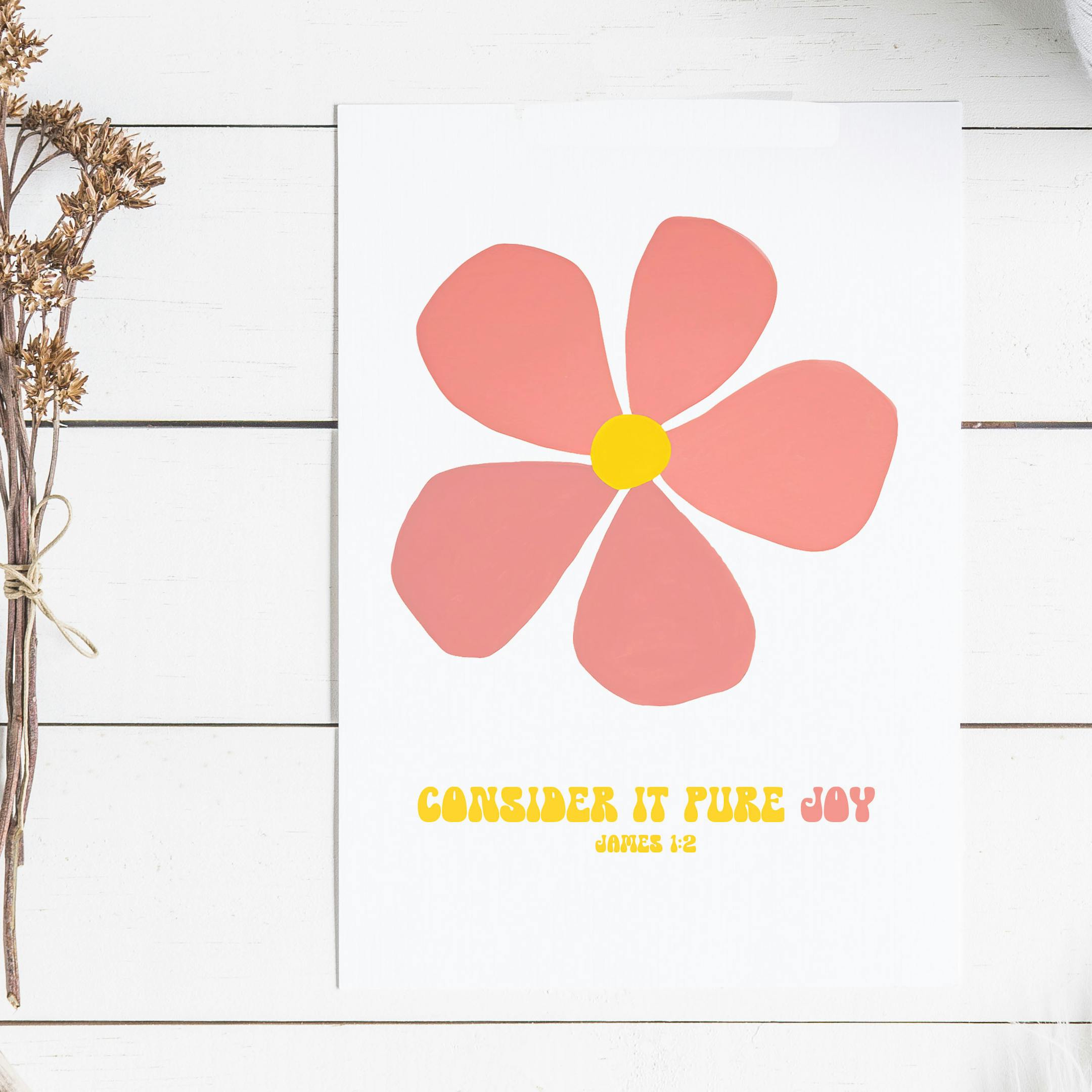 A Retro inspired Art Print that features the wonderful Bible verse from James 1:2 in a Retro bubble-font, together with a simple 70's inspired floral design. What a great way to display the Word of God in your home, office or church.