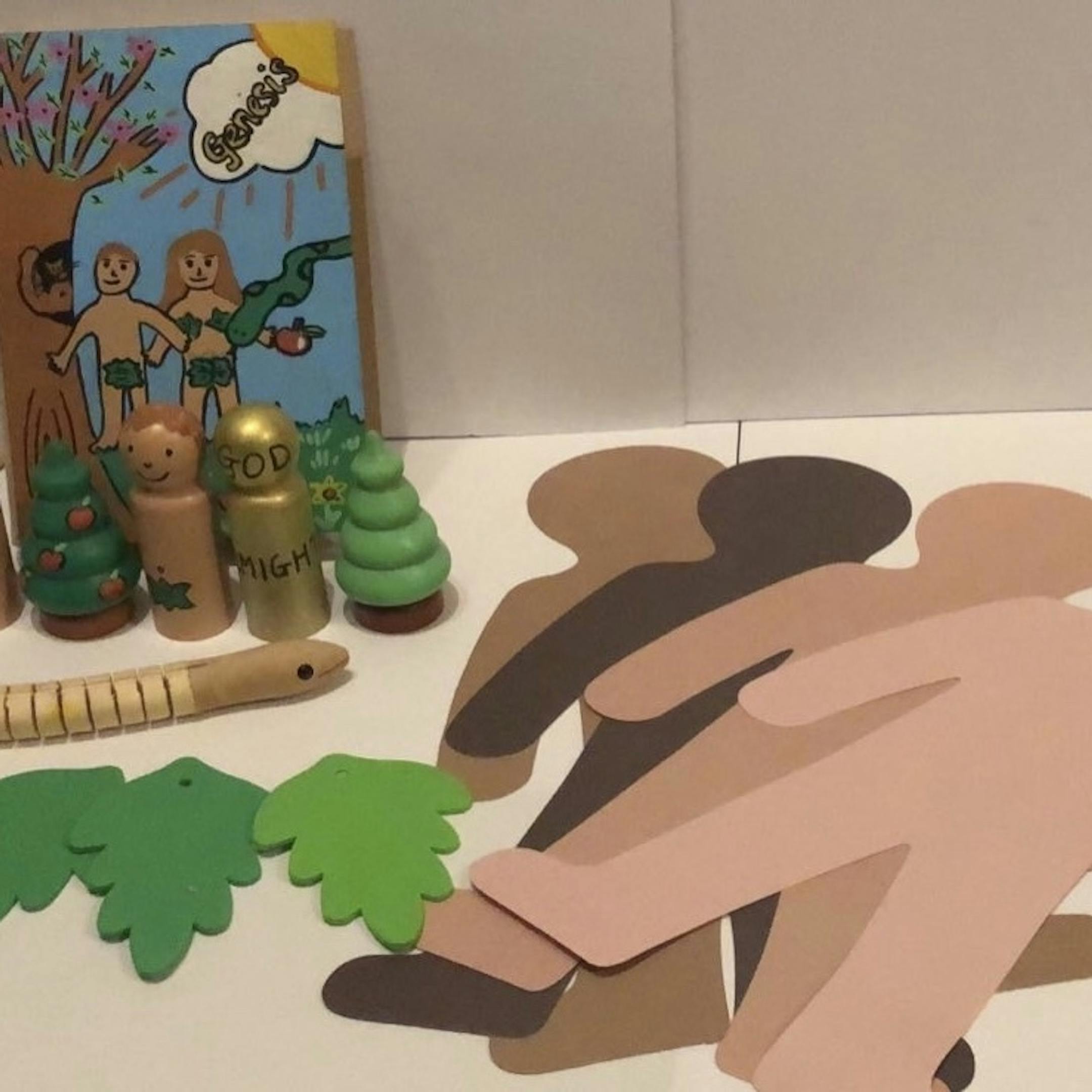 A story sack - part created for you and part for you to create. Peg dolls- Adam, Eve, Snake, Trees and God and a wooden snake to paint also. Then people paper cut outs and leaves and wool etc to decorate your own Adam and Eve templates and a cardboard book painted to the story plus hand decorated laminated scripture memory verse. Made to safety standards and finished in toy safe varnish an comes in a handmade stars and moon bag to symbolise creation.