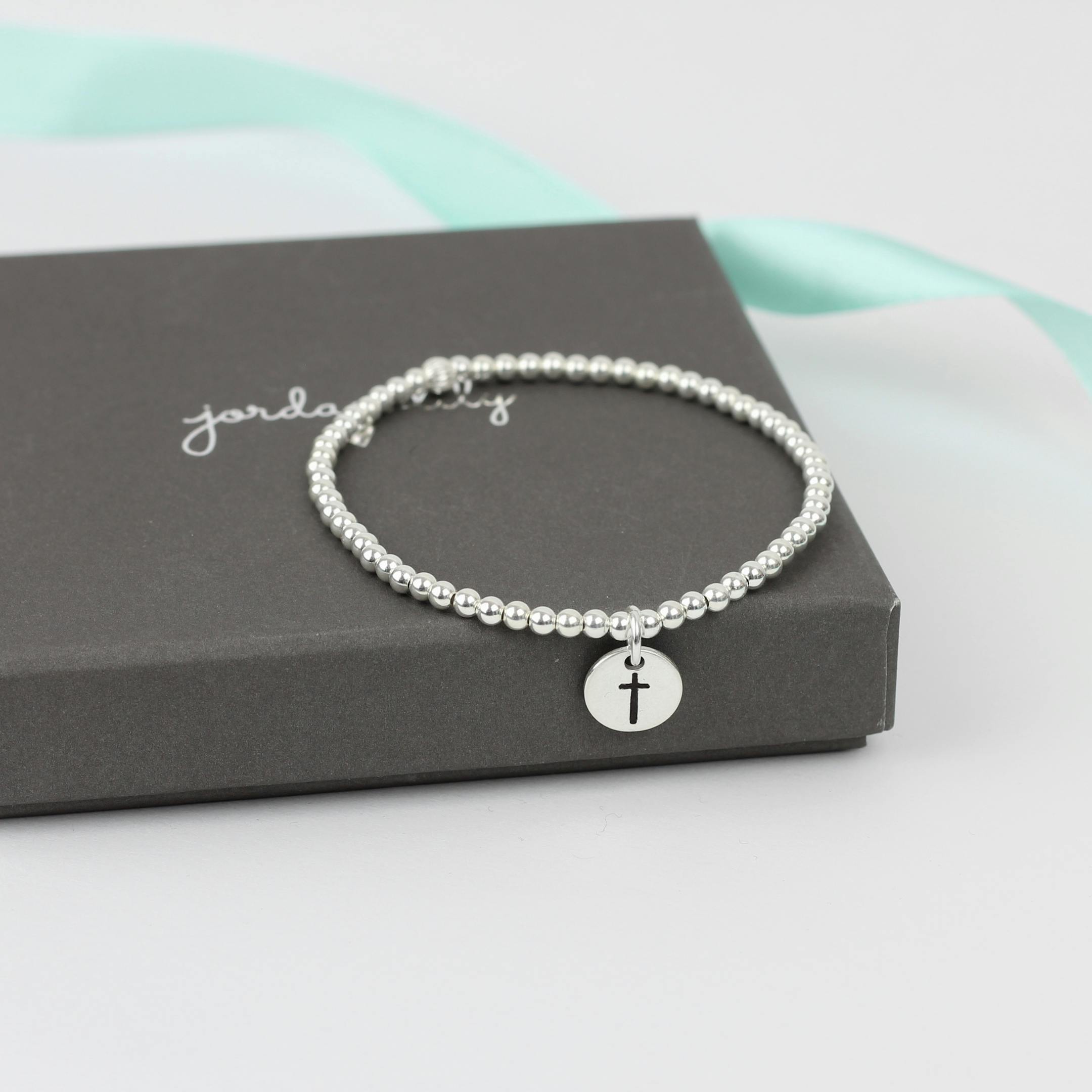 Handmade in my home workshop in Cornwall, these beautiful bead bracelets are made from solid sterling silver beads threaded onto strong elastic and finished with one of my dainty hand-stamped Cross charms.