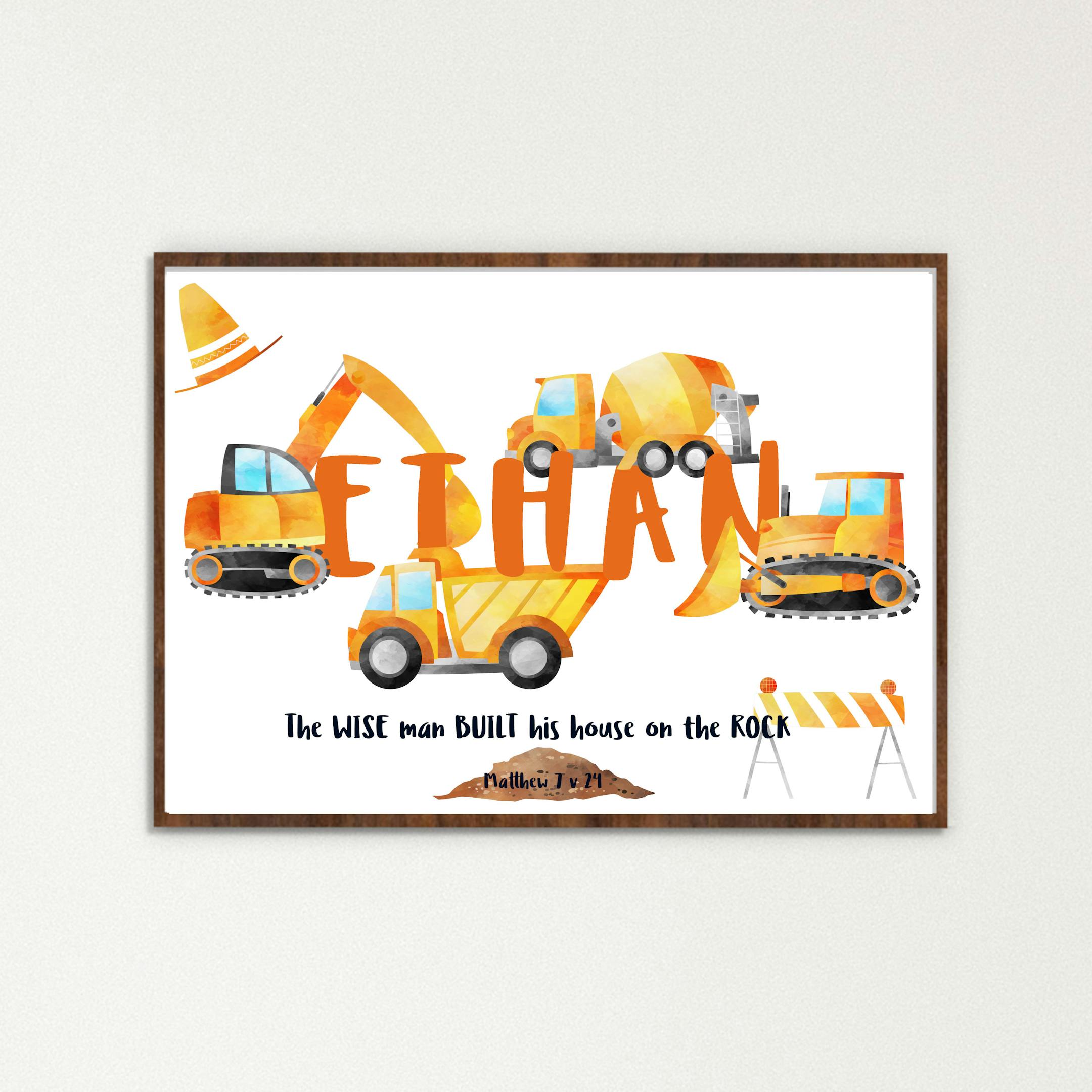Decorate your home, bedroom or nursery with this beautiful and cheerful construction name print, or give as a perfect gift to a friend or loved one for a birthday, new baby gift, christening or dedication.