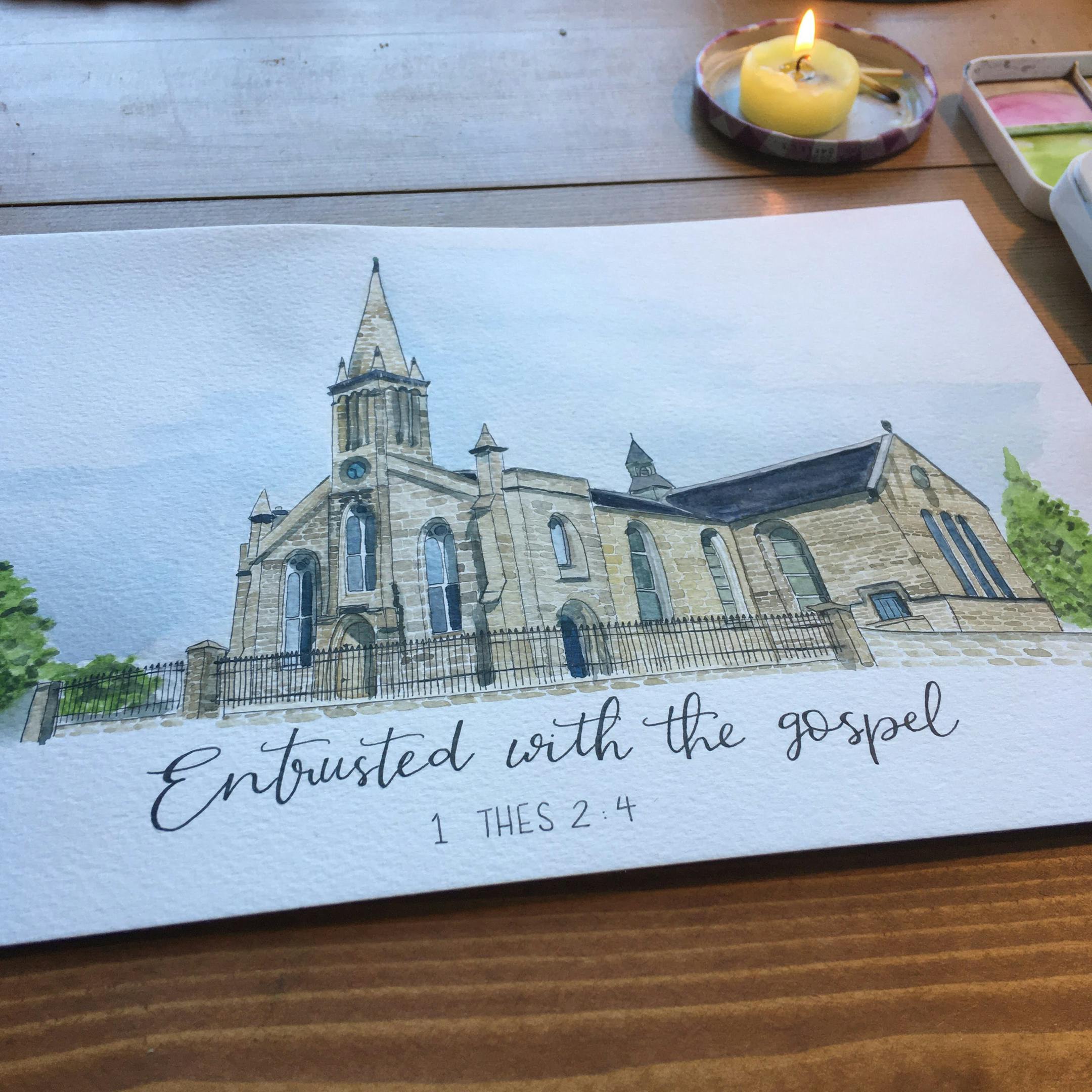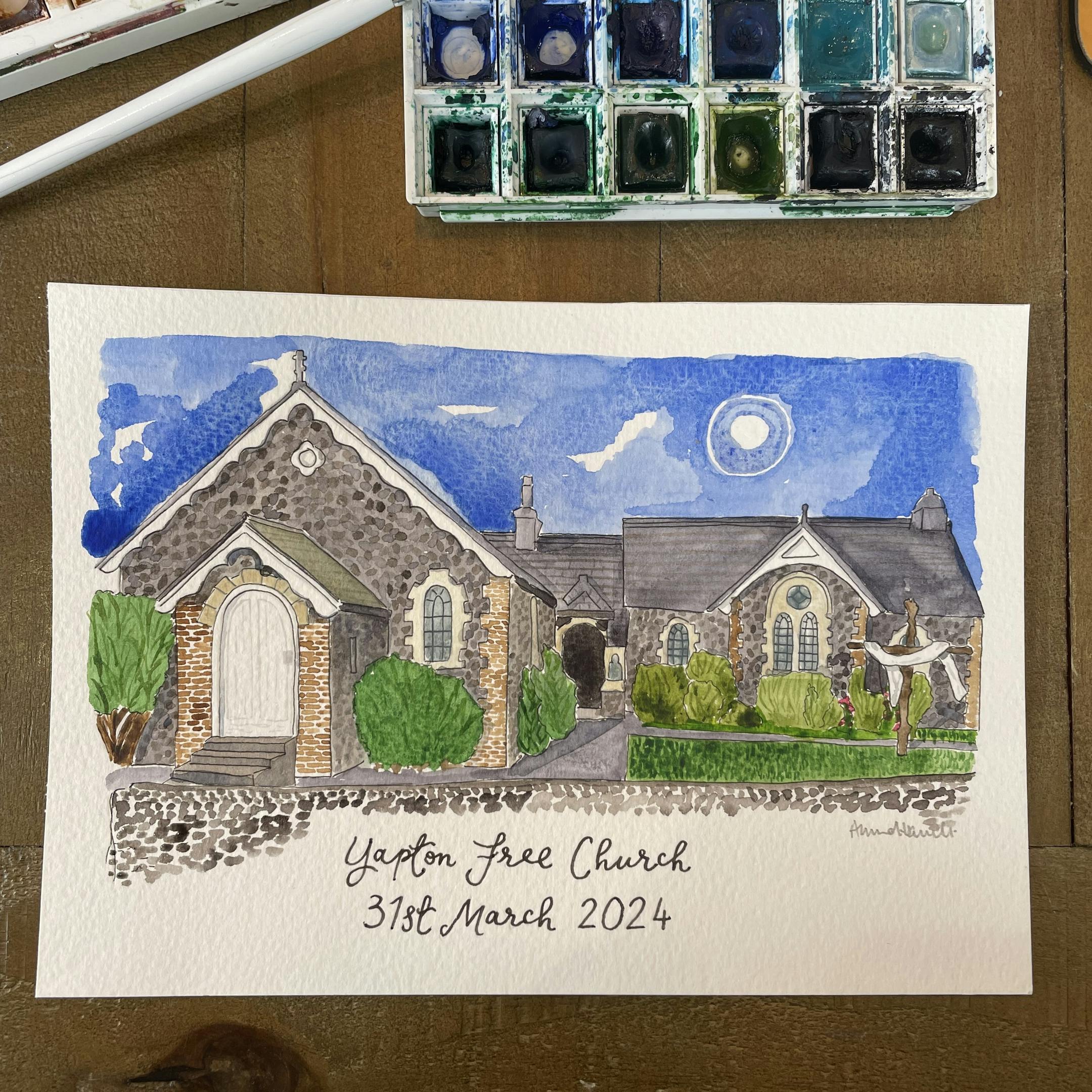 Commission a personal and unique A4 watercolour painting of your home, wedding venue or church with modern calligraphy lettering.