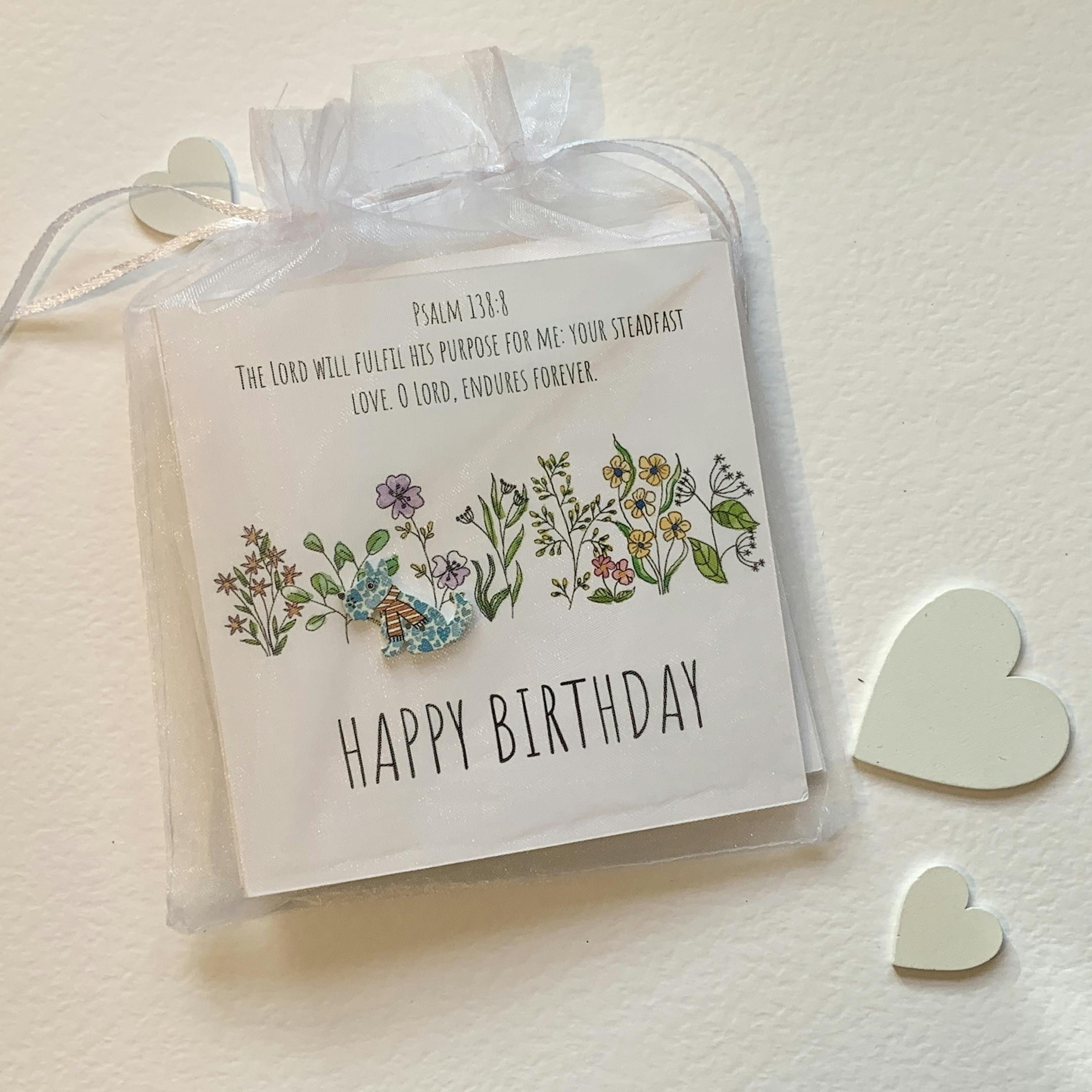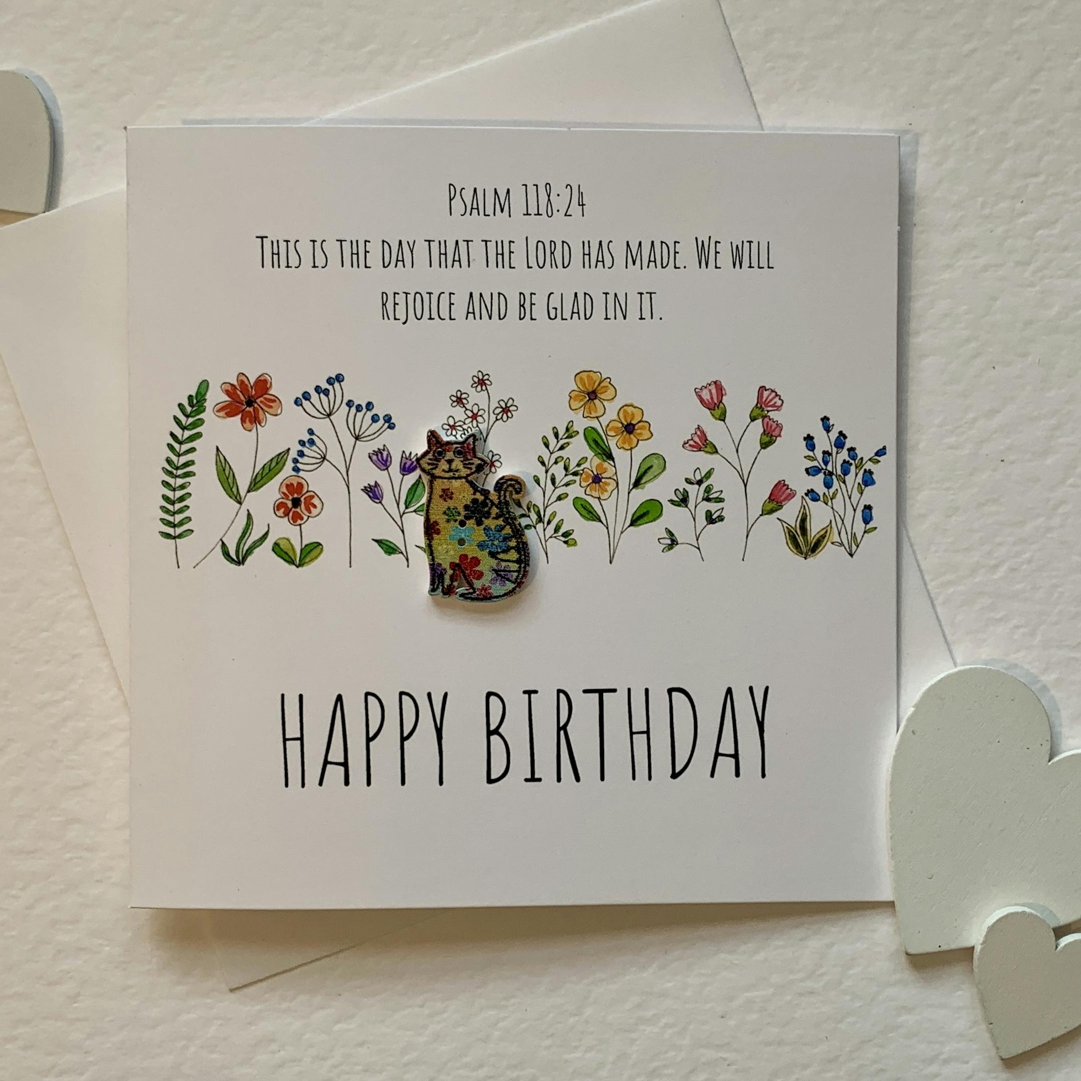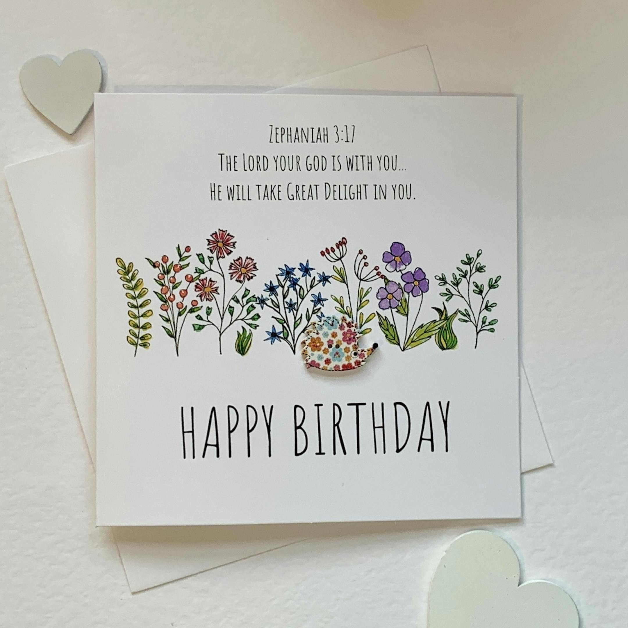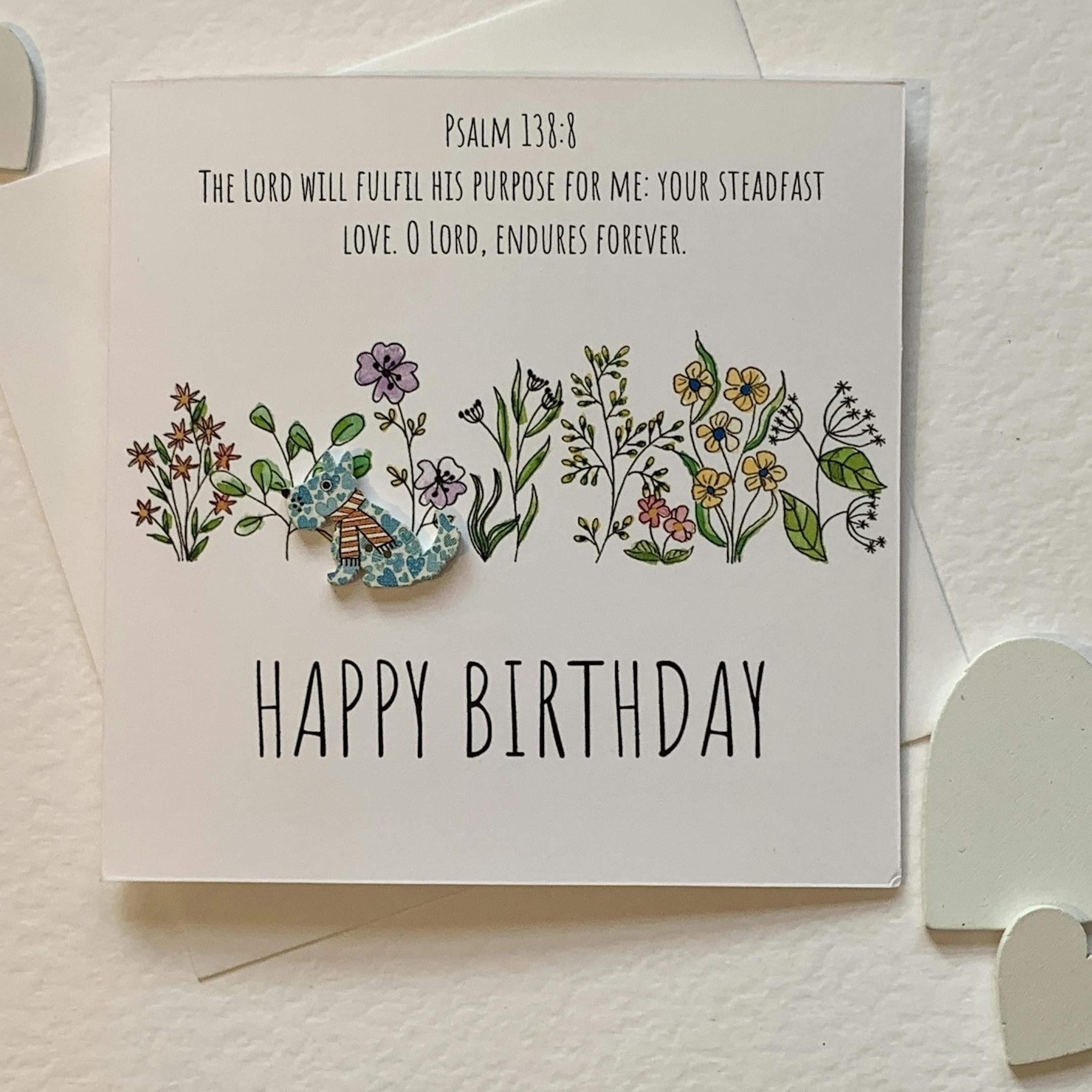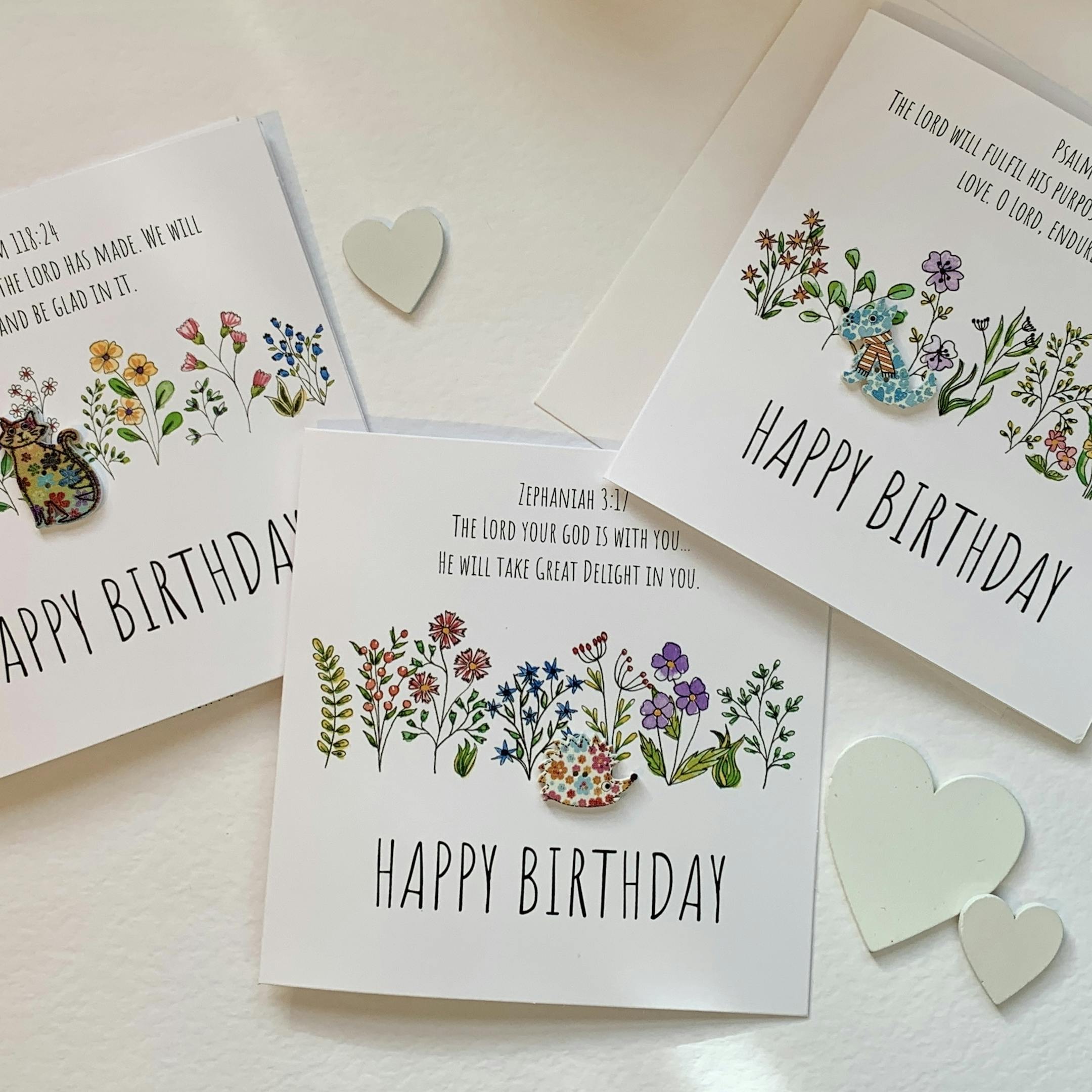 3 Christian Birthday cards. Botanical artwork embellished with wooden buttons. Each card has an encouraging bible verse. dog, cat, hedgehog