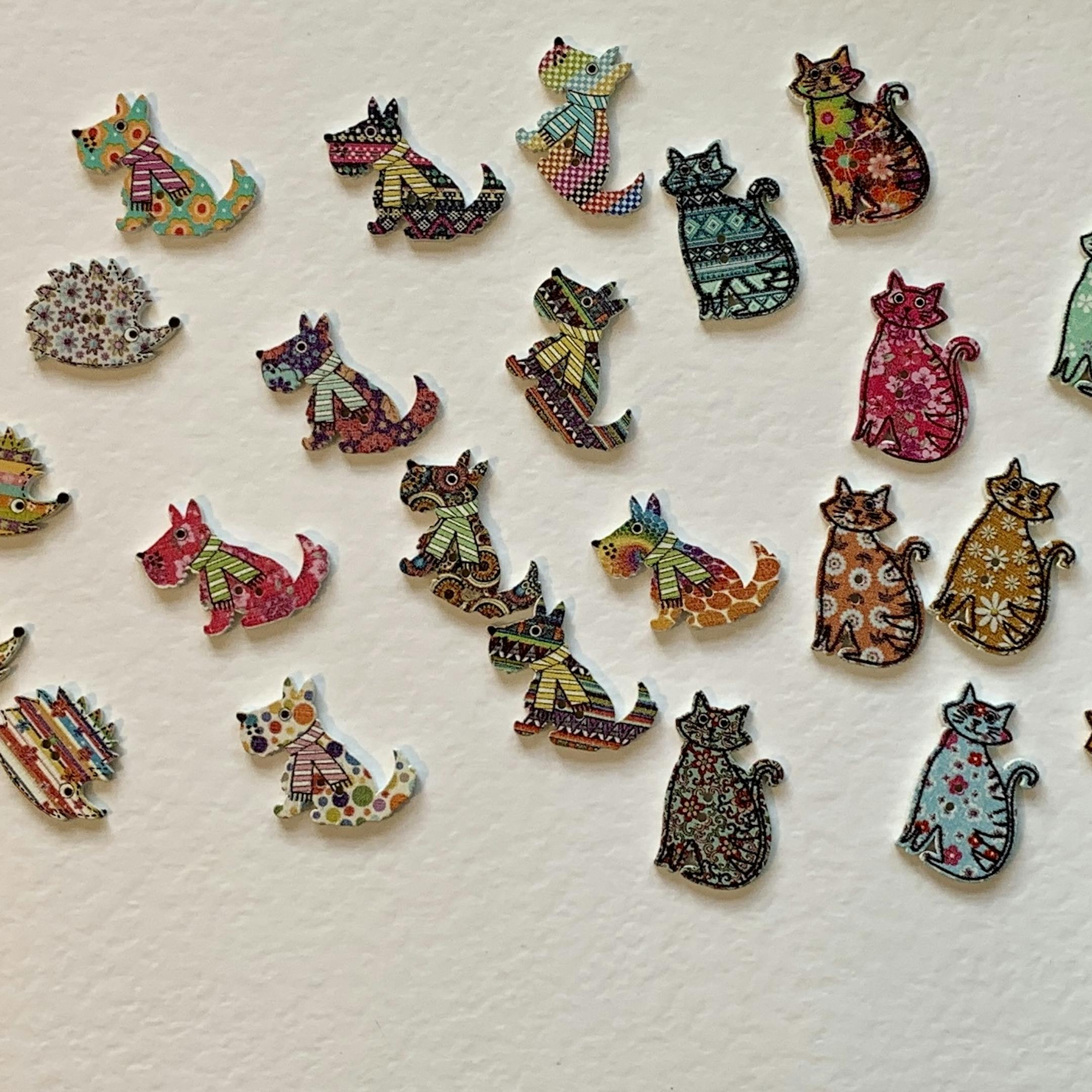 Great value pack of Christian Birthday cards with beautiful line and wish botanical images which are embellished with a whimsical wooden buttons. : one dog, one cat and one hedgehog. The buttons come in random colours and patterns some of which are shown n the photos. All the buttons are delightful!