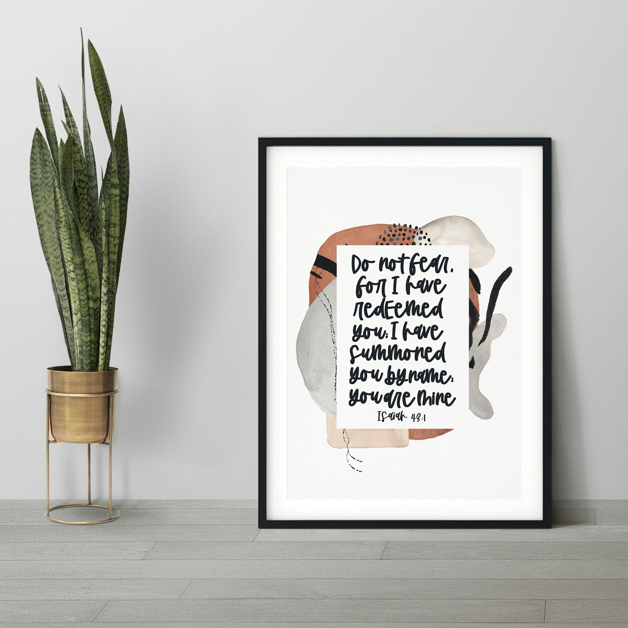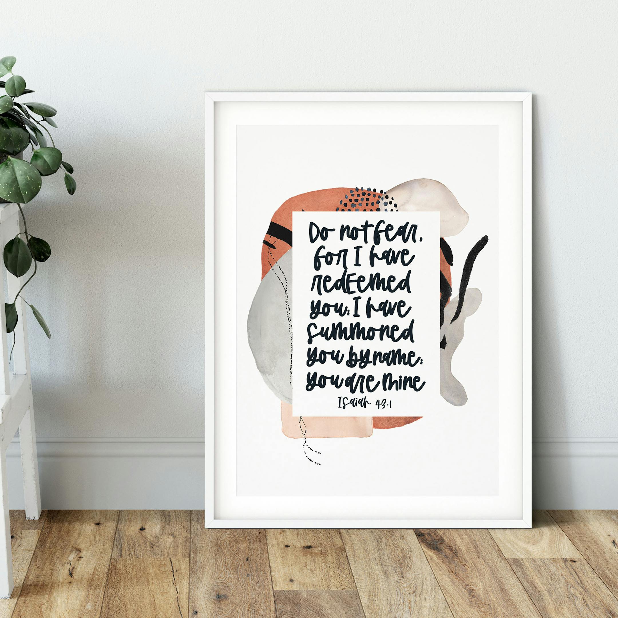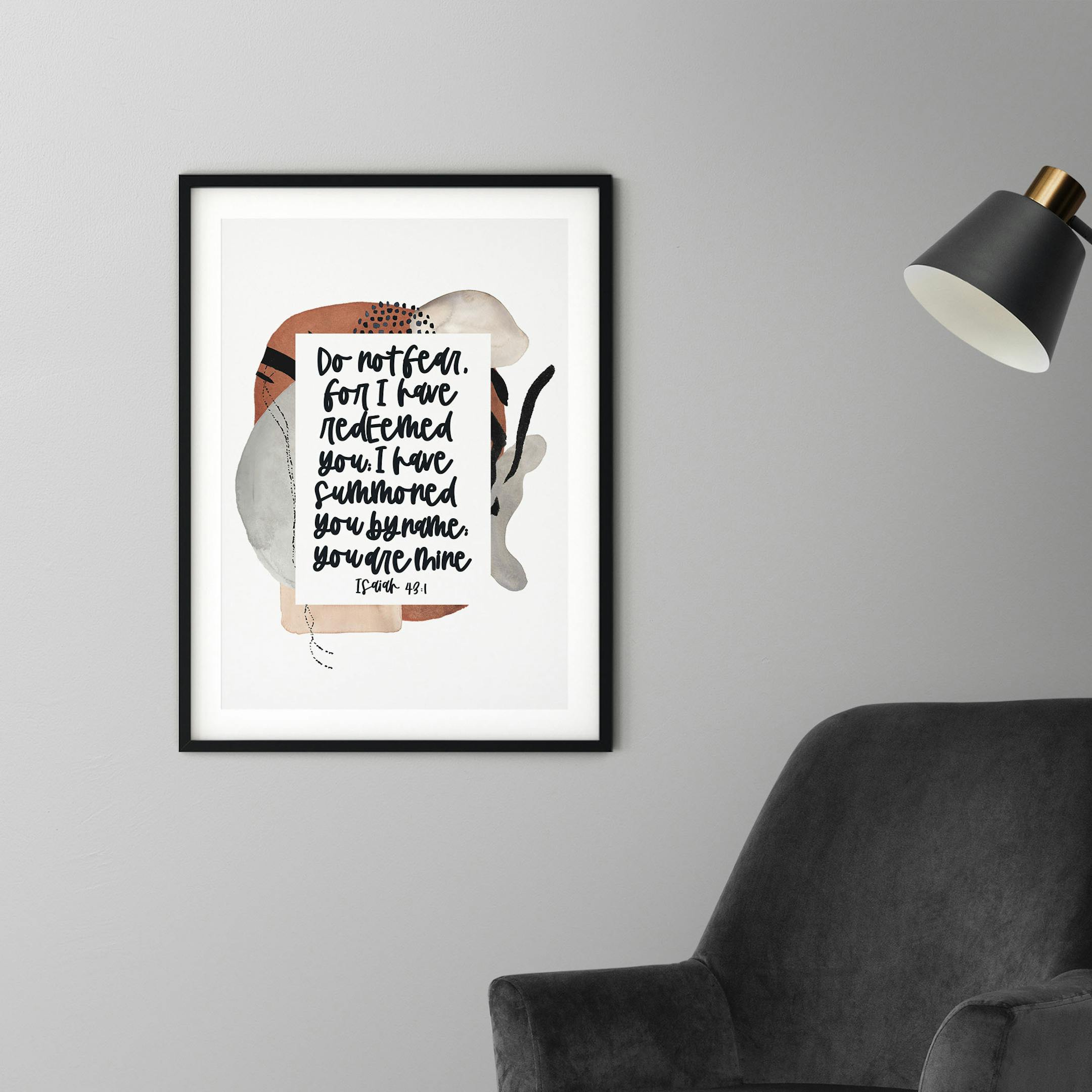 This beautiful, watercolour wall print features the verse, 'Do not fear, for I have redeemed you; I have summoned you by name; you are Mine,' from Isaiah 43:1. The modern black typography sits over an abstract, water colour image that features a warm orange, grey and black design