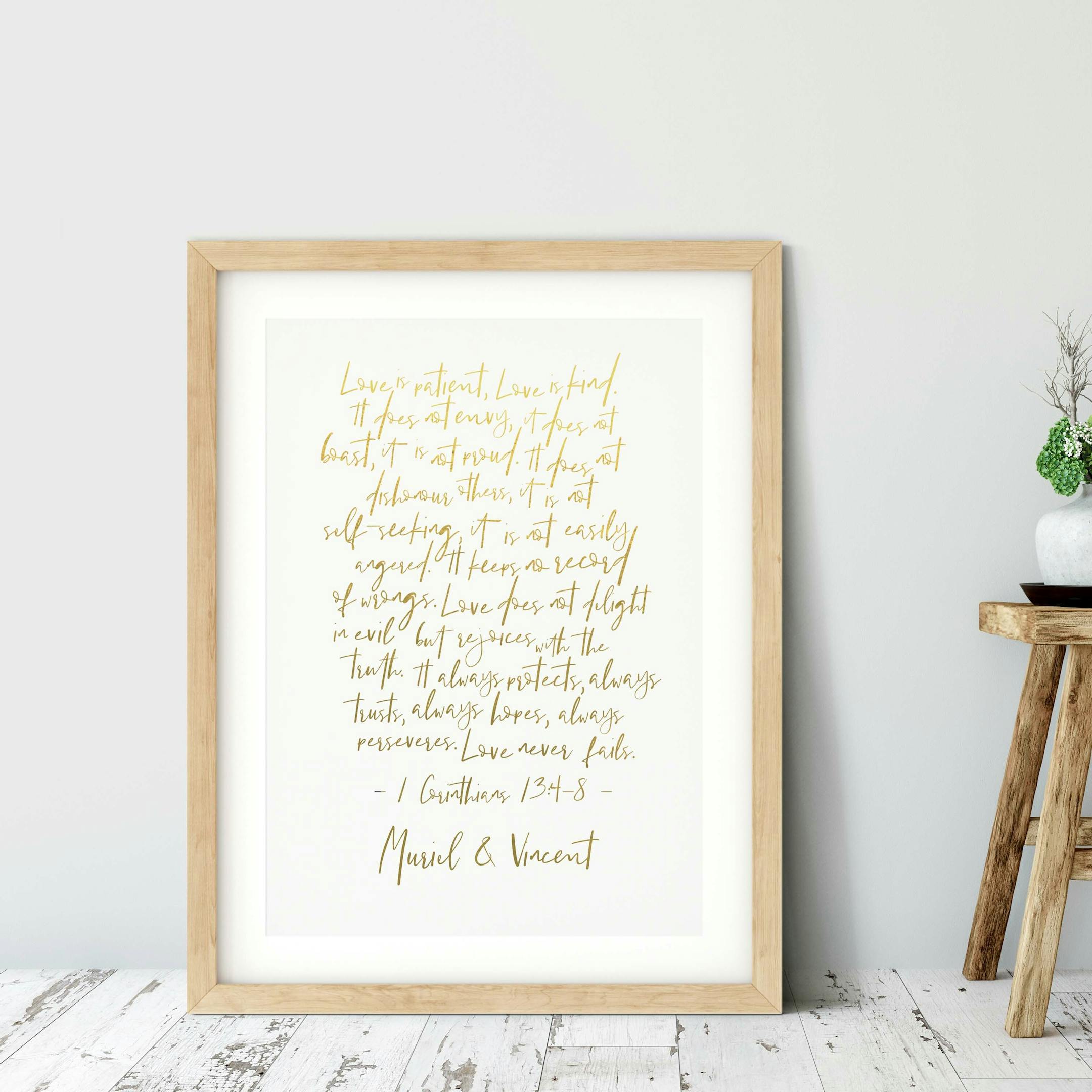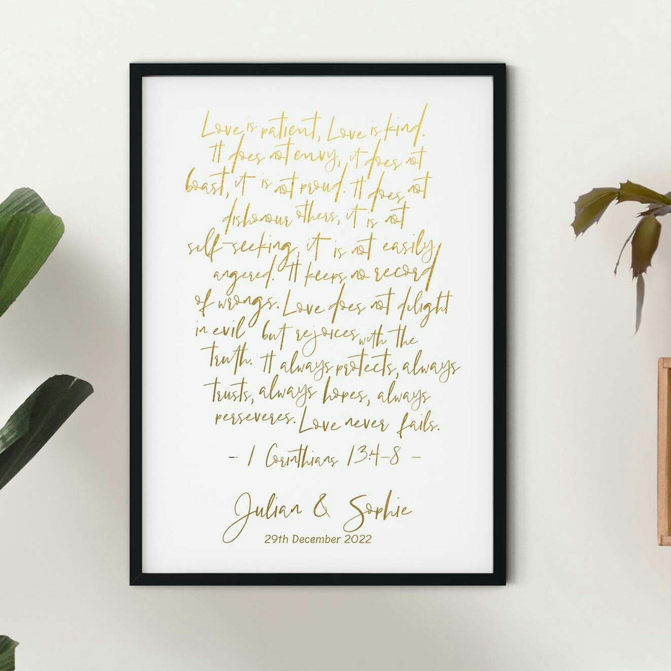 A personalised, gorgeous, print that features the wonderful words of love from 1 Corinthians 13:4-8 in a modern gold-ombre typography.