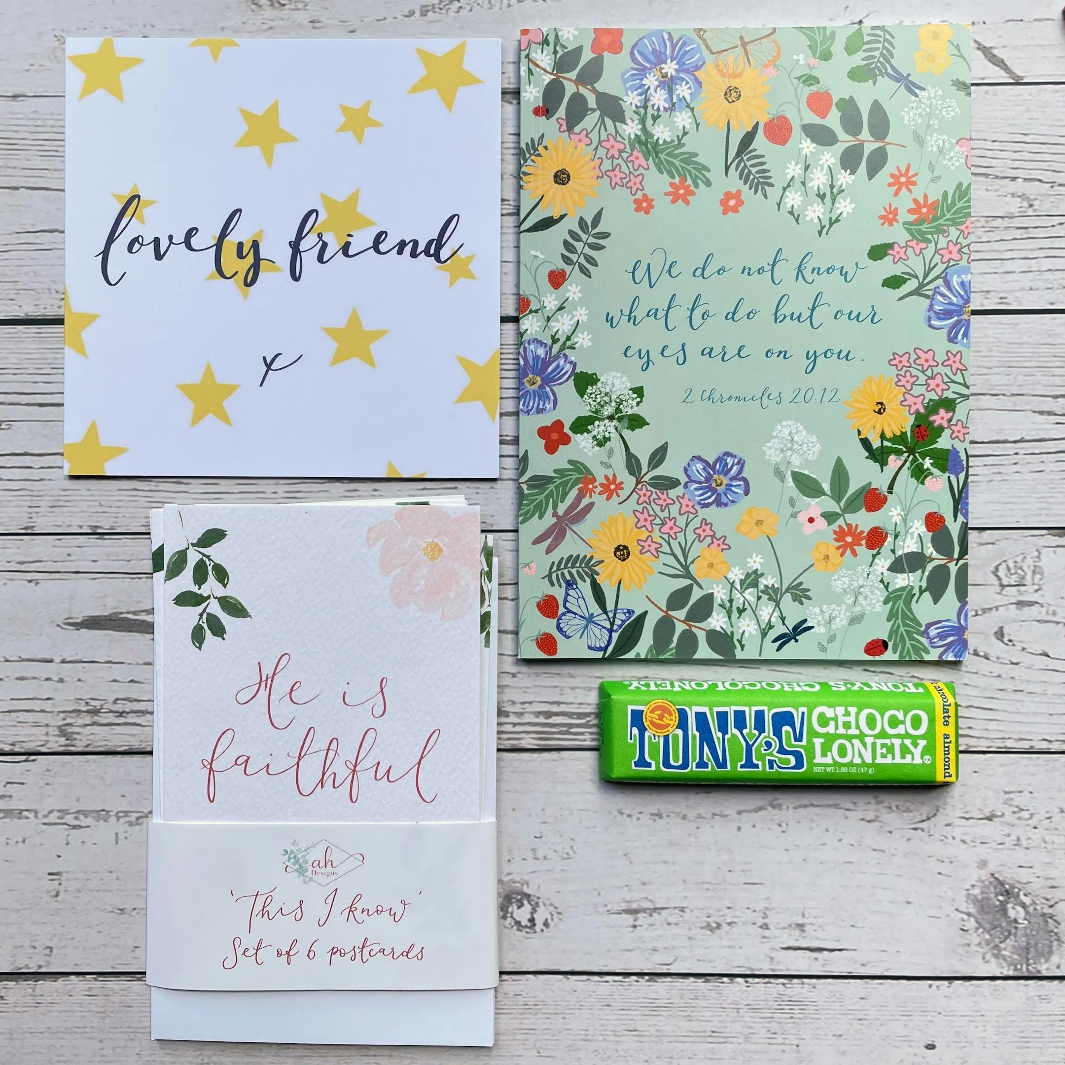 Includes a 72 page A5 prayer journal, some hand lettered postcards with attributes of God, a small bar of slave-free chocolate and a card of your choice!