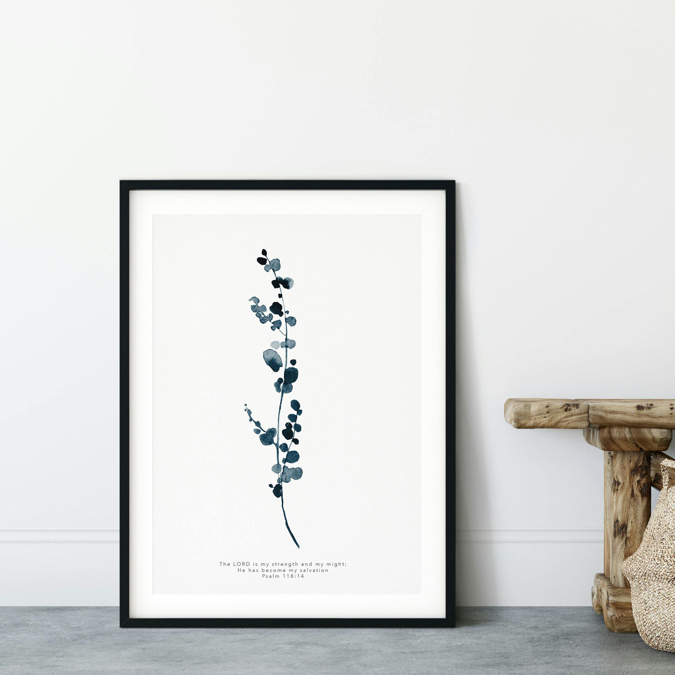 Eucalyptus Botanical Indigo Blue (2) Print - The Lord Is My Strength And My Might Print - Psalm 118:14
