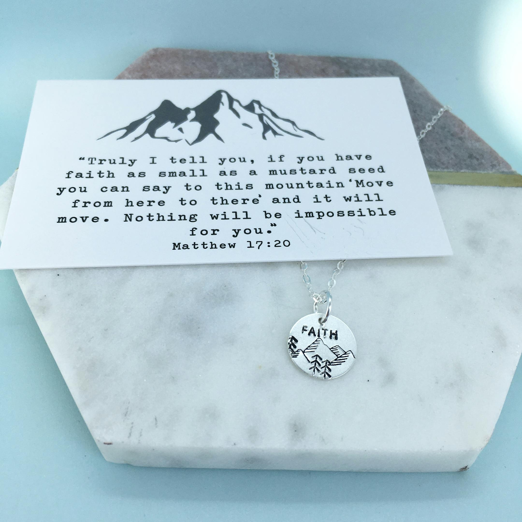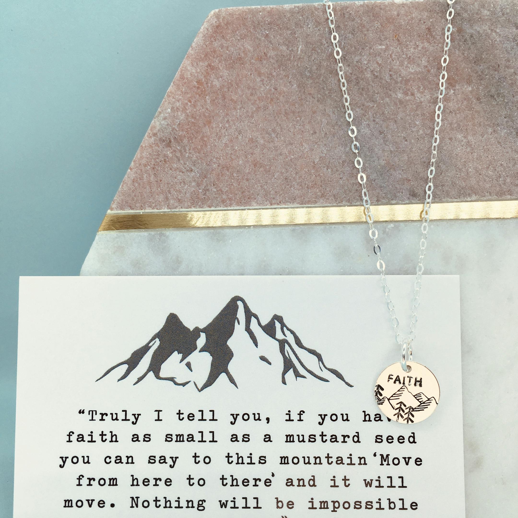 This pendant is inspired by Matthew 17:20 to be worn as a reminder that a little faith goes a long way and that God is faithful when we put our trust in him.