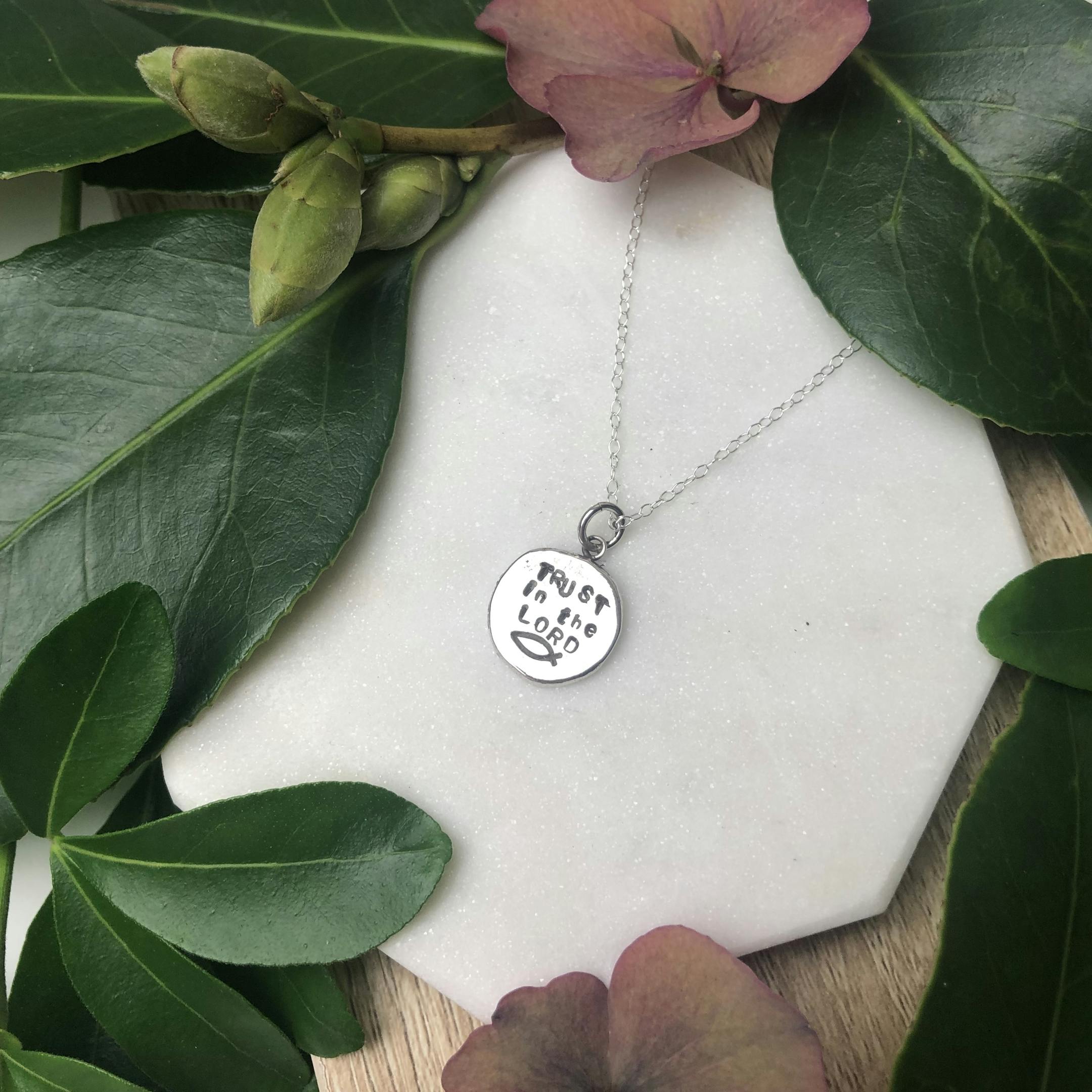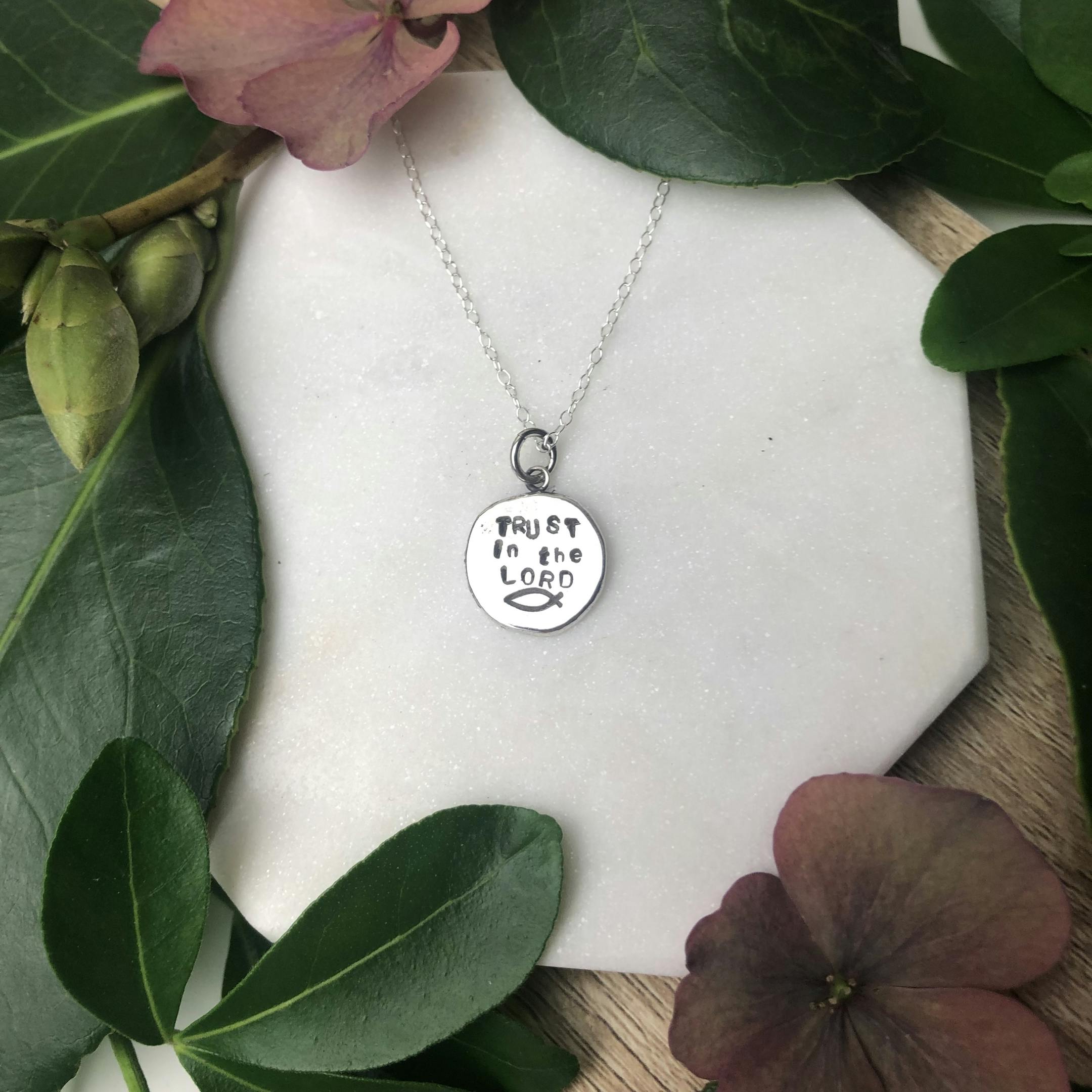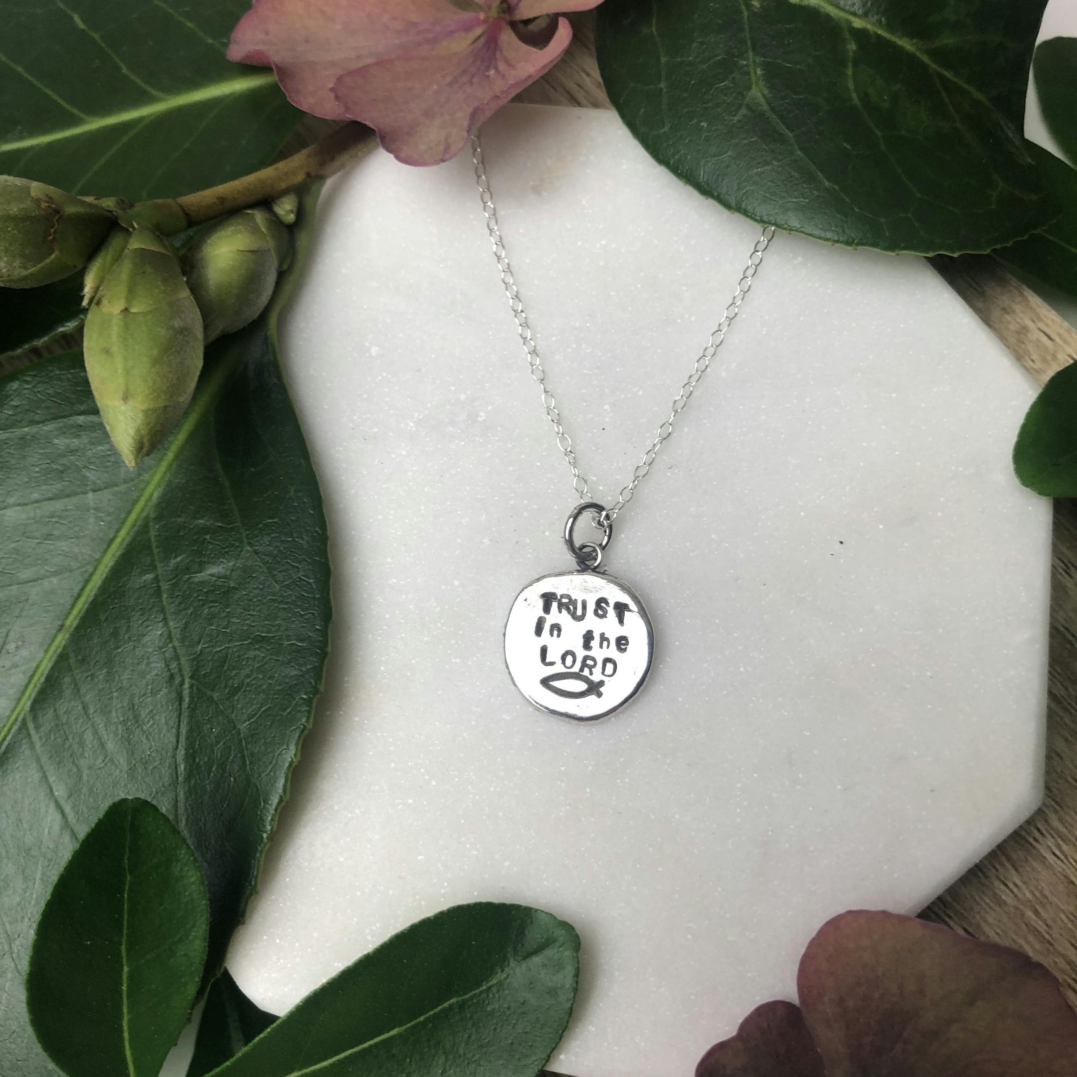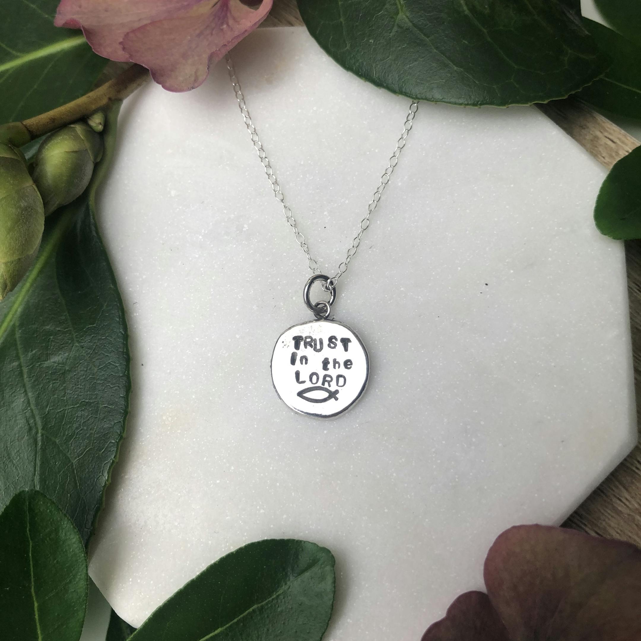 Sterling silver rock pendant with hand stamped design reading ‘Trust in the Lord’. Hand forged and suspended from an 18 inch silver chain.