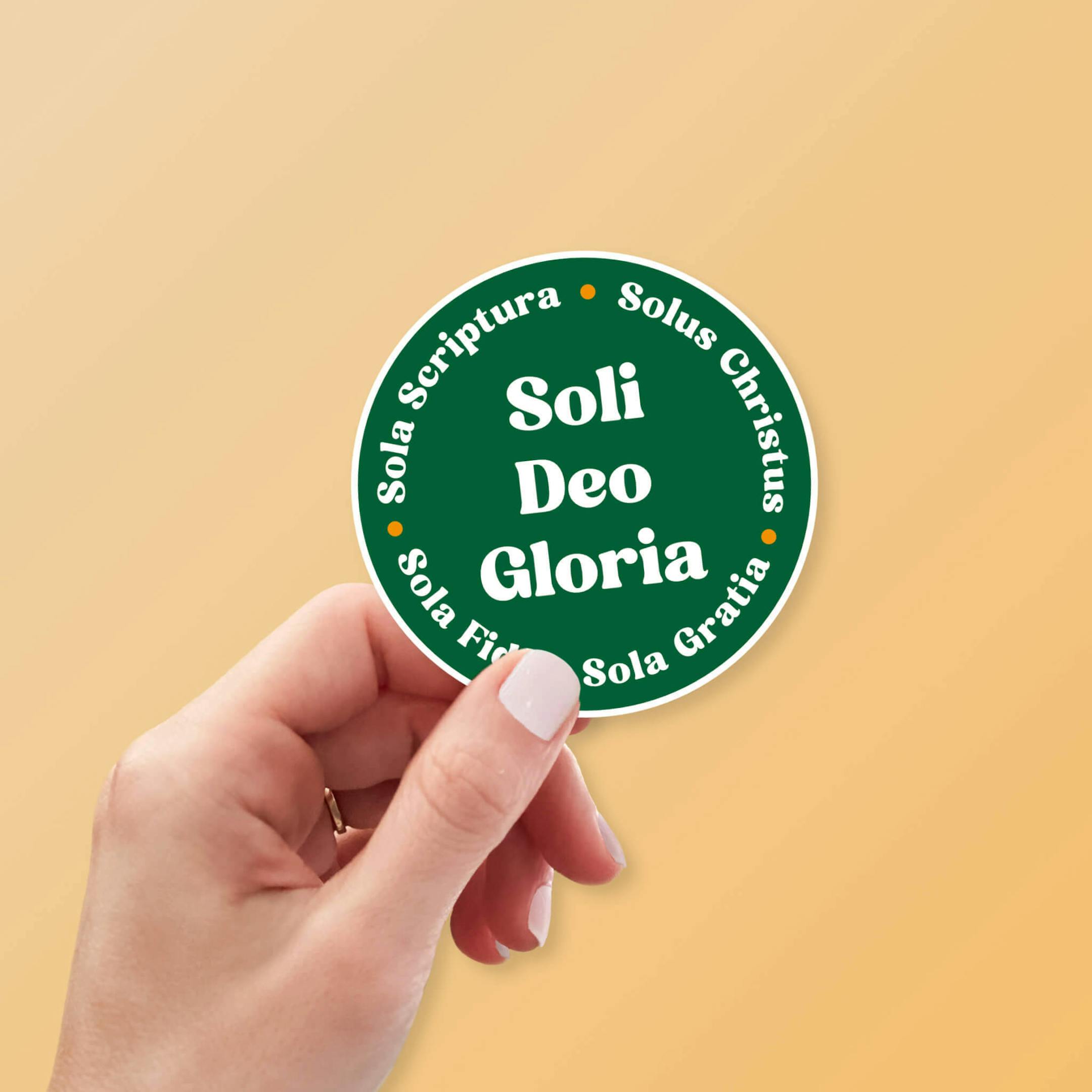 A shiny vinyl sticker with the 5 solas of the Reformation in white on a green background.