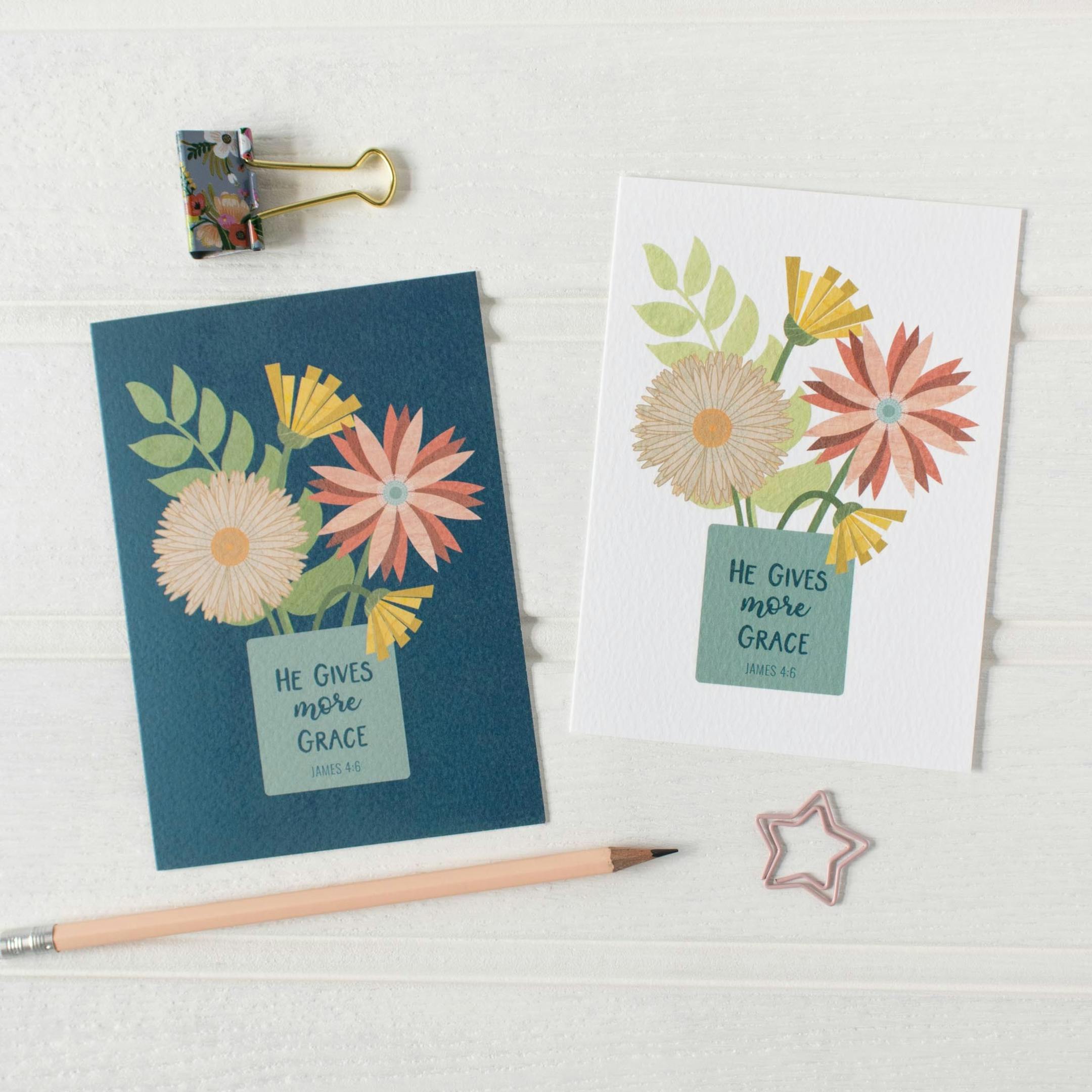 2 - 3) God Gives More Grace Card - Flowers in a vase with “He Gives More Grace” from James 4:6 lettered across the front. One card with a blue background and one card with a white background.