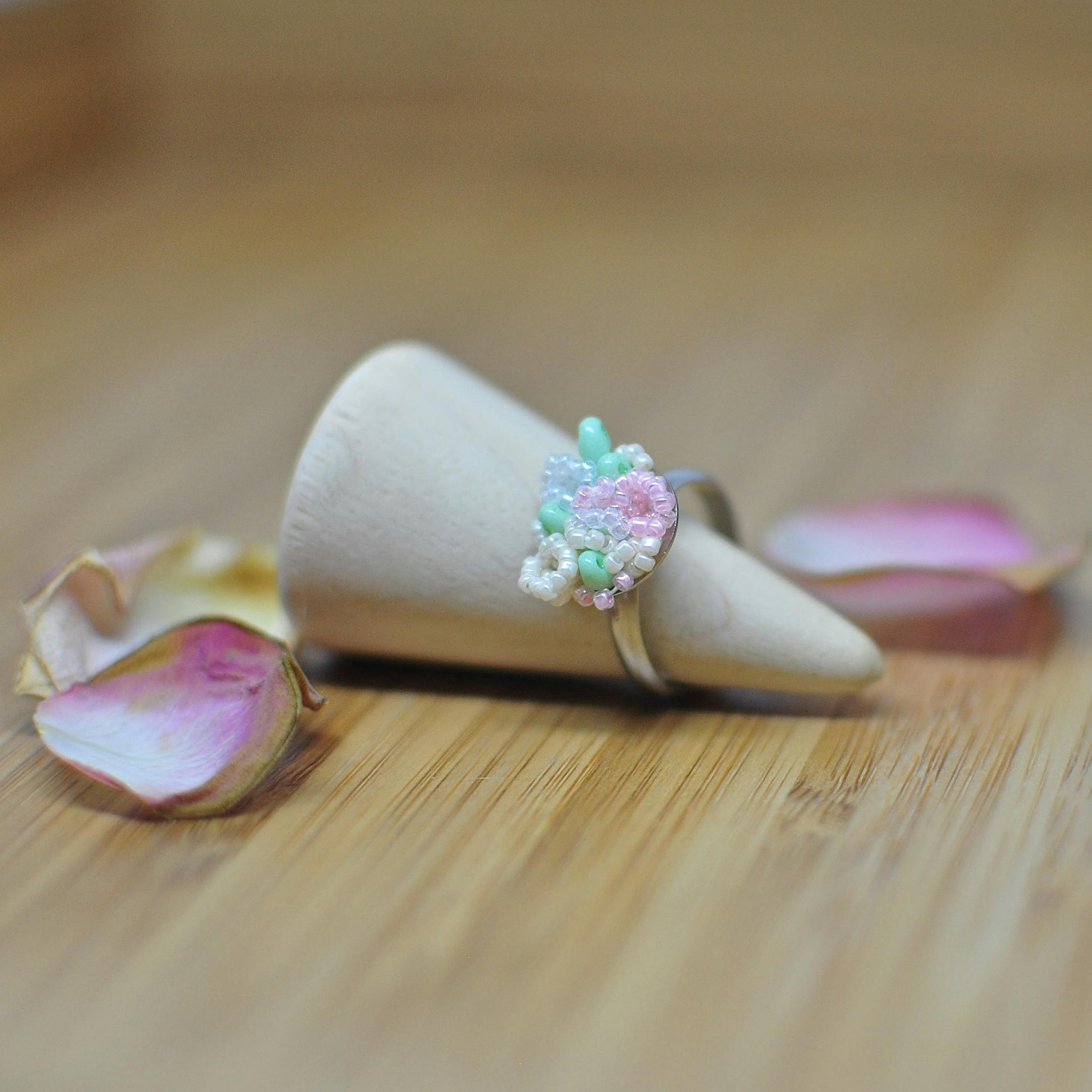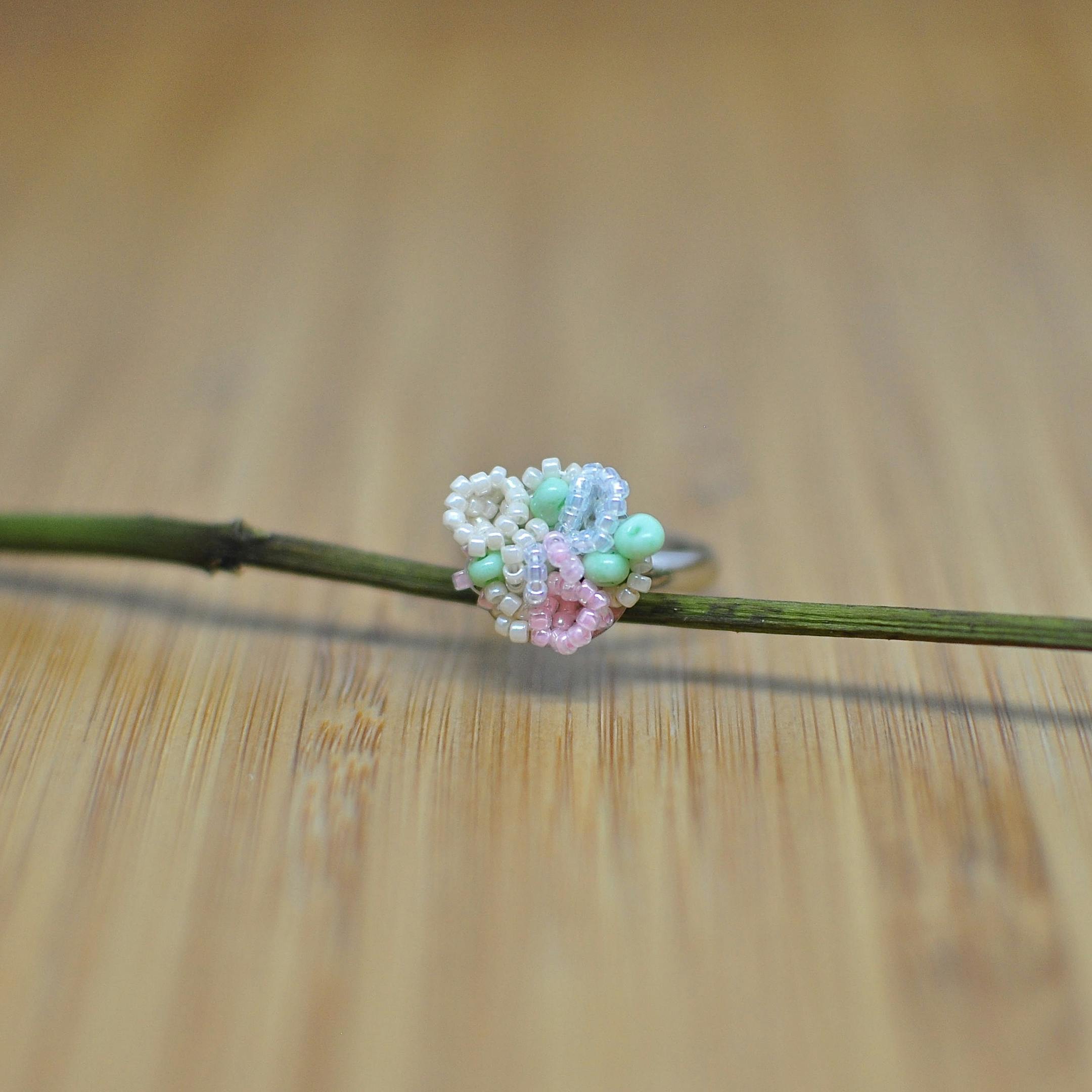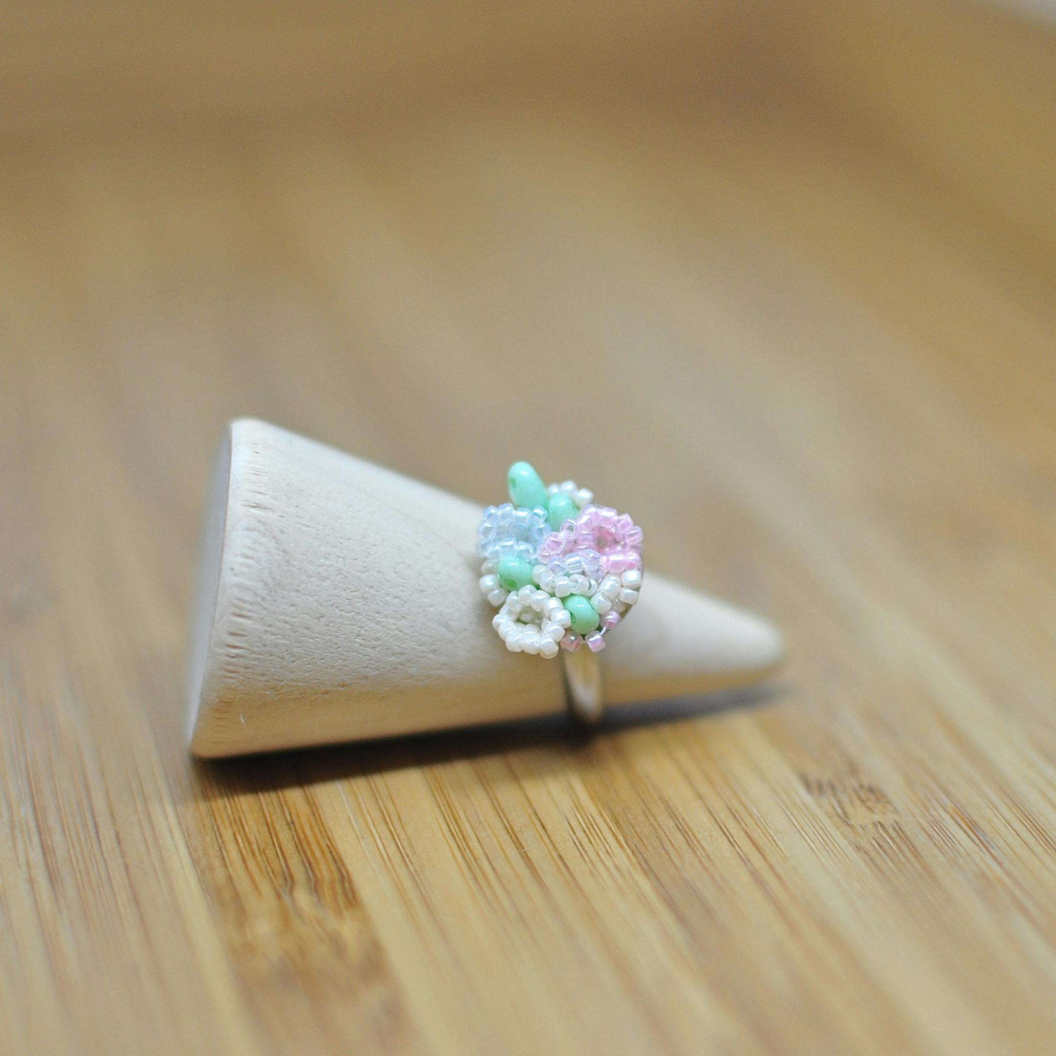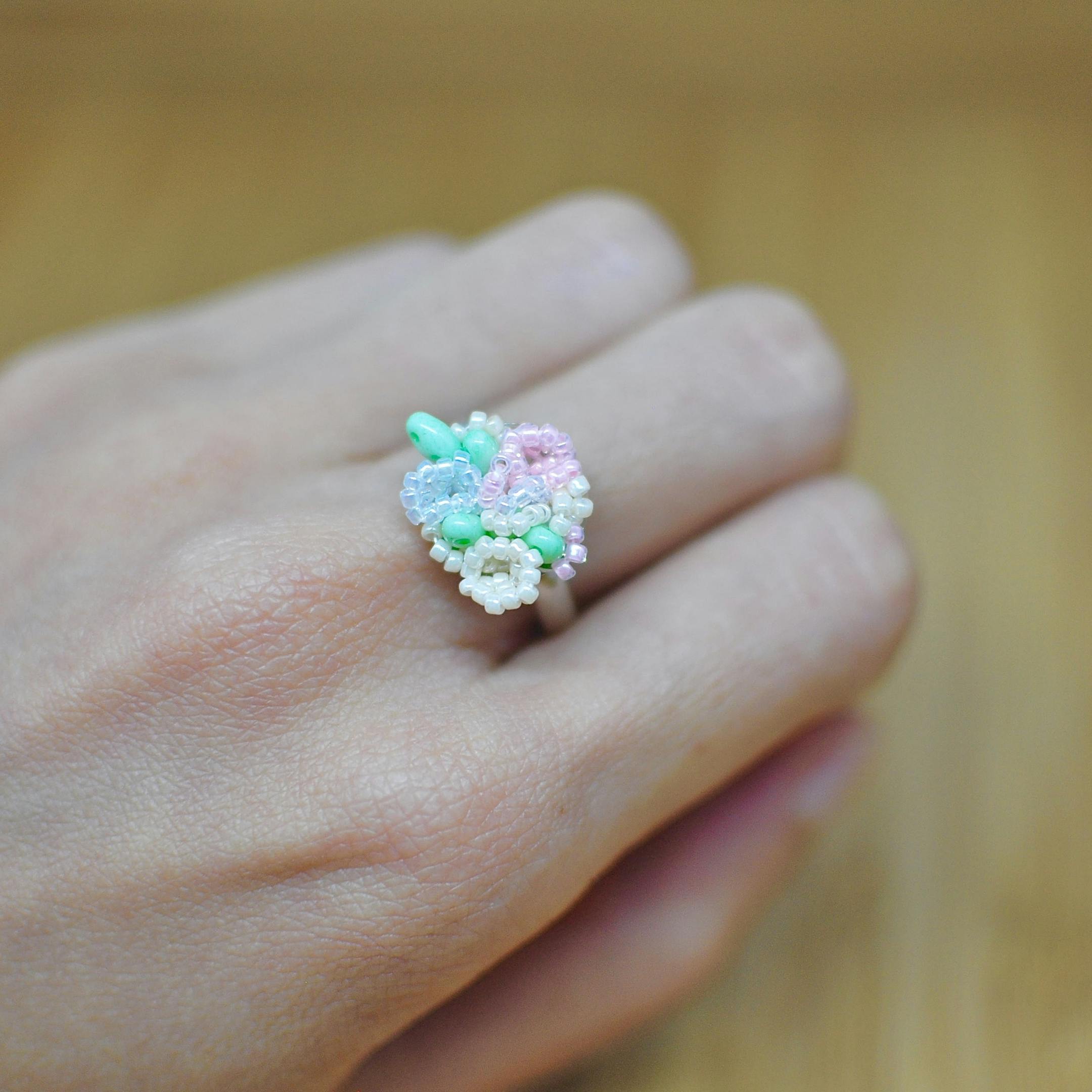 Delicately handmade from tiny Japanese glass seed beads, and stitched together with needle and thread. Ring base is silver-plated.