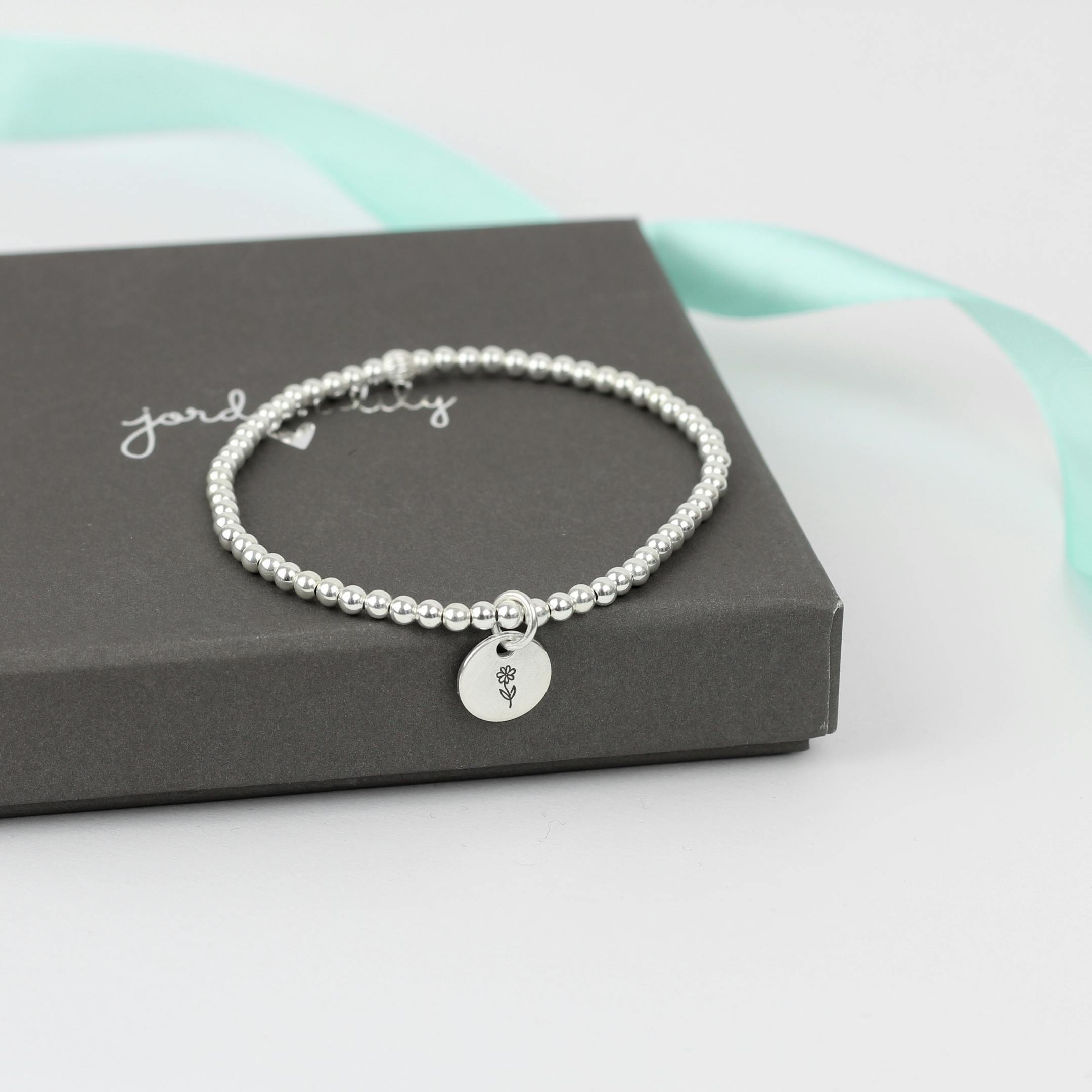 Handmade in my home workshop in Cornwall, these beautiful bead bracelets are made from solid sterling silver beads threaded onto strong elastic and finished with one of my dainty hand-stamped Flower charms.