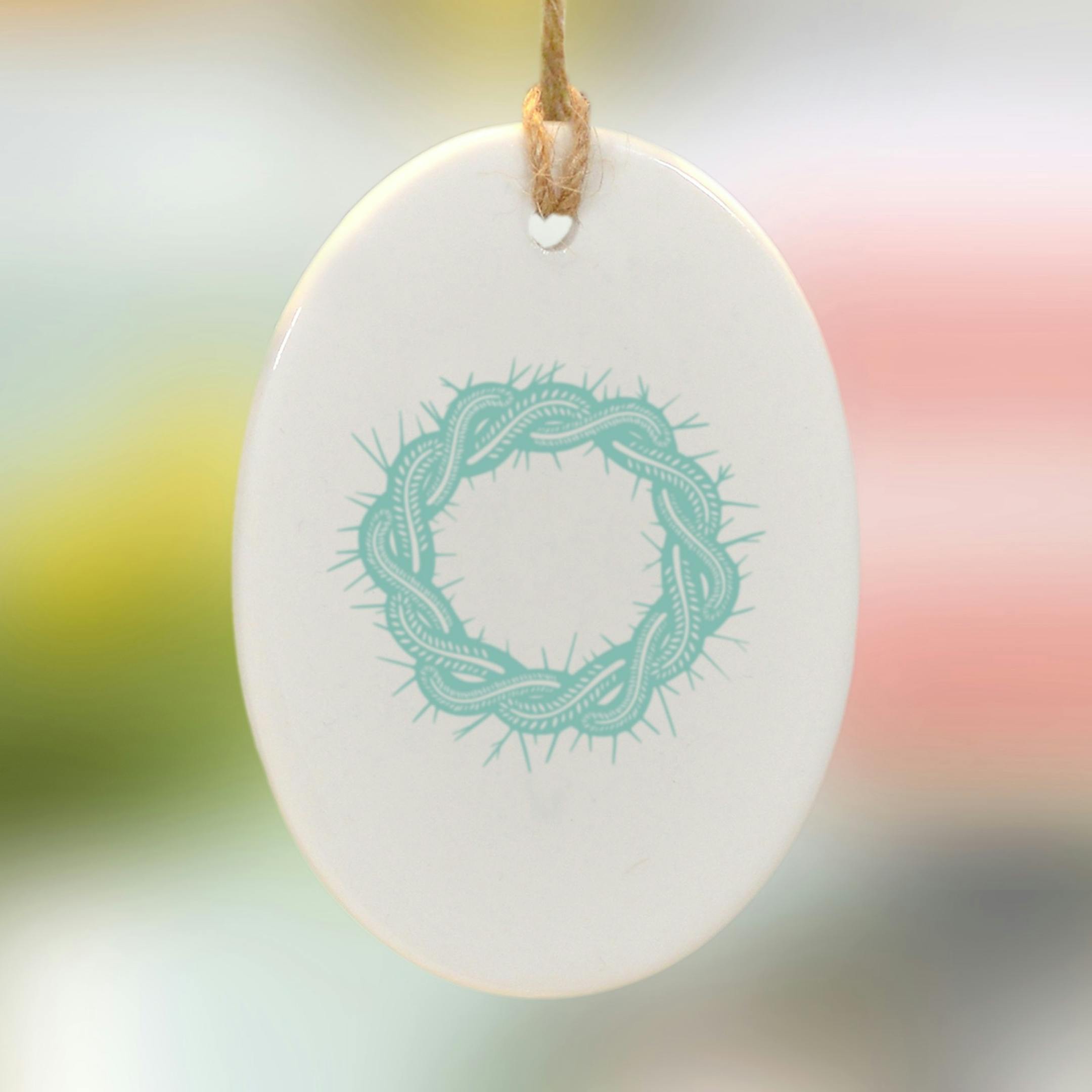 8.3cm tall, 6cm wide, printed ceramic decoration, hung on a twine thread. In this set of six, you get a Tomb, Palm Leaf, Three Crosses, Nails, Chi Rho and Crown of Thorns.