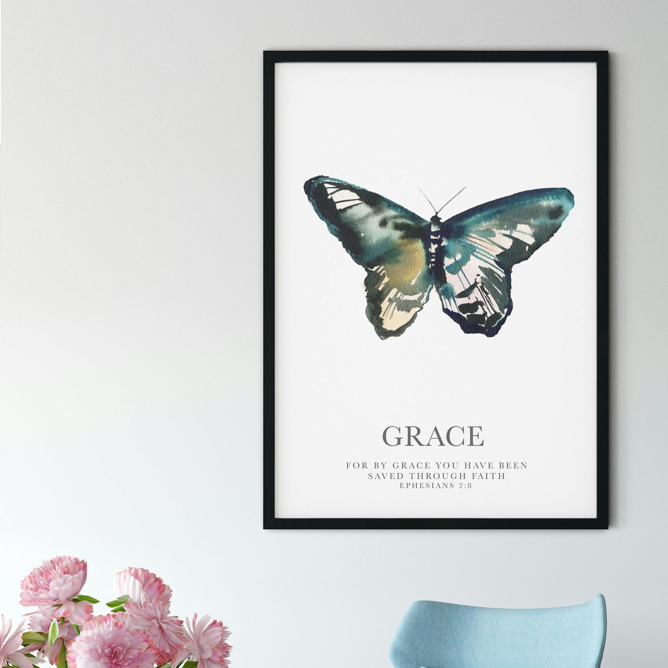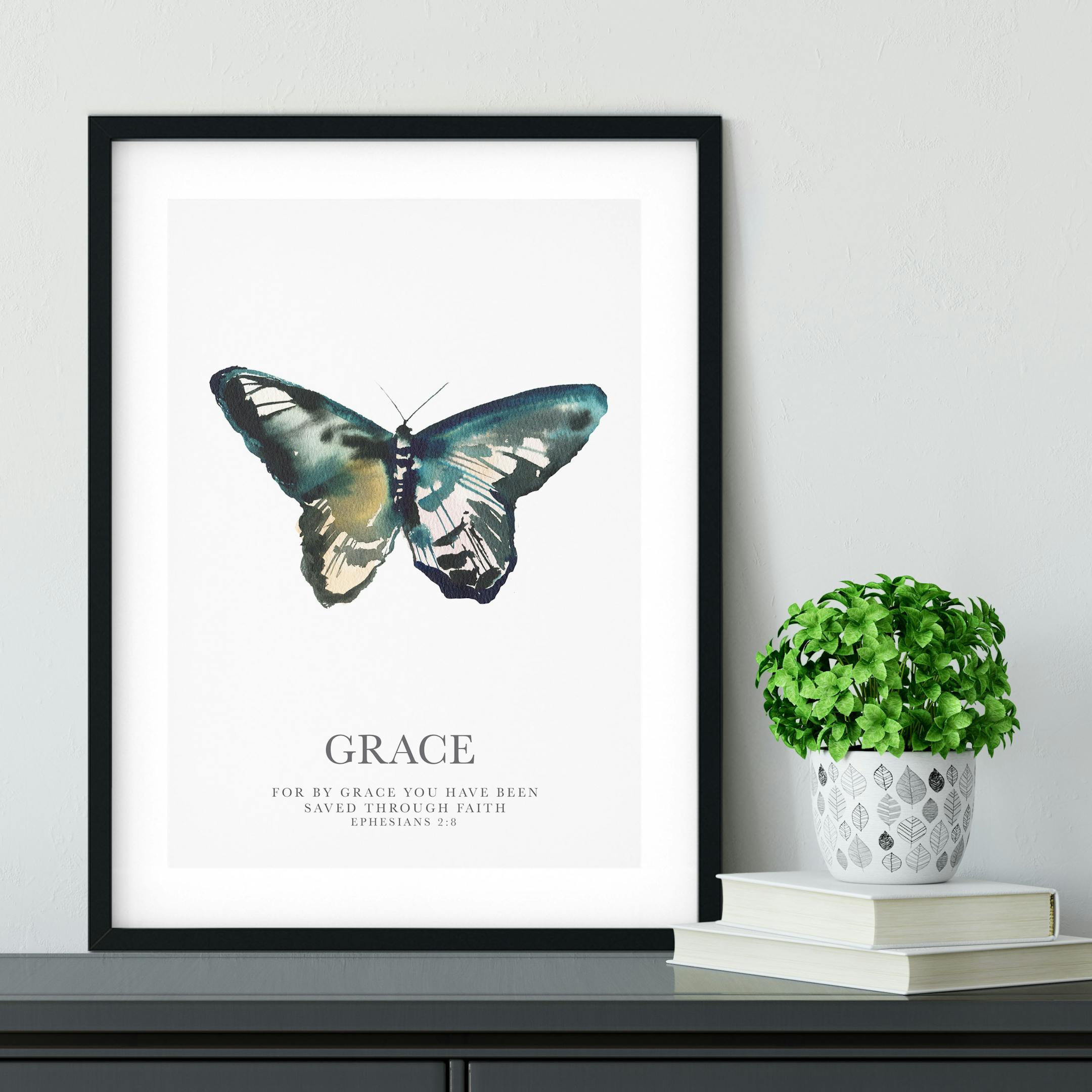 This beautiful, modern print features a hand painted, watercolour butterfly together with the verse from Ephesians 2:8.