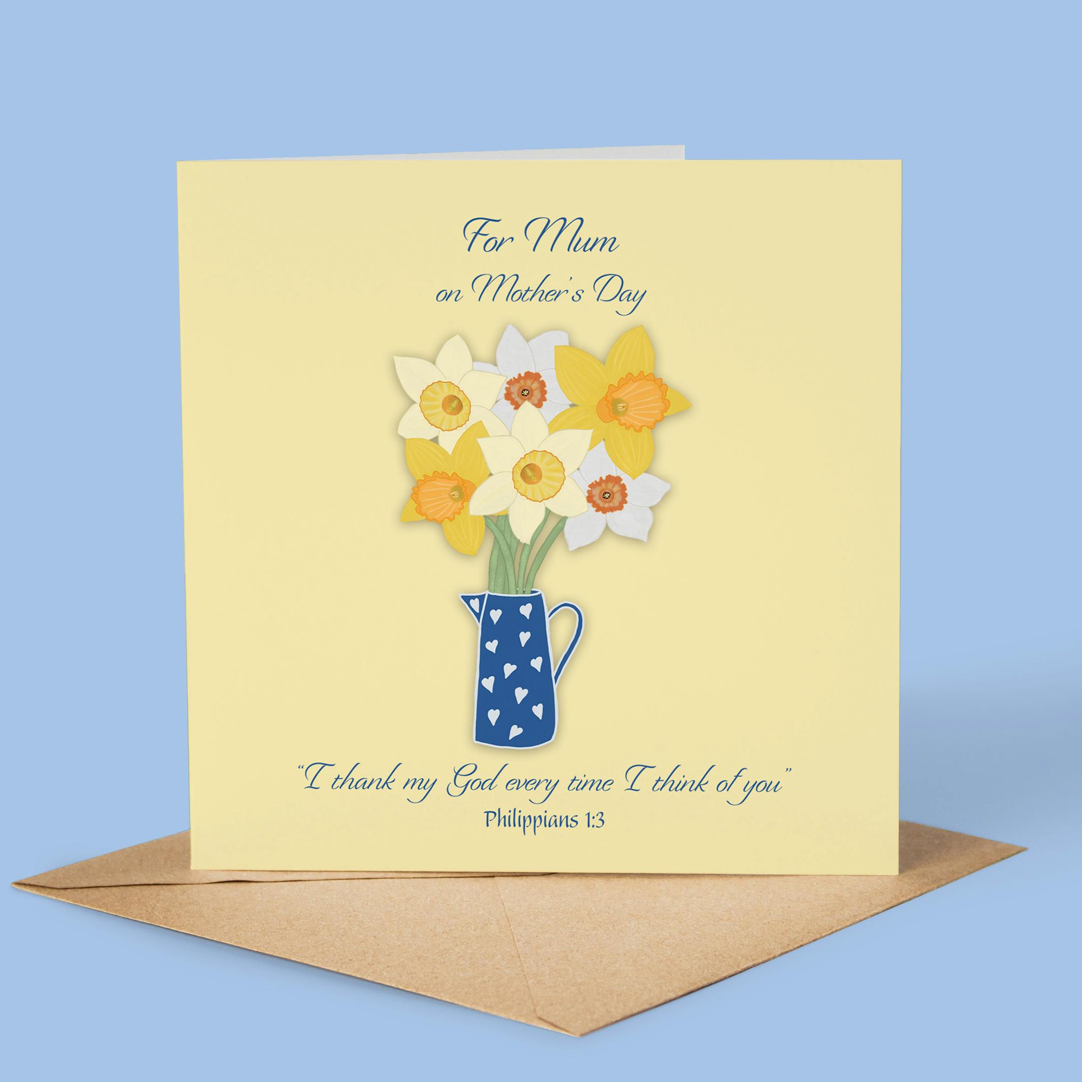 For Mum on Mother's Day, Daffodil Card, Philippians 1:3