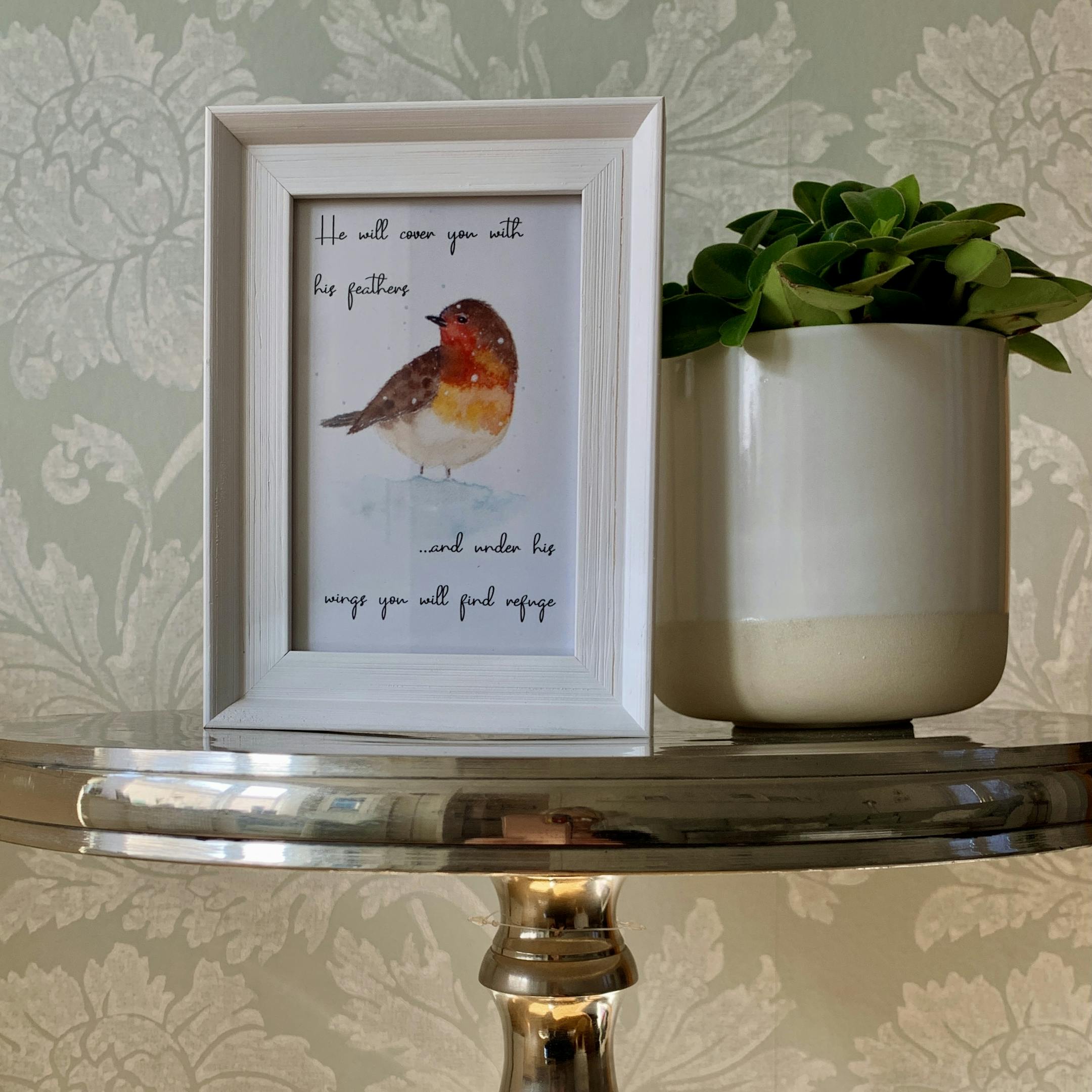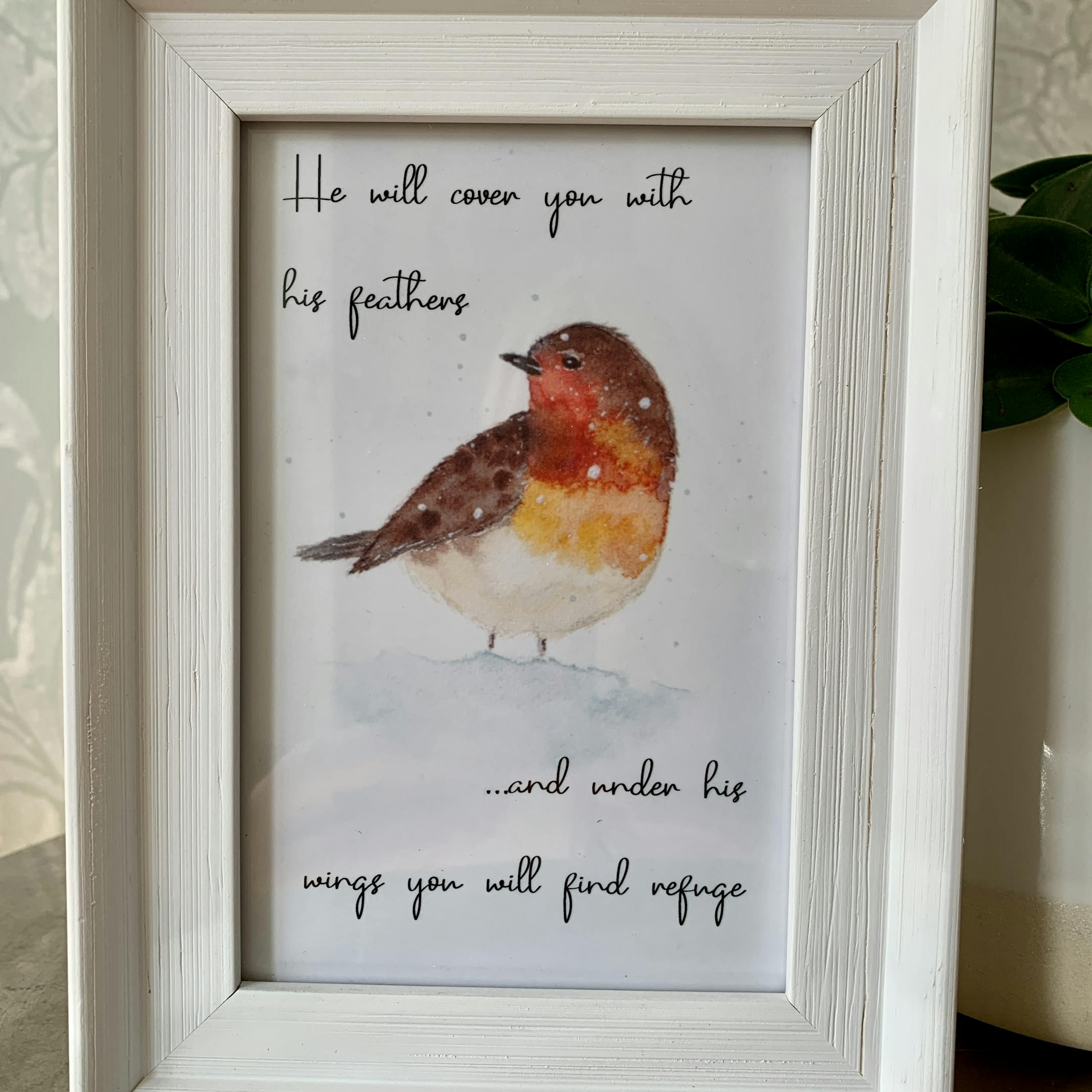 Framed mini print with the words, 'he will cover you with his feathers and under his wings you will find refuge' printed around a lovely watercolour robin.