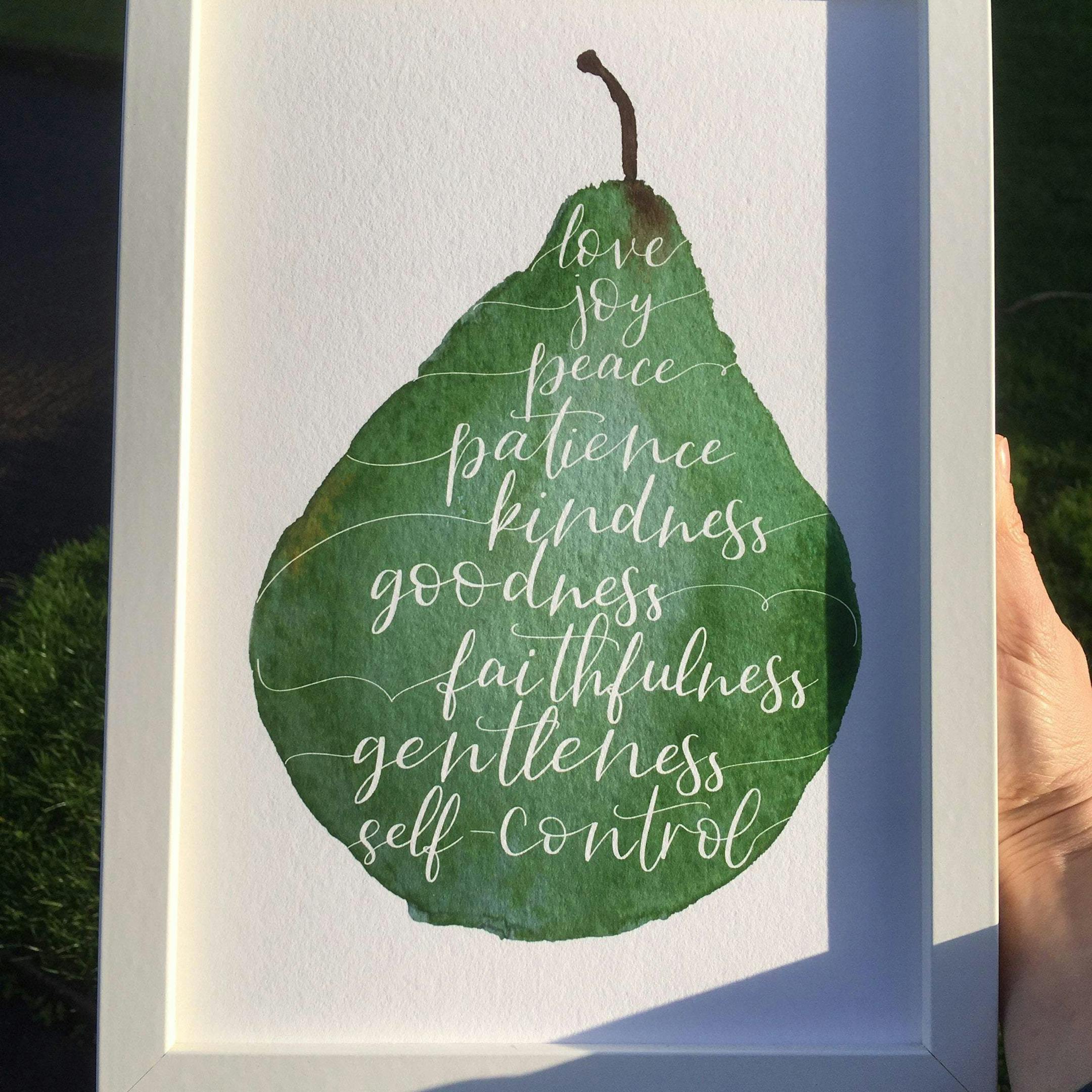This giclee wall art print is of an original design, using a mix of watercolour and hand lettering perfected digitally. The pear is painted in a lovely bottle/forest green and is overplayed with white modern calligraphy of the fruit of the spirit from Galatians 5:22.