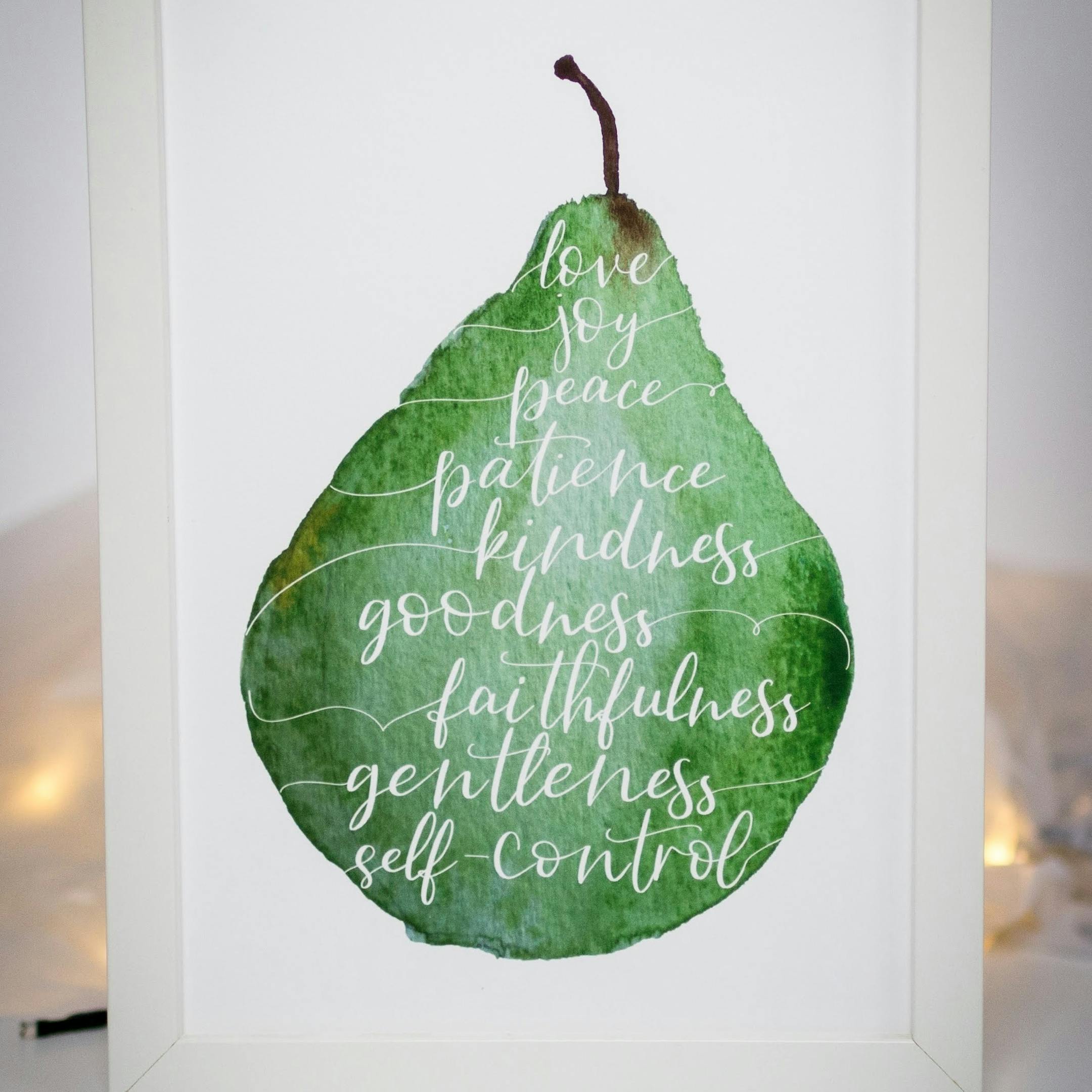 An A4 print of a watercolour green pear with the fruit of the spirit hand lettered in white. Ideal to to frame and decorate your own home or give as a gift.